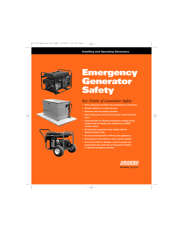 03-1183 Emerg Gen Broc NYSEG 12/19/03 11:27 PM Page 2 Installing and Operating Generators Emergency Generator Safety Key Points of Generator Safety • Read, understand and follow the manufacturer’s instructions. • Operate outdoors in a clean, dry area. • Generator must be properly grounded. • After losing power, turn off main breaker or pull main fuse block. • Generators that are directly connected to existing wiring systems must use double-pole, double-throw (DPDT) transfer switch. • All electrical connections must comply with the National Electric Code. • Do not overload generator with too many appliances. • Use properly sized extension cords in good condition. • You may be liable for damage or injury to people and property that may result from an improperly installed or operated emergency generator. 03-1183 Emerg Gen Broc NYSEG Emergency generator engines produce exhaust 12/19/03 11:27 PM Page 3 Before purchasing a natural gas-fired generator, you should contact NYSEG at 1.800.572.1111 to ensure that an elevated delivery pressure is available to your home or business. This is NOT available in all areas. This brochure is for our customers who already have, or who plan to buy, an emergency generator. A brief description of generator types and modes of operation is followed by a checklist of generator safety guidelines. The brochure also includes information on sizing a generator to best meet your specific needs. If an elevated delivery pressure is available, changes to your natural gas service may be required so that your generator operates properly. If so, additional NYSEG charges will apply. Also, you will need to purchase and install a pressure-reducing device for your other natural gas appliances. gases that contain carbon monoxide, a colorless, odorless and poisonous gas that can be deadly in high concentrations. Therefore, generators must be operated outdoors and away from any open windows or areas where harmful vapors may be trapped. Operate generators only in clean, dry, wellventilated areas. Wet or icy conditions create considerable electric shock hazards. You may be liable for damage or injury to your neighbors and to NYSEG workers and equipment that may result from an improperly installed or operated emergency generator. You may also be responsible for any injury or damage to your property. All specific questions about generators should be referred to a licensed electrician or your local building code enforcement office. We strongly urge you to consult an electrician prior to installing or operating your generator to ensure your safety and compliance with the National Electric Code. Overview If you plan on using an emergency generator, it is essential that you take precautions for your safety and for the safety of NYSEG people working to restore power. During power interruptions, properly sized and installed emergency generators can safely power electrical equipment such as portable heating units, computers, water pumps, milking machines, home freezers, refrigerators and lighting. However, emergency generators can be complicated and expensive. The key in selecting the proper generator is to evaluate what appliances you really need to power in an emergency. To be safe, read your owner’s manual carefully. Make sure you fully understand the proper installation and operating procedures for your unit – and don’t forget to use common sense. NYSEG requires that all natural gas-fired generators be inspected by a certified electrical inspection agency or local building code enforcement inspector. • PTO-driven generators use a power take-off (PTO) attachment on farm tractors or construction equipment such as bulldozers and front-end loaders. Generators usually supply either 120 volts or 240 volts, although some models can supply both. Generators have manual or automatic start systems. Manual starts are typical on smaller generators, while automatic starts are common on larger installations. The two safe modes for supplying power from an emergency generator are as an independent portable operation or an integrated system operation. Independent Generators In this case, the generator operates as an independent, stand-alone unit NOT connected to any existing wiring system. Extension cords are plugged into the generator to deliver power to selected electrical equipment and appliances. Typical setups can range from the small, lightweight, gasolinepowered units to very large, trailer-mounted, dieselpowered generators used in mining and construction. Extension Cord Safety Tips Generator Types Available as portable or stationary units, generators come in many sizes and configurations. However, generators must deliver power at the same voltage and frequency that NYSEG provides (120/240-volt, single-phase, 60-cycle alternating current). Generator capacity (size) is usually stated in watts or kilowatts. Generators have one of two drive systems: • Engine-driven generators are fueled by gasoline, diesel fuel, propane or natural gas. Factors such as availability, storage, volatility and safety should be considered for each fuel type. In general, smaller units (less than 7,000 watts) tend to be gasolinepowered, while the larger units usually run on diesel fuel, liquid propane or natural gas. NOTE: Many generators that are fueled by natural gas require a delivery pressure that’s greater than NYSEG’s standard pressure. If the generator is not supplied with the manufacturer’s suggested delivery pressure, the generator may not run. Specific jobs call for specific kinds of extension cords. Since small, independent portable generators rely so heavily on extension cords to distribute power from the generator to electrical equipment, it’s good to keep the following in mind: • Always use properly sized and grounded extension • • • • • • 2 cords. Check the Underwriters Laboratories (UL) label on the cord for capacity ratings. Only use heavy-duty, three-wire gro