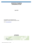 ESTHETICS TRAINING PROGRAM OUTLINE April 2010 This publication may be obtained from the Estheticians and Spa Therapists Association (E-SPA) Online: www.e-spabc.com Developed By Sage Transitions Esthetics Training Program Outline • April 2010 1 TABLE OF CONTENTS Section 1 – Occupational Analysis 1 Occupational Analysis Chart 2 Section 2 – Program Outline 8 Suggested Schedule of Time Allotment 9 Program Outline 15 Core Competencies 16 Level 1 66 Level 2 119 Section 3 – Training Provider Standards 189 Recommended Reference Textbooks 190 Websites 191 Training Provider Standards for Instructors 192 Tools and Equipment 193 Section 4 - Appendices 202 Appendix A: Science of esthetics cross-reference list 203 Appendix B: Molecule size chart for nail enhancements 204 Esthetics Training Training Provider Standards • April 2010 2 FOREWORD This program outline is for use in the esthetician training program and will be used as a guide for instructors in the classroom portions of this training. The esthetician program is delivered in a format which combines in-school-theory, practical and work-based training, all designed to meet the competency standards and profile defined by the industry. Practical demonstration and student participation should always be integrated with classroom sessions. Safe working practices, though not always specified in each of the competencies and learning tasks, are an implied part of the program and should be stressed throughout the training. This program outline includes a list of recommended reference resources that are available to support the learning objectives and the minimum practical requirements needed to support instruction. The esthetician program is designed to be modularized to allow students to take any combination of modules, or the full program and to allow schools to provide any combination of modules. There is some overlap between certain modules, so examinations should be provided in a way that tests all necessary skills with minimal overlap. Finally, this program requires knowledge about various branches of science for estheticians. Each module details science components integrated into the learning outcomes and objectives. Appendix A provides an outline of which specific science topics are necessary for the relevant modules. ACKNOWLEDGEMENTS The Program Outline was launched under the direction of Personal Services Industry Human Resources Committee (PSI-HR) with funding from the The Province of British Columbia via the Cosmetology Industry Association of British Columbia, and prepared by Sage Transitions with the assistance of the industry participants listed below. Industry Participants Paul Bousaleh – Suki’s Martin Constable – London School of Hairdressing Ruth Coogan – Hair Bin Louise Dannhauer – Spa Time Susan Belton Erkau Laura Gobbo – Fruition Day Spa Allison Hegedus – Vida Wellness Madeleine Jones – Madeleine’s Dee Lewis – Deeco Ida Marie Huska – Root’s Nanci Spencer – The Nail Scene Debra Tarvin Working group A working group contributed many hours to meetings and on-line review developing a program model and supporting the completion of the full program outline. Louise Dannhauer - Spa Time Laura Gobbo - Fruition Day Spa Dee Lewis - Deeco Debbie Nickel - Blanche MacDonald Nanci Spencer - The Nail Scene Debra Tarvin Industry Observers Cindy Bubb – Private Career Training Institutions Agency of BC (PCTIA) Kim Savage – Chair Neil Floyd – Service Canada Tom Newall – Industry Training Authority (ITA) Sage Transitions would like to acknowledge the dedication and hard work of the industry representatives appointed to identify the training requirements of the esthetics trade. Facilitators Heather Stewart – Project Manager, Sage Transitions Ian MacRae – Technical Writer & Research Consultant, Sage Transitions Lucy Griffith - Subject Matter Expert & Technical Writer SAFETY ADVISORY Please note that it is always the responsibility of any person using these materials to inform him/herself about the Occupational Health and Safety Regulations pertaining to his/her work. The references to the WorkSafeBC of British Columbia safety regulations contained within these materials do not/may not reflect the most recent Occupational Health and Safety Regulations. The current Standards and Regulations in BC can be obtained on the following website: http://www.worksafebc.com JOB DESCRIPTION ESTHETICIAN Workers in this unit group provide facial and body treatments designed to enhance an individual's physical appearance. They are employed in beauty spas/salons, electrolysis studios, scalp treatment and hair replacement clinics and other similar establishments and in cosmetic departments of retail establishments such as pharmacies and department stores, or they may be self-employed. The following is a summary of main duties for some occupations in this unit group: • • • • Estheticians give facial and other body treatments using specialized products and techniques. Cosmeticians advise customers on the use of make-up and other beauty products and apply make-up to customers; may specialize in applying makeup to models or other individuals for special occasions. Electrologists remove unwanted hair permanently from client's face or body using needle method only, specialized hair removal equipment, producing the art and science of electrolysis, thermolysis and blend methods Nail technicians clean, shape and apply lacquer to fingernails and toenails and provide related treatments. SECTION 1 OCCUPATIONAL ANALYSIS Esthetics Training Training Provider Standards • April 2010 1 ESTHETICS Technical Training Occupational Analysis Chart Core Competencies Describe safe beauty practices Describe safe and hygienic work environment Describe infection control Describe sanitation, cleaning and disinfection Describe glass and metal implements Describe bacteriology Describe diseases and disorders of the skin A A-1 A-2 A-3 A-4 A-5 A-6 Intro
