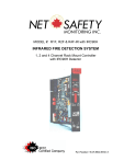 MODEL #: R1F, R2F & R4F-IR with IRC90H INFRARED FIRE DETECTION SYSTEM 1, 2 and 4 Channel Rack Mount Controller with IRC90H Detector Part Number: MAN-0024-00 Rev 3 Copyright © 2002 Net Safety Monitoring Inc. Printed in Canada This manual is provided for informational purposes only. Although the information contained in this manual is believed to be accurate, it could include technical inaccuracies or typographical errors. Changes are, therefore, periodically made to the information within this document and incorporated without notice into subsequent revisions of the manual. Net Safety Monitoring Inc. assumes no responsibility for any errors that may be contained within this manual. This manual is a guide for the use of a 1, 2 and 4 Channel Rack Mount Controller and the data and procedures contained within this document have been verified and are believed to be adequate for the intended use of the controller. If the controller or procedures are used for purposes other than as described in the manual without receiving prior confirmation of validity or suitability, Net Safety Monitoring Inc. does not guarantee the results and assumes no obligation or liability. No part of this manual may be copied, disseminated or distributed without the express written consent of Net Safety Monitoring Inc. Net Safety Monitoring Inc. products, are carefully designed and manufactured from high quality components and can be expected to provide many years of trouble free service. Each product is thoroughly tested, inspected and calibrated prior to shipment. Failures can occur which are beyond the control of the manufacturer. Failures can be minimized by adhering to the operating and maintenance instructions herein. Where the absolute greatest of reliability is required, redundancy should be designed into the system. Net Safety Monitoring Inc., warrants its sensors and detectors against defective parts and workmanship for a period of 24 months from date of purchase and other electronic assemblies for 36 months from date of purchase. No other warranties or liability, expressed or implied, will be honoured by Net Safety Monitoring INC Contact Net Safety Monitoring Inc. or an authorized distributor for details. Table of Contents Unit I GENERAL INFORMATION . . . . . . . . . . . . . . . . . . . . . . . . . . . . . . . . . . . 1 DESCRIPTION . . . . . . . . . . . . . . . . . . . . . . . . . . . . . . . . . . . . . . . . . . . . . . . . . . . . . . . . . . . . . . . . FEATURES . . . . . . . . . . . . . . . . . . . . . . . . . . . . . . . . . . . . . . . . . . . . . . . . . . . . . . . . . . . . . . . . . . CONTROLLER SPECIFICATIONS . . . . . . . . . . . . . . . . . . . . . . . . . . . . . . . . . . . . . . . . . . . . . . . . Figure 1 - Controller Dimensions . . . . . . . . . . . . . . . . . . . . . . . . . . . . . . . . . . . . . . . . . . . . DETECTOR SPECIFICATIONS . . . . . . . . . . . . . . . . . . . . . . . . . . . . . . . . . . . . . . . . . . . . . . . . . . . Figure 2a - Swivel Mount Dimension . . . . . . . . . . . . . . . . . . . . . . . . . . . . . . . . . . . . . . . . . Figure 2b - Detector Dimensions . . . . . . . . . . . . . . . . . . . . . . . . . . . . . . . . . . . . . . . . . . . . Figure 3 - Controller Face-Plate . . . . . . . . . . . . . . . . . . . . . . . . . . . . . . . . . . . . . . . . . . . . . . . . . . . . . . BASIC OPERATION - CONTROLLER . . . . . . . . . . . . . . . . . . . . . . . . . . . . . . . . . . . . . . . . . . . . . . CONTROLLER FACEPLATE DESCRIPTION . . . . . . . . . . . . . . . . . . . . . . . . . . . . . . . . . OUTPUTS . . . . . . . . . . . . . . . . . . . . . . . . . . . . . . . . . . . . . . . . . . . . . . . . . . . . . . . . . . . . . Table 1 - Selectable Output Options . . . . . . . . . . . . . . . . . . . . . . . . . . . . . . . . . . . . . . . . . Figure 4 - Jumper Selections for Isolated or Non-isolated Current Outputs . . . . . . . . . . . PROGRAMMING OPTIONS . . . . . . . . . . . . . . . . . . . . . . . . . . . . . . . . . . . . . . . . . . . . . . . EXTERNAL RESET . . . . . . . . . . . . . . . . . . . . . . . . . . . . . . . . . . . . . . . . . . . . . . . . . . . . . AUTOMATIC DIAGNOSTICS AND FAULT IDENTIFICATION . . . . . . . . . . . . . . . . . . . . . VOTING LOGIC (not applicable to R1F) . . . . . . . . . . . . . . . . . . . . . . . . . . . . . . . . . . . . . . DETECTOR . . . . . . . . . . . . . . . . . . . . . . . . . . . . . . . . . . . . . . . . . . . . . . . . . . . . . . . . . . . . . . . . . . 1 1 1 2 2 3 3 4 4 4 4 5 5 5 6 6 6 6 Unit II IR FIRE DETECTION . . . . . . . . . . . . . . . . . . . . . . . . . . . . . . . . . . . . . . . 7 SYSTEM APPLICATION . . . . . . . . . . . . . . . . . . . . . . . . . . . . . . . . . . . . . . . . . . . . . . . . . . . . . . . . DETECTOR SENSITIVITY . . . . . . . . . . . . . . . . . . . . . . . . . . . . . . . . . . . . . . . . . . . . . . . . . . . . . . . SPECTRAL SENSITIVITY RANGE . . . . . . . . . . . . . . . . . . . . . . . . . . . . . . . . . . . . . . . . . CONE OF VISION . . . . . . . . . . . . . . . . . . . . . . . . . . . . . . . . . . . . . . . . . . . . . . . . . . . . . . . Figure 6 - Detector Cone of Vision . . . . . . . . . . . . . . . . . . . . . . . . . . . . . . . . . . . . . . . . . . SYSTEM SENSITIVITY . . . . . . . . . . . . . . . . . . . . . . . . . . . . . . . . . . . . . . . . . . . . . . . . . . . . . . . . . 7 7 7 8 8 8 Unit III SYSTEM INSTALLATION . . . . . . . . . . . . . . . . . . . . . . . . . . . . . . . . . . . 8 INSTALLATION . . . . . . . . . . . . . . . . . . . . . . . . . . . . . . . . . . . . . . . . . . . . . . . . . . . . . . . . . . . . . . . 8 GENERAL WIRING REQUIREMENTS . . . . . . . . . . . . . . . . . . . . . . . . . . . . . . . . . . . . . . . 8 CONTROLLER WIRING . . . . . . . . . . . . . . . . . . . . . . . . . . . . . . . . . . . . . . . . . . . . . . . . . . 9 Figure 7a - Wiring for R1F - IR with Non-Isolated Current Output . . . . . . . . . . . . . . . . . 10 Figure 7b - Wir