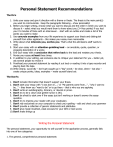 Personal Statement Recommendations The Do's 1. Unite your essay and give it direction with a theme or thesis. The thesis is the main point(s) you want to communicate. Keep the paragraphs following – show personality! 2. Before you begin writing, choose what you want to discuss and the order in which you want to discuss it – select what you would want them to know about you (3-4 key points) if you had your 15 minutes of fame with an interviewer - start with an outline and create a list of the points you want to make 3. Use concrete examples from your life experience to support your thesis and distinguish yourself from other applicants – this makes your essay more memorable 4. Write about what interests you, excites you. That's what the admissions staff wants to read. 5. Start your essay with an attention-grabbing lead -- an anecdote, quote, question, or engaging description of a scene. 6. End your essay with a conclusion that refers back to the lead and restates your thesis. 7. Revise your essay at least three times. 8. In addition to your editing, ask someone else to critique your statement for you – better yet, ask several people to review it 9. Proofread your personal statement by reading it out loud or reading it into a tape recorder and playing back the tape. 10. Write clearly, succinctly – don’t get caught up in “big” words – be clear, direct – but also – create unique points, ideas, examples – make yourself stand out The Don'ts 1. Don't include information that doesn't support your thesis. 2. Don't start your essay with "I was born in...," or "My parents came from..." , “why I want to be…” – they know you “want to be” or to go there – that is why you are applying 3. Don't write an autobiography, itinerary, or résumé in prose. 4. Don't try to be a clown (but gentle humor is OK). 5. Don't be afraid to start over if the essay just isn't working or doesn't answer the essay question. 6. Don't try to impress your reader with your vocabulary. 7. Don't rely exclusively on your computer to check your spelling – edit and check your grammer 8. Don't provide a collection of generic statements and platitudes. 9. Don't give mealy-mouthed, weak excuses for your GPA or test scores 10. Don’t make things up Writing the Personal Statement The personal statement, your opportunity to sell yourself in the application process, generally falls into one of two categories: 1. The general, comprehensive personal statement: This allows you maximum freedom in terms of what you write and is the type of statement often prepared for standard medical or law school application forms. 2. The response to very specific questions: Often, business and graduate school applications ask specific questions, and your statement should respond specifically to the question being asked. Some business school applications favor multiple essays, typically asking for responses to three or more questions. Content Suggestions Personal Background: What makes you the individual you are – sets you apart? What are significant experiences, events or relationships that reveal something about you, your value system, and the challenges you face Development of your interest: How did your interest in this program/career develop Related experiences: Describe experiences that helped you explore your career interests – relate a specific event, story, experience to this – express the insight you gained from these – let your passion and personality come through Future Goals: What are thy – ideals, objectives – what situations and career settings do you see yourself working in – Obstacles and inconsistencies – Be open about obstacles you have encountered and overcome – (family, illness, tragedy, workload, stumbling blocks). If there are inconsistencies in your academic performance – this is the time to BRIEFLY explain these – be factual, positive and non-defensive or apologetic – do not make excuses Questions to ask yourself before you write • • • • • • • • What's special, unique, distinctive, and/or impressive about you or your life story? What details of your life (personal or family problems, history, people or events that have shaped you or influenced your goals) might help the committee better understand you or help set you apart from other applicants? When did you become interested in this field and what have you learned about it (and about yourself) that has further stimulated your interest and reinforced your conviction that you are well suited to this field? What insights have you gained? How have you learned about this field--through classes, readings, seminars, work or other experiences, or conversations with people already in the field? If you have worked a lot during your college years, what have you learned (leadership or managerial skills, for example), and how has that work contributed to your growth? What are your career goals? Are there any gaps or discrepancies in your academic record that you should explain (great grades but mediocre LSAT or GRE scores, for example, or a distinct upward pattern to your GPA if it was only average in the beginning)? Have you had to overcome any unusual obstacles or hardships (for example, economic, familial, or physical) in your life? • • • • What personal characteristics (for example. integrity. compassion. persistence) do you possess that would improve your prospects for success in the field or profession? Is there a way to demonstrate or document that you have these characteristics? What skills (for example, leadership, communicative, analytical) do you possess? Why might you be a stronger candidate for graduate school--and more successful and effective in the profession or field than other applicants? What are the most compelling reasons you can give for the admissions committee to be interested in you? General advice Answer the questions that are asked • • If you are applying to several schools, you 