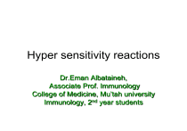 Hyper sensitivity reactions Dr.Eman Albataineh, Associate Prof. Immunology College of Medicine, Mu’tah university Immunology, 2nd year students • Adaptive immunity serves the important function of host defense against microbial infections, but immune responses are also capable of causing tissue injury and disease. Disorders caused by immune responses are called hypersensitivity diseases • Normally, immune responses eradicate infecting organisms without serious injury to host tissues. However, these responses are sometimes inadequately controlled, inappropriately targeted to host tissues, or triggered by commensal microorganisms or environmental antigens that are usually harmless Table 5 - Comparison of Different Types of hypersensitivity characteristics type-I )anaphylactic( type-II )cytotoxic( type-III )immune complex( type-IV )delayed type( antibody IgE IgG, IgM IgG, IgM None antigen exogenous cell surface soluble tissues & organs response time minutes30-15 minutes-hours hrs 2- hours 12-3 hours 72-48 erythema and edema, necrosis erythema and induration appearance weal & flare lysis and necrosis histology basophils and eosinophil antibody and complement complement and neutrophils monocytes and lymphocytes transferred with antibody antibody antibody T-cells allergic asthma, hay fever erythroblastosi s fetalis, Goodpasture's nephritis SLE, farmer's lung disease tuberculin test, poison ivy, granuloma examples Types of hypersensitivity reactions • Type I reactions (i.e., immediate hypersensitivity reactions, allergy) :Involves immunoglobulin E (IgE)–mediated release of histamine and other mediators from mast cells and basophils against foreign environmental proteins (pollens, animal danders - – وبرand house mites-)سوس. • Type II reactions (i.e., antibody- mediated hypersensitivity reactions) : Involves IgG or IgM antibodies bound to surface antigens on own cells of the body (autoimmune) or to foreign antigen, with subsequent complement- mediated lysis (autoimmune hemolytic anemia). • Type III reactions (i.e., immune-complex reactions) : Involves circulating antigen-antibody immune complexes that deposit, with subsequent attraction of polymorphs causing local inflammation and tissue damage ( SLE, chronic glomerulonephritis, serum sickness). • Type IV reactions (i.e., delayed hypersensitivity reactions (DTH), cell-mediated immunity) : They are mediated by TH1 cells following 2nd contact to same Ag which secrete inflammatory cytokines that attract macrophages which release inflammatory mediators. Or by TH2 cell activation and eosinophils activation in chronic asthma. Type 1 hypersensitivity reaction Allergy or atopy • The allergic reaction first requires sensitization to the specific allergen and occurs in geneto-environmental factors predisposed individuals (those having certain MHC haplotype). The allergen is either inhaled or ingested and is then processed by the dendritic cell, an APC. The antigen-presenting cells then migrate to lymph nodes, where they prime naive TH cells (TH0 cells) to be TH2. • These primed TH2 cells then bind B cells and release more IL-4, IL-5 and IL-13. these cytokines then act on B cells to promote production of antigen-specific IgE antibodies. • , The B cell must also bind to the TH2 cell by binding the CD40 expressed on its surface to the CD40 ligand on the surface of the TH2 cell. • IgE antibodies can then bind to high-affinity receptors (FcεR1) located on the surfaces of mast cells and basophils(sensitization phase). • Reexposure to the antigen can then result in the antigen binding to and cross-linking the bound IgE antibodies on the mast cells and basophils (effector or symptomatic phase). Cross linking is the binding of 2 IGE with one allergen • This causes the release and formation of chemical mediators from these cells. These mediators include preformed mediators, newly synthesized mediators, and cytokines. Effecter phase The major mediators released from mast cellsand their functions are described as follows Preformed mediators (important for early phase reaction with in 5 min.): • Histamine: biogenic amines, short acting, This mediator acts on histamine 1 (H1) and histamine 2 (H2) receptors to cause contraction of smooth muscles of the airway and GI tract, increased vasopermeability and vasodilation, enhanced mucus production, pruritus (itching) , cutaneous vasodilation, and gastric acid secretion. different • cell types express distinct classes of histamine receptors (e.g., H1, H2, H3) • H1 receptor antagonists (commonly called antihistamines) can inhibit the wheal-and-flare response • Tryptase : serine proteases,Tryptase is a major protease released by mast cells; its exact role is uncertain, • Proteoglycans : Proteoglycans include heparin. the proteoglycans may control the kinetics of immediate hypersensitivity reactions • Mast cell activation results in the rapid de novo synthesis and release of lipid mediators that have a variety of effects on blood vessels, bronchial smooth muscle, and leukocytes. • Lipid metabolites – Leukotrienes cause prolonged bronchoconstriction – Platelet-activating factor (PAF): Adenosine: Bradykinin (all function as histamine) It increases vascular permeability, causes bronchoconstriction, and causes chemotaxis and degranulation of eosinophils and neutrophils. – prostaglandin D2 (PGD2). Released PGD2 binds to receptors on smooth muscle cells and acts as a vasodilator and a bronchoconstrictor late phase reaction • The immediate wheal-and-flare reaction is followed 2 to 4 hours later by a late-phase reaction consisting of the accumulation of inflammatory leukocytes, including neutrophils,eosinophils, basophils, and helper T cells • Cytokines produced by TH2 cells promote the activation of eosinophils and their recruitment to late-phase reaction inflammatory sites • IL-4: Stimulates and maintains TH2 cell proliferation and switches B cells to IgE synthesis. • IL-