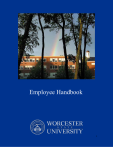 Employee Handbook 1 Worcester State University Employee Handbook (Revised August 2017) Table of Contents Worcester State University Employee Handbook............................................................................................................... 3 SECTION 1: WELCOME .................................................................................................................................................... 4 Message from the University President ................................................................................................................................. 4 Purpose of the Handbook ....................................................................................................................................................... 5 Worcester State University History ....................................................................................................................................... 8 Worcester State University’s Early Years.............................................................................................................................. 8 Becoming Worcester State Teachers College ........................................................................................................................ 8 Transition to a Liberal Arts and Sciences College ................................................................................................................. 8 Recognition as a State University .......................................................................................................................................... 8 Worcester State University Administration ........................................................................................................................... 9 SECTION 3: EMPLOYEE CATEGORIES ...................................................................................................................... 10 Benefitted Employees .......................................................................................................................................................... 10 Contracted Employees & Adjunct Faculty........................................................................................................................... 11 Student Employees ............................................................................................................................................................... 11 SECTION 4: ......................................................................................................................................................................... 12 Accommodations for Persons with Disabilities ................................................................................................................... 12 Age Discrimination .............................................................................................................................................................. 12 Campaign and Political Activities........................................................................................................................................ 12 Children in the Workplace ................................................................................................................................................... 13 Conflict of Interest and Financial Disclosure....................................................................................................................... 13 Consensual Relationships .................................................................................................................................................... 13 Faculty/Administrator/Staff Member Relationships with Students ..................................................................................... 13 Relationships between Supervisors and Subordinates or Between Co-Workers ................................................................. 14 Drug Policy for a Drug Free Workplace .............................................................................................................................. 14 Policy Statement of Non-Discrimination and Diversity (Statewide) ................................................................................... 15 Policy Against Discrimination, Discriminatory Harassment, and Retaliation (Statewide) .................................................. 16 Prohibited Conduct .......................................................................................................................................................... 16 Examples of discriminatory harassment, all of which are prohibited by this Policy, include, but are not limited to: ..... 17 Sexual Violence Policy (Statewide) ..................................................................................................................................... 18 Duty to Report Discrimination, Discriminatory Harassment, or Retaliation ................................................................... 21 3 To Report Fraud, Waste, or Abuse....................................................................................................................................... 22 Network Acceptable Use ..................................................................................................................................................... 22 Pets in the Workplace .......................................................................................................................................................... 24 Religious Observances ......................................................................................................................................................... 24 Right to Know ...................................................................................................................................................................... 24 Smoke-Free Workplace Policy .......