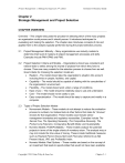 Project Management: A Managerial Approach, 9th edition Instructor’s Resource Guide Chapter 2 Strategic Management and Project Selection CHAPTER OVERVIEW Overview – This chapter discusses the process for selecting which of the many projects an organization could pursue and it should pursue. It introduces techniques for evaluating and making the selection. The chapter also introduces concepts of risk and applies them to the analysis typically performed during the project selection process. 2.1 Project Management Maturity – Many organizations use maturity models to determine their level of mastery of project management processes and skills. Examples include PMI-OPM3 and PM3. 2.2 Project Selection Criteria and Models – Organizations should use consistent and rational tools to select among the myriad of projects from which they have to choose. There are many models for the selection process to choose from as well. Good criteria for choosing the selection model are: Realism – The model should take the organization’s situation into account including limits on people, facilities, and capital. Capability – The model should be capable of dealing with the complexities of the organization’s environment. Flexibility – The model should work under a range of conditions. Ease of use – The model should be relatively easy to use and understand. Cost – The model should not be costly to use. Easy computerization – The model should be easy to capture and modify in a computer. 2.3 Types of Project Selection Models Nonnumeric Models – These models do not attempt to reduce the evaluation process to numbers, but instead look at other factors that make for “obvious” choices for that organization. These models could include senior management mandates and regulatory necessities. Examples include The Sacred Cow, The Operating Necessity, The Competitive Necessity, The Product Line Extension, Comparative Benefit Model, and Sustainability. Numeric Models: Profit/Profitability – These models analyze the potential projects in terms of the single criteria of monetary return. The analysis may or may not include the time value of money. These include traditional measures such as Payback Period, Discounted Cash Flow (also referred to as Net Present Value), IRR, and Profitability Index. Numeric Models: Real Options – These models are based on the concept of an investment that leads to opportunities that would not have been available Copyright ©2015 John Wiley & Sons, Inc. Chapter 2 - 1 Project Management: A Managerial Approach, 9th edition Instructor’s Resource Guide otherwise. This model chooses investments that may not be profitable or beneficial in the near future, but will lead to options for the future with a great promise. Numeric Models: Scoring – These models analyze the potential projects based on multiple criteria the organization selects. The models use numeric scales to rate the projects against the desired criteria. Then the ratings can be analyzed using various techniques to determine the best choices. Examples include Unweighted 0-1 Factor Model, Unweighted Factor Scoring Model, Weighted Factor Scoring Model, and Window of Opportunity Analysis. Numeric Models: Window-of-Opportunity Analysis – This model attempts to determine the cost, timing, and performance specifications of a new technology to understand whether it qualifies as useful and economic. Having thus estimated the economic impact of the innovation, the decision of whether or not to undertake the development project is much simpler. Numeric Models: Discovery-Driven Planning – Similar to window of opportunity analysis model, this model funds a portion of the project and tries to determine two important aspects about the project: the critical assumptions and the cost of testing each assumption. Analyzing the assumptions enables the management team to find out if a project continues to be as promising as was believed or a change of strategy is required. Choosing a Project Selection Model – The authors strongly favor using weighted scoring models. 2.4 Risk Considerations in Project Selection – The text distinguishes between risk and uncertainty. Risk applies to events that have a known (or estimated) probability of occurrence. Uncertainty applies to events where there is insufficient data to estimate the probability of occurrence. For effective project management, decisions should be treated as risks rather than uncertainties. That is probabilities of occurrence, if not otherwise known, should be estimated for relevant issues and events. 2.5 Project Portfolio Management (PPM) – Project Portfolio Management is used to consistently and transparently select projects that match the organization’s goals. The process has eight steps: Step 1: Establish a Project Council – The council is established to articulate strategic direction and allocate funds to projects it selects. Step 2: Identify Project Categories and Criteria – Categories are established by the Council to ensure that a variety of projects are pursued. Criteria for measuring prospective projects are established to form the framework for the selection process. Common categories used for classifying projects are: o Derivative projects – Projects that are only incrementally different from previous efforts. o Platform projects – Projects that impact organization outputs or the processes that create them. Copyright ©2015 John Wiley & Sons, Inc. Chapter 2 - 2 Project Management: A Managerial Approach, 9th edition Instructor’s Resource Guide Breakthrough projects – Projects that involve implementing new, sometimes “disruptive” technology. o R&D projects – Projects used to acquire new knowledge or create new technology. Step 3: Collect Project Data – Collect relevant data and assign scores to prospective projects. Step 4: Assess Resource Availability – Analyze the availability of resources to execute the prospective projects. Step 5: 