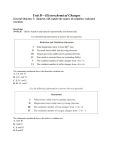 Unit B—Electrochemical Changes General Outcome 1: Students will explain the nature of oxidation–reduction reactions Knowledge 30–B1.1k - Define oxidation and reduction operationally and theoretically. The statements numbered above that describe oxidation are A. I, II, and VI B. I, IV, and VI C. II, IV, and V D. III, IV, and V The statements numbered above that refer to oxidation are A. I and III B. I and IV C. II and III D. II and IV In the reaction represented by the equation above, copper undergoes A. reduction only B. oxidation only C. both oxidation and reduction D. neither oxidation nor reduction Which of the following statements is an operational definition of the metal undergoing reduction? A. Iron metal undergoes a formation reaction with oxygen gas. B. Magnesium metal increases in mass when heated in air. C. Iron(III) hydroxide reacts with oxygen in the air to form ionic compounds. D. Zinc sulfide ore is roasted in the presence of oxygen gas to produce zinc metal. Knowledge 30–B1.2k - Define oxidizing agent, reducing agent, oxidation number, half-reaction, disproportionation. In the reaction represented by the equation above, oxygen acts as the i agent, and the oxidation number of the sulfur atom increases by ii . The statement above is completed by the information in row Row i ii oxidizing 2 A. oxidizing 6 B. C. reducing 2 D. reducing 6 Which of the following equations represents a disproportionation reaction? A. 2Na(s) + I2(s) → 2NaI(s) B. 2F2(g) + O2(g) → 2OF2(g) C. Cl2(aq) + H2O(l) → HOCl(aq) + H+(aq) + Cl–(aq) D. 2NH3(aq) + NaOCl(aq) → N2H4(aq) + NaCl(aq) + H2O(l) In the equation above, the species that undergoes disproportionation is A. Cl2(g) B. OH–(aq) C. OCl–(aq) D. H2O(l) During the reaction represented by equation II, nitrogen monoxide undergoes i and ii electrons. The statement above is completed by the information in row Row i ii disproportionation oxygen gains and A. loses disproportionation nitrogen gains and B. loses oxidation oxygen loses C. oxidation nitrogen loses D. Knowledge 30–B1.3k - Differentiate between redox reactions and other reactions, using half-reactions and/or oxidation numbers. Which of the following equations represents a redox reaction? A. NaOH(aq) + HNO3(aq) → NaNO3(aq) + H2O(l) B. 2AgNO3(aq) + Cu(s) → 2Ag(s) + Cu(NO3)2(aq) C. H2SO4(aq) + 2KOH(aq) → K2SO4(aq) + 2H2O(l) D. CaCl2(aq) + Ba(OH)2(aq) → Ca(OH)2(aq) + BaCl2(aq) Knowledge 30–B1.4k - Identify electron transfer, oxidizing agents and reducing agents in redox reactions that occur in everyday life, in both living systems (e.g., cellular respiration, photosynthesis) and nonliving systems; i.e., corrosion. During cellular respiration, the oxidizing agent is A. O2(g) B. CO2(g) C. H2O(l) D. C6H12O6(s) The metallurgical processes in which the metal loses electrons are A. I and II B. I and III C. II and IV D. III and IV Use the following information to answer the next question. During the operation of a car battery, which of the following observations can be made? A. The amount of Pb(s) increases as PbO2(s) is reduced. B. The amount of PbO2(s) increases as Pb(s) is reduced. C. The amount of PbO2(s) decreases as Pb(s) is oxidized. D. The amount of Pb(s) decreases as PbO2(s) is oxidized. The equations above that represent a reaction in which the metal is being oxidized are A. I and IV only B. II and III only C. I, III, and IV D. II, III, and V During the explosion of ammonium nitrate, hydrogen A. is oxidized B. loses electrons C. is the oxidizing agent D. has no change in oxidation number In this reaction, the reducing agent is A. FeCl2(aq) B. HCl(aq) C. H2(g) D. Fe(s) Which of the equations numbered above represents a reaction in which the metal is oxidized? A. I and II only B. I, II, and V C. I, IV, and V D. III and IV In the titration reaction, the reducing agent is i and ii atoms are reduced. The statement above is completed by the information in row Row i ii I2(aq) iodine A. I 2 (aq) sulfur B. S2O32– (aq) iodine C. S2O32– (aq) sulfur D. Compared with solid zinc, solid copper is a i reducing agent, and during the operation of this cell, the zinc electrode ii electrons. The statement above is completed by the information in row Row i ii weaker gains A. weaker loses B. C. stronger gains D. stronger loses Knowledge 30–B1.5k - Compare the relative strengths of oxidizing and reducing agents, using empirical data. When listed in order from strongest to weakest, the oxidizing agents are A. Ra(s), Be(s), V(s), Cd(s) B. Cd(s), V(s), Be(s), Ra(s) C. Ra2+(aq), Be2+(aq), V2+(aq), Cd2+(aq) D. Cd2+(aq), V2+(aq), Be2+(aq), Ra2+(aq) From the student’s data, the strongest reducing agent is A. M2+(aq) B. X–(aq) C. X2(aq) D. M(s) Which of the following substances is the strongest reducing agent? A. Pt(s) B. Rh(s) C. Sm(s) D. Te(s) The strongest oxidizing agent in the equations above is A. Co3+(aq) B. Ce3+(aq) C. Hg+(aq) D. Ce4+(aq) Knowledge 30–B1.6k - Predict the spontaneity of a redox reaction, based on standard reduction potentials, and compare the predictions to experimental results. Which of the following equations represents a spontaneous oxidation–reduction reaction? A. Ac(s) + 3Cs+(aq) → 3Cs(s) + Ac3+(aq) B. Cs(s) + Am4+(aq) → Am3+(aq) + Cs+(aq) C. 2Ac3+(aq) + 3Tl+(aq) → 3Tl3+(aq) + 2Ac(s) D. Tl3+(aq) + 2Am3+(aq) → 2Am4+(aq) + Tl+(aq) Which of the following actions could prevent the corrosion of the pipeline? A. Using a pipeline made of copper B. Using a pipeline made of chromium C. Connecting strips of lead to the pipeline at appropriate intervals D. Connecting strips of zinc to the pipeline at appropriate intervals A 1.0 mol/L solution of Ni(NO3)2(aq) could be stored in a container made of A. tin B. iron C. zinc D. chromium Which of the following equations represents a spontaneous reaction? A. Te+(aq) + Rh(s) → Te(s) + Rh+(aq) B. Sm2+(aq) + Pt(s) → Sm(s) + Pt2+(aq) C. Pt2+(aq) + 2Te(s) → Pt(s) + 2Te+(aq) D. Sm2+(aq) + 2Rh(s) → Sm(s) + 2Rh+