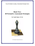 Focus On Student Learning - Instructional Strategies Series Book Two: 60 Formative Assessment Strategies By Natalie Regier, M. Ed. Image © Graphic Factory.com © 2012 Regier Educational Resources Focus on Student Learning - Instructional Strategies Series Table of Contents Note to Teachers Who is Natalie Regier? How does assessment fit into instruction? What is formative assessment? When are formative assessment strategies used? Why are formative assessment strategies used? How do I determine what types of formative assessment strategies to use? How can teachers use the assessment information? How can students use the assessment information? 4 4 4 5 5 5 6 6 6 FORMATIVE ASSESSMENT STRATEGIES FOR TEACHERS 7 7 7 7 8 8 9 9 9 9 9 10 10 10 10 10 11 11 11 12 12 12 12 13 13 13 13 14 14 14 1: ABC Brainstorming 2: Analogies 3: Checklists 4: Choral Response 5: Cloze Procedure 6: Concept Maps 7: Conferences 8: Computer Surveys 9: Demonstration Stations 10: Discussions 11: Double Entry Journals 12: Drawings 13: Email Questions 14: Examples/Non-Examples 15: Exit Cards 16: Fist of Five 17: Four Corners 18: Graffiti Wall 19: Graphic Organizers 20: Individual Whiteboards 21: Inside-Outside Circle 22: Learning Logs 23: List Ten Things 24: Matching Activities 25: Observations 26: One Minute Essays 27: One Minute Fluency 28: One Sentence Summaries 29: Open-Ended Questions 60 Formative Assessment Strategies Copyright © 2012 Regier Educational Resources. All Rights Reserved. 2 Focus on Student Learning - Instructional Strategies Series 30: Paper Pass 31: Peer-Assessments 32: Placemats 33: Problem Solving 34: Questionnaires 35: Questioning 36: Quick Writes 37: Reflection Journals 38: Repeat Pre-assessments 39: Response Cards 40: Self-Assessments 41: Sentence Prompts 42: Show of Hands 43: Student Composed Questions 44: Teach a Friend 45: Think-Pair-Share 46: Three Facts and a Fib 47: Three Minute Pause 48: Three Things 49: 3, 2, 1 50: Thumbs Up, Thumbs Down 51: Traffic Light 52: Turn and Talk 53: Whip Around 14 14 15 15 15 15 15 16 16 16 16 16 17 17 17 17 17 18 18 18 18 18 18 19 FORMATIVE ASSESSMENT STRATEGIES FOR STUDENTS 19 19 19 19 20 20 20 20 54: Ask 55: Checklists 56: Journals 57: Process Exemplars 58: Product Exemplars 59: Self-Marking Quizzes 60: Writing Continuums 60 Formative Assessment Strategies Copyright © 2012 Regier Educational Resources. All Rights Reserved. 3 Focus on Student Learning - Instructional Strategies Series Book Two: 60 Formative Assessment Strategies By: Natalie Regier Note to Teachers Focus on Student Learning is a series of teaching resources created to support teachers and save them time. Each booklet within the series takes one aspect of instruction and suggests multiple ways of using that instruction practice in the classroom. Book Two: 60 Formative Assessment Strategies provides teachers with a variety of strategies to gather information about their students during instruction. Who is Natalie Regier? First and foremost, I am a teacher. I have spent over 20 years in the classroom and have worked as a regular classroom teacher, a special educator, a vice principal and a learning coordinator. I have always been interested in finding ways to help students succeed in school. My search for knowledge to increase student learning has taken me to places like Edmonton, Boston, Orlando, and Las Vegas where I attended conferences and talked with educators from all over the world. As teachers, we all have one thing in common. We are searching for ways to help our students succeed in this ever-changing world. Helping every student in our classroom achieve is a challenge. I am continually searching for ways to support teachers with this challenge. I am also a writer. Over the years, I have written over 40 teaching resources for Davies and Johnson and Rainbow Horizons. I enjoy writing and especially enjoy writing for teachers. I know how hectic the life of a teacher is and that time is a precious commodity. I am now dedicating my time to searching for information and creating resources to support teachers in the classroom. There are many changes occurring in education and teachers need to keep up with new curriculums, research-based instructional practices, and ways to increase the achievement level of their students. The teaching resources I create support teachers in understanding and implementing the changes in our education systems. To learn more about my teaching resources, workshops, coaching and consulting visit my website at: www.regiereducationalresources.com Visit my blog at: blog.regiereducationalresources.com Let me know what type of resources I could offer that would support you in the classroom and save you time searching for ideas. Contact me at: natalie@regiereducationalresources.com How does assessment fit into instruction? Assessment and instruction go hand in hand in a classroom that focuses on the student. Teachers need to use a variety of different strategies to assess student readiness for a particular unit of study and to plan their instruction around the needs the students demonstrate. Ongoing assessment of student learning is an important part of the planning process. 60 Formative Assessment Strategies Copyright © 2012 Regier Educational Resources. All Rights Reserved. 4 Focus on Student Learning - Instructional Strategies Series There are three main types of assessment. They are pre-assessment, formative assessment, and summative assessment. This booklet focuses on strategies that teachers can use to formatively assess their students. Pre-assessment Formative Assessment Summative Assessment What is it? Assessment that is used Assessment that Assessment that shows to collect information gathers information what students have about students. about student learning. learned. When is it used? Before a lesson or new During a lesson or unit At the end of a lesson unit of study. of study. or unit of study. Why is it used? To determine the To track students’ readiness l