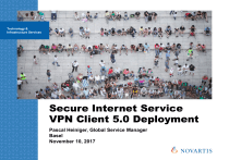 Technology & Infrastructure Services Secure Internet Service VPN Client 5.0 Deployment Pascal Heiniger, Global Service Manager Basel November 10, 2017 Aproach for VPN Client 5.0 [Build 02] deployment (Win7 & Win10 users) Scope: All Win 7 (Core 02.xx) & Win 10 (Core 06.xx) laptops (except NIBR) The VPN Client_5.0_L_EN_02 package we are deploying includes special functionalities: - To reduce the installation failure rate package only install if connected to Novartis network (Corp. LAN, GIM60 Wi-Fi). If VPN connection is recognize the installation will be postponed and SCCM will try to install the package again in next 24 hours. - To execute the package installation even for remote users we are able to overrule that check in our backend system at later stage. Clear and targeted Communication on deployment plan to end Users were created: - VPN User Guide and end user communication created in 9 different languages for Win7 users. - Internal support Web site of RAS CC team is available. http://vpdnupdate.novartis.net/rascc/ - VPN client 5.0 [Build 02] update for Windows 10 user are planned without enduser communincation. The deployment is planned in small waves with globally distributed users groups to balance the ServiceDesk workload in case of installation issues. Hypercare calls will be set up to identify issues related to the deployment and initiate the necessary actions with involvement of Service Desk and Regional IT teams. Business or Operating Unit/Franchise or Department 2 Business Use Only VPN Client 5.0 [Build 02] upgrade progress Win10 users Overview Windows 10 users Total Win10 users 14738 Total Win10 users to deploy 6031 Total Win10 users on latest version 8707 DEPLOYMENT VPN CLIENT V5 - WIN 10 Installations completed Installations pending 390 1684 W AVE 1 - INSTALL DATE: 09-OCT-17 802 W AVE 2 - INSTALL DATE: 09-OCT-17 W AVE 3 - INSTALL DATE: 24-OCT-17 1077 W AVE 4 - INSTALL DATE: 31-OCT-17 1070 W AVE 5 - INSTALL DATE: 07-NOV-17 W AVE 6 - INSTALL DATE: 14-NOV-17 41 130 154 202 251 243 19975 0 2434 2686 Business or Operating Unit/Franchise or Department 3 Business Use Only VPN Client 5.0 [Build 02] upgrade progress Win7 users Overview Windows 7 users Total Win7 users 75249 Total Win7 users to deploy 73919 Total Win7 users on latest version 1330 DEPLOYMENT VPN CLIENT V5 - WIN 7 Installations completed Installations pending Installation to complete Extended pilot W AVE 1 - INSTALL DATE: 31-OCT17 290 W AVE 2 - INSTALL DATE: 8-NOV17 W AVE 3 - INSTALL DATE: 14-NOV17 103 40 0 85 125 857 1000 Business or Operating Unit/Franchise or Department 4 Business Use Only Planning for VPN Client deployment Win7 & Win10 users Business or Operating Unit/Franchise or Department 5 Business 5 Business Use Only Use Only User distribution for VPN Client 5.0 [Build 02] deployment (Win7 & Win10 users) Win 10 Wave 1 Wave 2 Wave 3 Wave 4 Wave 5 Wave 6 Total in Wave 490 973 1433 1564 2708 2686 9854 Available Date 26-Sep-2017 27-Sep-2017 19-Oct-2017 26-Oct-2017 2-Nov-2017 9-Nov-2017 Win 7 Wave 1 Wave 2 Wave 3 Wave 4 Wave 5 Wave 6 Total in Wave 500 997 1000 2984 4000 4000 13481 Available Date 26-Oct-2017 1-Nov-2017 8-Nov-2017 Mandatory Date 9-Oct-2017 9-Oct-2017 24-Oct-2017 31-Oct-2017 7-Nov-2017 14-Nov-2017 Mandatory Date 31-Oct-2017 7-Nov-2017 14-Nov-2017 Week 48 Week 49 Week 50 Status Deployed Deployed Deployed Deployed Status Done on going EMEA 314 528 613 665 907 848 EMEA 237 295 437 1349 1742 2060 Business or Operating Unit/Franchise or Department 6 Business Use Only NA 50 137 310 419 369 417 NA 125 320 238 503 673 839 LA 50 60 166 162 207 203 LA 8 26 25 199 330 184 AP 76 248 344 318 454 439 Japan 0 0 0 0 112 118 AP 130 356 300 867 1216 677 Japan 0 0 0 66 39 240 Ticket Handling / Ticket Escalation • In case of issues with the VPN please assign the ticket to GL_ConnectivityServices-RAS using the RoD template “VPN_Client_Ticket_RASCC” with a comment in the summary „Deployment issue“ • Please check if you have access to the RoD template. If not please send an email to ras.connectivity@novartis.com with your RoD resolver group as information. Business or Operating Unit/Franchise or Department 7 Business Use Only Known Issue • After the installation of the VPN client 5.0 [Built 02] a reboot is required. Various issues occurred if not restarting the workstation. • What should be done in case of an Issue: – Reboot Workstation – Perform Topology update – Check SafeNet Token – Reinstall the VPN client via SCCM (Uninstall/Install) – Assign the RoD ticket to RASCC with a comment in the summary „Deployment issue“ using the template „VPN_CLIENT_TICKET_RASCC“ Business or Operating Unit/Franchise or Department 8 Business Use Only Homepage New RASCC Homepage is available and provide you the following information: • Detailed deployment plan • Troubelshooting information • Download section (user guides, Helpdesk guides, etc.) • FAQ (regularly updated) • Contact details http://vpdnupdate.novartis.net/rascc/ Business or Operating Unit/Franchise or Department 9 Business Use Only FAQ - 1 Can you explain the scope of that deployment? Every user using VPN and who has a laptop with Windows 7 and Windows 10 (excluded NIBR) is in scope. I have installed Windows 8.1 can I install the new VPN Client? No, the new VPN client is not qualified for Windows 8.1, please use the VPN Client_3.0_L_EN_02 or upgrade to Windows 10 Do you schedule the deployment by site and division? No we schedule the Deployment Waves global to have small number of updates per day, region and site to not create a high load of request at the Service Desks. Is it possible to install the VPN client out side the deployment? Yes the new VPN client is available for everyone (excluded NIBR) on the SCCM for Windows 7 and Windows 10. The package name is «VPN 5.0_L_EN_02». The VPN icon in the system tray changing the color, is that normal? Yes that is normal the new VPN client has an connection speed test integrated. Which will