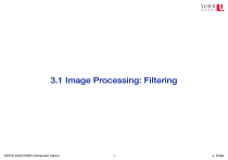 3.1 Image Processing: Filtering EECS 4422/5323 Computer Vision !1 J. Elder Image Processing vs Computer Vision ❖ What is the difference between image processing and computer vision? ❖ Image processing maps an image to a different version of the image. ❖ Computer vision maps one or more images to inferences about the visual scene. ❖ Image processing operations often required as pre-processing for computer vision algorithms. EECS 4422/5323 Computer Vision !2 J. Elder Outline ❖ Point Operators ❖ Linear Filters ❖ Nonlinear Filters EECS 4422/5323 Computer Vision !3 J. Elder Outline ❖ Point Operators ❖ Linear Filters ❖ Nonlinear Filters EECS 4422/5323 Computer Vision !4 J. Elder n output image. In the continuous domain, this can be denoted as 3.1.1 Pixel transforms Point Operators g(x) = h(f (x)) or g(x) = h(f (x), . . . , f (x)), (3.1) n A general image processing operator0 is a function that takes one or more input images and produces an output image. In the continuous domain, this can be denoted ❖ Image processing operators transform each pixel independently in the D-dimensional domain ofpoint the functions (usually D= 2 for images) andasthe of other pixels. and g operate over some range, can or either be=scalar or vector-valued, g(x) =which h(f (x)) g(x) h(f0 (x), . . . , fn (x)), e.g., (3.1) mages or 2D motion. For discrete (sampled) images, the domain consists of a finite idx ofrow where x x D-dimensional domain the idx functions (usually D = 2 for images) and the pixel locations, = the (i, j), and we cancol write ❖ or is in functions f and g operate over some range, which can either be scalar or vector-valued, e.g., = h(fFor (i,discrete j)). for color images org(i, 2D j) motion. (sampled) images, the domain(3.2) consists of a finite number of pixel locations, x = (i, j), and we can write shows how an image can be represented either by its color (appearance), as a grid , or3.1 as a two-dimensional function (surface plot). g(i, j) = h(f (i, j)). (3.2) point operator Point operators mmonly usedoutput point processes are multiplication and addition with a constant, image input image Figure 3.3 shows how an image can be represented either by its color (appearance), as a grid of numbers, or as ag(x) two-dimensional (surface plot). = af (x) +function b. (3.3) Two commonly used point processes are multiplication and addition with a constant, 45 bias 60 parameters; 98 127 132 133sometimes 137 133 45 60 98 127 eters a > 0 and b are often called the gain 45and these 60 98 127 132 133 137 133 46 =65af (x) 98 123 126 128 131 133 46 65 98 123 1 g(x) +(Figures b. (3.3) are said to control contrast and brightness, respectively 3.2b–c). The 46 65 98 123 126 128 131 133 103 103 160 160 140 140 132 133 137 133 120 120 100 126 128 131 133 47 65 96 115 119 123 135 137 47 65 96 115 119 123 135 137 65 96 115 119 123 135 137 The parameters a can > 0also andbeb summarized are often47called gain bias138parameters; sometimes 47 its 63the 107 and 113luminanance) 122 134 and range ge’s luminance characteristics by key91(average 47 63 these 91 107 113 122 138 134 47 63 91 107 113 122 138 134 daele, Deussen et al. 2007). 50 59 80 97 110 123 133 134 (Figures 3.2b–c). 50 59 1 80The 97 110 123 133 134 parameters are said to control contrast and brightness, respectively 50 59 80 97 110 123 133 134 49 53 68 83 97 113 128 133 49 53 68 83 97 113 128 133 1 An image’s luminance characteristics can also be summarized by its key (average luminanance) and range 49 53 68 83 97 113 128 133 50 50 58 70 84 102 116 126 50 50 58 70 84 102 116 126 (Kopf, Uyttendaele, Deussen et al. 2007). 50 50 58 70 84 102 116 126 50 50 52 58 69 86 101 120 50 50 52 58 69 86 101 120 50 50 52 58 69 86 101 120 (b) (a) (b) EECS 4422/5323 Computer Vision (c) (b) (c) !5 15 13 15 11 13 9 11 7 9 5 73 S2 S1 1 5 domain domain 3 domain S4 domain S3 0 S1 1 0 S6 20 S5 20 S2 40 S4 40 S3 60 S9 S8 S7 60 S6 80 S16 S15 S14 S13 S16 S12 S15 S11 S14 S10 S13 S9 S12 S8 S11 S7 S10 range 80 S5 100range (d)(c) (d) J. Elder g(i, j) = h(f (i, j)). (3.2) image can be represented either by its color (appearance), as a grid Examples dimensional function (surface plot). ❖ Contrast/brightness adjustment: point processes are multiplication and addition with a constant, g(x) = af (x) + b. (3.3) nd b are often called the gain and bias parameters; sometimes these Gain (contrast) Bias (brightness) ontrol contrast and brightness, respectively (Figures 3.2b–c).1 The haracteristics can also be summarized by its key (average luminanance) and range al. 2007). ❖ Inverse gamma - undo compressive gamma mapping applied in sensor so that pixel intensities are (approximately) proportional to the light irradiance at the sensor: g(x) = x γ (note that textbook Eqn. 3.7 has this backwards) EECS 4422/5323 Computer Vision !6 J. Elder finding such a mapping is the same one that people use to generate random samples from a probability density function, which is to first compute the cumulative distribution function shown in Figure 3.7c. Think of the original histogram h(I) as the distribution of grades in a class after some How can we map a particular grade to its corresponding percentile, so that students at most images areexam. not uniformly distributed across the gamut. the 75% percentile range scored better than 3/4 of their classmates? The answer is to integrate of these colours the todistribution be uniform called histogram equalization. h(I) tois obtain the cumulative distribution c(I), Histogram Equalization ❖ The colours in ❖ Redistribution Vision: Algorithms and Applications 3, 2010 draft) 108 Computer Computer Vision: Algorithms and(September Applications Computer Vision: Algorithms and Applications (September 3,(September 2010(September draft) 3, 20 108 Computer Vision: Algorithms and Applications I X c(I) = 6000 6000 6000 Frequency Input(a) Image (a) 250 250 250 Output Intensity 250 200 200 200 150 150 150 100 100 100 50 50 50 000 000 50 50 50 100 100 1