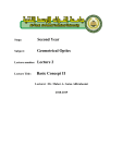 Stage: Second Year Subject: Geometrical Optics Lecture number: Lecture 2 Lecture Title: Basic Concept II Lecturer : Dr. Maher A. Gatea Alibraheemi 2018-2019 BASIC GEOMETRICAL OPTICS Basic Concepts I. THE LAWS OF REFLECTION AND REFRACTION We begin our study of basic geometrical optics by examining how light reflects and refracts at smooth, plane interfaces. Figure 3-1a shows ordinary reflection of light at a plane surface, and Figure 3-1b shows refraction of light at two successive plane surfaces. In each instance, light is pictured simply in terms of straight lines, which we refer to as light rays. (a) (b) Figure 3-1 Light rays undergoing reflection and refraction at plane surfaces After a study of how light reflects and refracts at plane surfaces, we extend our analysis to smooth, curved surfaces, thereby setting the stage for light interaction with mirrors and lenses— the basic elements in many optical systems. In this module, the analysis of how light interacts with plane and curved surfaces is carried out with light rays. A light ray is nothing more than an imaginary line directed along the path that the light follows. It is helpful to think of a light ray as a narrow pencil of light, very much like a narrow, well-defined laser beam. For example, earlier in this module, when you observed the passage of a laser beam in a fish tank and visually traced the path of the beam from reflection to reflection inside the tank, you were, in effect, looking at a “light ray” representation of light in the tank. A. Light rays and light waves Before we look more closely at the use of light rays in geometrical optics, we need to say a brief word about light waves and the geometrical connection between light rays and light waves. For most of us, wave motion is easily visualized in terms of water waves—such as those created on a quiet pond by a bobbing cork. See Figure 3-2a. The successive high points (crests) and low points (troughs) occur as a train of circular waves moving radially outward from the bobbing cork. Each of the circular waves represents a wave front. A wave front is defined here as a locus of points that connect identical wave displacements—that is, identical positions above or below the normal surface of the quiet pond. 77 FUNDAMENTALS OF PHOTONICS (a) Waves from a bobbing cork (b) Light rays and wave fronts (c) Changing wave fronts and bending light rays Figure 3-2 Waves and rays In Figure 3-2b, circular wave fronts are shown with radial lines drawn perpendicular to them along several directions. Each of the rays describes the motion of a restricted part of the wave front along a particular direction. Geometrically then, a ray is a line perpendicular to a series of successive wave fronts specifying the direction of energy flow in the wave. Figure 3-2c shows plane wave fronts of light bent by a lens into circular (spherical in three dimensions) wave fronts that then converge onto a focal point F. The same diagram shows the light rays corresponding to these wave fronts, bent by the lens to pass through the same focal point F. Figure 3-2c shows clearly the connection between actual waves and the rays used to represent them. In the study of geometrical optics, we find it acceptable to represent the interaction of light waves with plane and spherical surfaces—with mirrors and lenses—in terms of light rays. With the useful geometric construct of a light ray we can illustrate propagation, reflection, and refraction of light in clear, uncomplicated drawings. For example, in Figure 3-3a, the propagation of light from a “point source” is represented by equally spaced light rays emanating from the source. Each ray indicates the geometrical path along which the light moves as it leaves the source. Figure 3-3b shows the reflection of several light rays at a curved mirror surface, and Figure 3-3c shows the refraction of a single light ray passing through a prism. 78 BASIC GEOMETRICAL OPTICS (a) (b) (c) Figure 3-3 Typical light rays in (a) propagation, (b) reflection, and (c) refraction B. Reflection of light from optical surfaces When light is incident on an interface between two transparent optical media—such as between air and glass or between water and glass—four things can happen to the incident light. • It can be partly or totally reflected at the interface. • It can be scattered in random directions at the interface. • It can be partly transmitted via refraction at the interface and enter the second medium. • It can be partly absorbed in either medium. In our introductory study of geometrical optics we shall consider only smooth surfaces that give rise to specular (regular, geometric) reflections (Figure 3-4a) and ignore ragged, uneven surfaces that give rise to diffuse (irregular) reflections (Figure 3-4b). (a) Specular reflection (b) Diffuse reflection Figure 3-4 Specular and diffuse reflection In addition, we shall ignore absorption of light energy along the path of travel, even though absorption is an important consideration when percentage of light transmitted from source to receiver is a factor of concern in optical systems. 79 FUNDAMENTALS OF PHOTONICS 1. The law of reflection: plane surface. When light reflects from a plane surface as shown in Figure 3-5, the angle that the reflected ray makes with the normal (line perpendicular to the surface) at the point of incidence is always equal to the angle the incident ray makes with the same normal. Note carefully that the incident ray, reflected ray, and normal always lie in the same plane. Figure 3-5 Law of reflection: Angle B equals angle A. The geometry of Figure 3-5 reminds us that reflection of light rays from a plane, smooth surface is like the geometry of pool shots “banked” along the wall of a billiard table. With the law of reflection in mind, we can see that, for the specular reflection shown earlier in Figure 3-4a, each of the incident, parallel rays reflects off the surface at the same angle, th