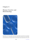 Chapter 8 Human Genetics and Biotechnology Biotechnology. Gene Therapy. Reality or fiction? During your lifetime, gene therapy may be mainstream medicine. Here we see a representation of the insertion of DNA into the nucleus of a cell. Is this possible? Yes. In this chapter, you will learn how human chromosomes and genes are inherited and how they control the traits that make each of us unique, how they can cause disease, and how those diseases can be treated. 183 www.ck12.org 8.1 Human Chromosomes and Genes Lesson Objective • Define the human genome. • Describe human chromosomes and genes. • Explain linkage and linkage maps. Vocabulary • • • • • • • • autosome human genome Human Genome Project linkage map linked genes sex chromosome sex-linked gene X-linked gene Introduction Nobody else in the world is exactly like you. What makes you different from everyone else? Genes have a lot to do with it. Unless you have an identical twin, no one else on Earth has exactly the same genes as you. What about identical twins? Are they identical in every way? They develop from the same fertilized egg, so they have all same genes, but even they are not completely identical. Why? The environment also influences human characteristics, and no two people have exactly the same environment. The Human Genome All the DNA of the human species makes up the human genome. This DNA consists of about 3 billion base pairs and is divided into thousands of genes on 23 pairs of chromosomes. The human genome also includes noncoding sequences of DNA, as shown in Figure 8.1. Thanks to the Human Genome Project, scientists now know the DNA sequence of the entire human genome. The Human Genome Project is an international project that includes scientists from around the world. It began in 1990, and by 2003, scientists had sequenced all 3 billion base pairs of human DNA. Now they are trying to identify all the genes in the sequence. You can watch a video about the Human Genome Project and how it cracked the code of life at this link: http://www.pbs.org/wgbh/nova/genome/program.html. Our Molecular Selves video discusses the human genome, and is available at http://www.genome.gov/ 25520211 or http://www.youtube.com/watch?v=XuUpnAz5y1g&feature=related. Chromosomes and Genes Each species has a characteristic number of chromosomes. The human species is characterized by 23 pairs of chromosomes, as shown in Figure 8.3 and Figure 8.4. You can watch a short animation about human chromosomes at this link: http://www.dnalc.org/view/15520-DNA-is-organized-into-46-chromosomes-includingwww.ck12.org 184 Figure 8.1: Human Genome, Chromosomes, and Genes. Each chromosome of the human genome contains many genes as well as noncoding intergenic (between genes) regions. Each pair of chromosomes is shown here in a different color. Figure 8.2: (Watch Youtube Video) http://www.ck12.org/flexbook/embed/view/139 185 www.ck12.org html. Figure 8.3: Human Chromosomes. Human chromosomes are shown here arranged by size. Chromosome 1 is the largest, and chromosome 22 is the smallest. All normal human cells (except gametes) have two of each chromosome, for a total of 46 chromosomes per cell. Only one of each pair is shown here. Figure 8.4: Human Chromosomes. Humans have 23 pairs of chromosomes. Pairs 1-22 are autosomes. Females have two X chromosomes, and males have an X and a Y chromosome. www.ck12.org 186 Autosomes Of the 23 pairs of human chromosomes, 22 pairs are autosomes (numbers 1–22 in Figure 8.4). Autosomes are chromosomes that contain genes for characteristics that are unrelated to sex. These chromosomes are the same in males and females. The great majority of human genes are located on autosomes. At the link below, you can click on any human chromosome to see which traits its genes control. http: //www.ornl.gov/sci/techresources/Human_Genome/posters/chromosome/chooser.shtml Sex Chromosomes The remaining pair of human chromosomes consists of the sex chromosomes, X and Y. Females have two X chromosomes, and males have one X and one Y chromosome. In females, one of the X chromosomes in each cell is inactivated and known as a Barr body. This ensures that females, like males, have only one functioning copy of the X chromosome in each cell. As you can see from Figure 8.3 and Figure 8.4, the X chromosome is much larger than the Y chromosome. The X chromosome has about 2,000 genes, whereas the Y chromosome has fewer than 100, none of which are essential to survival. Virtually all of the X chromosome genes are unrelated to sex. Only the Y chromosome contains genes that determine sex. A single Y chromosome gene, called SRY (which stands for sex-determining region Y gene), triggers an embryo to develop into a male. Without a Y chromosome, an individual develops into a female, so you can think of female as the default sex of the human species. Can you think of a reason why the Y chromosome is so much smaller than the X chromosome? At the link that follows, you can watch an animation that explains why: http://www.hhmi.org/biointeractive/gender/Y_evolution.html. Human Genes Humans have an estimated 20,000 to 22,000 genes. This may sound like a lot, but it really isn’t. Far simpler species have almost as many genes as humans. However, human cells use splicing and other processes to make multiple proteins from the instructions encoded in a single gene. Of the 3 billion base pairs in the human genome, only about 25 percent make up genes and their regulatory elements. The functions of many of the other base pairs are still unclear. To learn more about the coding and noncoding sequences of human DNA, watch the animation at this link: http://www.hhmi.org/biointeractive/dna/DNAi_ coding_sequences.html. The majority of human genes have two or more possible alleles. Differences in alleles account for the considerable genetic variation among people. In fact, most human genetic variation is the result of differences in individual DNA bases within all
