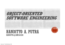 OBJECT-ORIENTED SOFTWARE ENGINEERING HANDITYO A. PUTRA HANDITYO@KMU.AC.KR Source: The McGraw-Hill Maximum absent by school rule is 25%, for this class maximum absent is 4, If you are absent 5 times or more, you will fail the class. If you are late, you may want to come to me after the class to check your attendance. Attendance : 20% Exercise and Quiz : 20% Mid-term Exam : 30% Final exam or project presentation : 30% Online courses and tutorials Book “Object-Oriented Software Engineering”, Stephen R. Schach, McGraw-Hill COURSE OVERVIEW Part 1: Introduction to Object-Oriented Software Engineering 1. 2. 3. 4. 5. 6. 7. 8. 9. The Scope of Object-Oriented Software Engineering Software Life-Cycle Models The Software Process Teams The Tools of the Trade Testing From Modules to Objects Reusability and Portability Planning and Estimating COURSE OVERVIEW Part 2 10. 11. 12. 13. 14. 15. The Requirements Workflow The Analysis Workflow The Design Workflow The Implementation Workflow Post-delivery Maintenance More on UML COURSE OVERVIEW Part 1: Introduction to Object-Oriented Software Engineering 1. 2. 3. 4. 5. 6. 7. 8. 9. The Scope of Object-Oriented Software Engineering Software Life-Cycle Models The Software Process Teams The Tools of the Trade Testing From Modules to Objects Reusability and Portability Planning and Estimating Define what is meant by object-oriented software engineering. Explain why the object-oriented paradigm is now so widely accepted. Discuss the implications of the various aspects of software engineering. Describe the modern view of maintenance. Discuss the importance of continual planning, testing, and documentation. Appreciate the importance of adhering to a code of ethics. Historical aspects Economic aspects Maintenance aspects Requirements, analysis, and design aspects Team development aspects Why there is no planning phase Why there is no testing phase Why there is no documentation phase The object-oriented paradigm Terminology Ethical issues Definition A discipline whose aim is the production of software that are: Fault-free, Delivered on time and Within budget, Satisfies the client’s need. Additionally, the software must be easy to modify when the user’s needs change. 1968 NATO Conference, Garmisch, Germany Building software is similar to other engineering tasks Aim: To solve the software crisis Software is delivered Late Over budget With residual faults Data on 9236 projects completed in 2004 Figure 1.1 2002 survey of information technology organizations 78% have been involved in disputes ending in litigation (legal action / lawsuit) For the organizations that entered into litigation: In 67% of the disputes, the functionality of the information system as delivered did not meet up to the claims of the developers In 56% of the disputes, the promised delivery date slipped several times In 45% of the disputes, the defects were so severe that the information system was unusable The software crisis has not been solved. While software engineering resemble other engineering in many aspects, it has its own unique properties and problem. Perhaps it should be called the software depression Long duration Poor prognosis Coding method CMnew is 10% faster than currently used method CMold. Should it be used? Common sense answer Of course! Software Engineering answer Consider the cost of training Consider the impact of introducing a new technology Consider the effect of CMnew on maintenance Life-cycle model The steps (phases) to follow when building software A theoretical description of what should be done Life cycle The actual steps performed on a specific product Classical model (1970) Figure 1.2 Requirements phase Explore the concept Elicit the client’s requirements Analysis (specification) phase Analyze the client’s requirements Draw up the specification document Draw up the software project management plan “What the product is supposed to do” Design phase Architectural design, followed by Detailed design “How the product does it” Implementation phase Coding Unit testing Integration Acceptance testing Postdelivery maintenance Corrective maintenance Perfective maintenance Adaptive maintenance Retirement Classical maintenance (1970s) Two activity model Development-then-maintenance model This is a temporal definition Classification as development or maintenance depends on when an activity is performed A fault is detected and corrected one day after the software product was installed Classical maintenance The identical fault is detected and corrected one day before installation Classical development A software product has been installed The client wants its functionality to be increased Classical (perfective) maintenance The client wants the identical change to be made just before installation (“moving target problem”) Classical development The reason for these and similar unexpected consequences Classically, maintenance is defined in terms of the time at which the activity is performed Another problem: Development (building software from scratch) is rare today Reuse is widespread In 1995, the International Standards Organization and International Electrotechnical Commission defined maintenance operationally Maintenance is nowadays defined as The process that occurs when a software artifact is modified because of a problem or because of a need for improvement or adaptation In terms of the ISO/IEC definition Maintenance occurs whenever software is modified Regardless of whether this takes place before or after installation of the software product The ISO/IEC definition has also been adopted by IEEE and EIA Postdelivery maintenance Changes after delivery and installation [IEEE 1990] Modern maintenance (or just maintenance) Corrective, perfective, or adaptive maintenance performed at any time [ISO/IEC 1995, IEEE/EIA 1998] Bad software is discarded Good software is maintained, for 10, 20 years or more Software is a model of reality, which is constantly changing (a) Bet