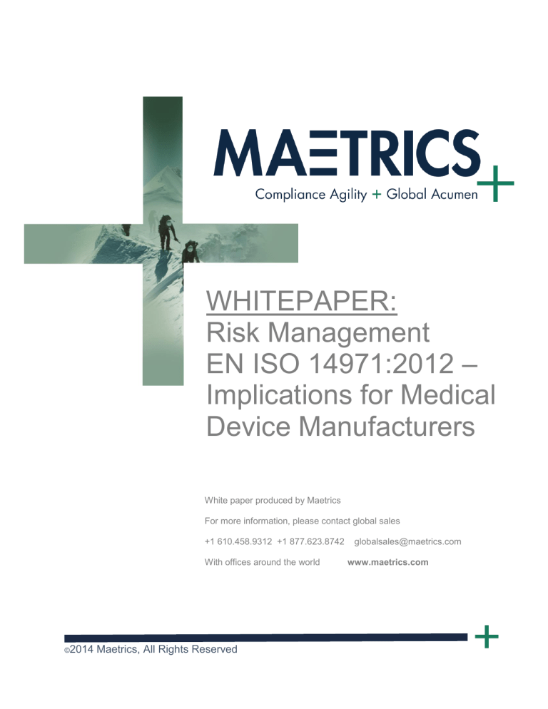WHITEPAPER: Risk Management EN ISO 14971:2012 – Implications for Medical Device Manufacturers White paper produced by Maetrics For more information, please contact global sales +1 610.458.9312 +1 877.623.8742 With offices around the world ©2014 Maetrics, All Rights Reserved globalsales@maetrics.com www.maetrics.com + Introduction Risk management is a fundamental step for medical device manufacturers to demonstrate compliance with the EU Directives for medical devices, ensuring the safety of patients and users. Risk management has been conducted following the principles laid out in ISO 14971, yet since the advent of the new version of EN ISO 14971:2012 - Medical devices – Application of risk management to medical devices, the additional clarification within the standard has led to a number of misconceptions and confusion surrounding the implementation of the new standard by medical device manufacturers. Some frequently heard comments by manufacturers on the new versions of EN ISO 14971 are: “We must use dFMEA (design failure mode and effect analysis) and pFMEA (production or process FMEA) from now on.” “All identified risks must be eliminated.” “We cannot use Annex C questions as we used to.” “We can no longer use ALARP (as low as reasonably practicable) but must use ALAP (as low as possible).” “All risks must be addressed by design changes from now on.” “We will have to go back and rewrite all our risk files.” “We are not allowed to put warnings in the IFU.” As can be seen from the comments, medical device manufacturers have been left in some cases scratching their heads about how exactly they were going to implement the new standard. Did they need to rewrite all the risk analysis they had conducted so far or did they just have to apply the new version of the standard to future risk management activities? This white paper will help medical device manufactures understand the changes made to the EN harmonized version of ISO 14971:2012 and provide guidance on what is expected of medical device manufactures for compliance with the standard, thereby separating the facts from the misconceptions. Background The current ISO (internationally recognized) version of the standard is ISO 14971:2007, which is recognized by the FDA for managing risks associated with medical devices. Any standard that carries the EN nomenclature indicates that it has been harmonized to one or all of the European Directives with respect to the Essential Requirements detailed within an annex of the specific EN standard. The EN version of ISO 14971 had undergone a previous harmonization step in 2009 with the inclusion of three “Z” annexes that described the relationship between the standard and the three European Directives for medical devices. Essentially, compliance with the standard meant that all the Essential Requirements of the 2 directives relating to risk and/or safety were covered by complying with the EN ISO 14971 standard. EN ISO 14971:2012 was published as a result of objections being raised by the Competent Authority in Sweden and the European Commission regarding the inconsistencies in the previous harmonized standard relating to the wording in the three “Z” annexes. New standard The main contents of the new version of the standard have not changed. The additional wording has focused around the annexes listed at the front of the standard that explain the relationship of the standard to the relevant European Directives for medical devices. The risk management process has therefore remained the same, as reflected in the fact that the contents listed in the standard remain the same with the following clauses: Clause 1: Scope Clause 2: Terms and Definitions Clause 3: General Requirements, Including Planning Clause 4: Risk Analysis Clause 5: Risk Evaluation Clause 6: Risk Control Clause 7: Evaluation of Overall Residual Risk Acceptability Clause 8: Risk Management Report Clause 9: Production and Post-Production Information Ten annexes provide informative guidance with the standard, including the risk assessment process, questions for identifying safety hazards, risk concepts, examples of hazards, a risk management plan, risk management techniques and specific guidance on in-vitro diagnostic devices, biological hazards and communicating residual risk safety information. In essence, the same steps are still taken by the manufacturer to conduct a risk assessment for a medical device, as follows: a) Create a risk management plan (Clause 3.4). b) Identify the device characteristics (Clause 4.2 and Annex C). c) Identify the hazard and estimate risks (Clauses 4.3 and 4.4). d) Evaluate the risks identified (Clause 5). e) Develop appropriate risk control measures (Clause 6). f) Evaluate the overall risk for those identified (Clause 7). g) Prepare a risk management report (Clause 8). h) Maintain the risk file by gathering data in the production and post-production phases (Clause 9). 3 New Annexes The main change has been the additional details incorporated into the Annexes ZA, ZB and ZC that demonstrate how the EN ISO 14971:2012 standard helps the manufacturer comply with the three European Directives for medical devices: Medical Devices Directive 93/42/EEC (by Annex ZA) Active Implantable Medical Device Directive 90/385/EEC (by Annex ZB) In Vitro Diagnostic Medical Device Directive 98/79/EC (by Annex ZC) For ease of discussion, this white paper will refer to Annex ZA listed in the standard as the annex that relates to the Medical Devices Directive, and the same concept is used for the remaining directives detailed under Annexes ZB and ZC. The table listed under the ZA Annexes of the standard helps to explain where the standard can be used and how far it goes in demonstrating compliance with the Essential Requirements detailed in the Medical Devices Directive. Where any discrepancies occur, they have also been highlighted. Unfortunately, the wording is based on an interpretation by a