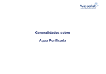 Generalidades sobre Agua Purificada Agua Purificada Sistemas de producción y aplicaciones. Agua Purificada Sistemas de producción y aplicaciones Índice: 1. 2. 3. 4. 5. Agua: Grados de purificación Motivos para usar agua purificada en industria y laboratorio Sistemas de purificación Costes, gestión del agua purificada Clasificaciones de agua purificada Etapas de purificación del agua AGUA BRUTA Agua de Red, de Pozo, de Río, etc. Eliminación de partículas, barro, turbidez AGUA DECLORADA Destilador Eliminación de Cloro AGUA DESCALCIFICADA Eliminación de Dureza (Calcio, Magnesio) Eliminación del 90 - 99% iones AGUA DESIONIZADA TIPO II Conductividad < 1 uS/cm Desionización directa AGUA DESTILADA Conductividad = 0.056 uS/cm Resistividad = 18,2 MOhm·cm ELIMINACIÓN DE SALES Y OTROS COMPONENTES AGUA OSMOTIZADA AGUA ULTRAPURA TIPO I PRETRATAMIENTO AGUA FILTRADA Etapas de purificación del agua AGUA BRUTA Agua de Red, de Pozo, de Río, etc. Eliminación de partículas, barro, turbidez AGUA DECLORADA AGUA DESCALCIFICADA Eliminación de Cloro Eliminación de Dureza (Calcio, Magnesio) PRETRATAMIENTO AGUA FILTRADA 1. Agua: Grados de purificación 1.1 Agua Bruta: Agua de red, agua de pozo, agua de río agua de lluvia, estanque, … - Contaminantes: Sólidos en suspensión Sales disueltas Cloro Materia orgánica Otros - Calidad: Fluctuante a lo largo del año Desconocida Etapas de purificación del agua AGUA BRUTA Agua de Red, de Pozo, de Río, etc. Eliminación de partículas, barro, turbidez AGUA DECLORADA AGUA DESCALCIFICADA Eliminación de Cloro Eliminación de Dureza (Calcio, Magnesio) PRETRATAMIENTO AGUA FILTRADA 1.2 Agua Filtrada: Eliminación de las partículas en suspensión -Filtración con filtros de diferentes micras -No elimina las sales disueltas -No elimina el cloro ni la materia orgánica disuelta 1.3 Agua Declorada: -Filtración con filtros de carbono -Elimina totalmente el cloro presente en agua de red -Elimina la materia orgánica disuelta Etapas de purificación del agua AGUA BRUTA Agua de Red, de Pozo, de Río, etc. Eliminación de partículas, barro, turbidez AGUA DECLORADA AGUA DESCALCIFICADA Eliminación de Cloro Eliminación de Dureza (Calcio, Magnesio) PRETRATAMIENTO AGUA FILTRADA 1.4 Agua Descalcificada: Eliminación de la dureza del agua -Se realiza con un descalcificador -Elimina las sales de calcio y magnesio. Recomendable cuando se trabaja con aguas duras o lo requiere el proceso -Intercambio de iones en una resina que se regenera con sal Etapas de purificación del agua AGUA BRUTA Agua de Red, de Pozo, de Río, etc. Eliminación de partículas, barro, turbidez AGUA DECLORADA Destilador Eliminación de Cloro AGUA DESCALCIFICADA Eliminación de Dureza (Calcio, Magnesio) Eliminación del 90 - 99% iones AGUA DESIONIZADA TIPO II Conductividad < 1 uS/cm Desionización directa AGUA DESTILADA Conductividad = 0.056 uS/cm Resistividad = 18,2 MOhm·cm ELIMINACIÓN DE SALES Y OTROS COMPONENTES AGUA OSMOTIZADA AGUA ULTRAPURA TIPO I PRETRATAMIENTO AGUA FILTRADA 1.5 Agua Osmotizada: Eliminación de las sales disueltas -Equipo de ósmosis inversa -Elimina 90 – 98 % de las sales del agua Etapas de purificación del agua AGUA BRUTA Agua de Red, de Pozo, de Río, etc. Eliminación de partículas, barro, turbidez AGUA DECLORADA Destilador Eliminación de Cloro AGUA DESCALCIFICADA Eliminación de Dureza (Calcio, Magnesio) Eliminación del 90 - 99% iones AGUA DESIONIZADA TIPO II Conductividad < 1 uS/cm Desionización directa AGUA DESTILADA Conductividad = 0.056 uS/cm Resistividad = 18,2 MOhm·cm ELIMINACIÓN DE SALES Y OTROS COMPONENTES AGUA OSMOTIZADA AGUA ULTRAPURA TIPO I PRETRATAMIENTO AGUA FILTRADA 1.6 Agua Destilada: Elimina la mayor parte de los contaminantes del agua -Se realiza con un destilador -Elimina las sales consiguiendo una conductividad ≅ 3 µS/cm -Elimina sólidos en suspensión -Elimina materia orgánica (deja pasar volátiles hasta 100 ºC) 1.7 Agua Desionizada: -Se realiza con un intercambiador de iones -Elimina las sales Etapas de purificación del agua AGUA BRUTA Agua de Red, de Pozo, de Río, etc. Eliminación de partículas, barro, turbidez AGUA DECLORADA Destilador Eliminación de Cloro AGUA DESCALCIFICADA Eliminación de Dureza (Calcio, Magnesio) Eliminación del 90 - 99% iones AGUA DESIONIZADA TIPO II Conductividad < 1 uS/cm Desionización directa AGUA DESTILADA Conductividad = 0.056 uS/cm Resistividad = 18,2 MOhm·cm ELIMINACIÓN DE SALES Y OTROS COMPONENTES AGUA OSMOTIZADA AGUA ULTRAPURA TIPO I PRETRATAMIENTO AGUA FILTRADA 1.8 Agua purificada Tipo II: -Afinado final del agua hasta una conductividad < 1 µS/cm -Se realiza con resina de intercambio iónico de lecho mixto -Apta para numerosos usos industriales y de laboratorio 1.8 Agua purificada Tipo II: -Afinado final del agua hasta una conductividad < 1 µS/cm -Se realiza con resina de intercambio iónico de lecho mixto -Apta para numerosos usos industriales y de laboratorio 1.9 Agua Ultrapura, Tipo I -Afinado final del agua hasta una conductividad de 0.055 µS/cm -Se realiza con resina de intercambio iónico especial -Apta para aplicaciones muy específicas con máximo requisito de pureza 2. Motivos para usar agua purificada en industria y laboratorio El motivo principal es realizar un aporte de agua libre de cualquier otra sustancia que puede causar interferencia en el proceso o producir un deterioro paulatino de las condiciones iniciales de composición de los productos empleados. 2.1 Agua como Ingrediente Disoluciones acuosas: pinturas al agua, baños químicos, disolución de reactivos concentrados, etc. 2.2 Restitución de agua evaporada: Baños, Baterías eléctricas, Taladrinas, etc 2.3 Requisito del proceso: Electroerosión, Tecnología nanopartículas, Industria Electrónica, Baños electrolíticos, etc. 2.4 Enfriamiento de piezas Inmersión en baño de agua 2.5 Mejora del proceso Huecograbado, Electroerosión 2.6 Prolongación de uso Difusores y atomizadores, Taladrinas, galvanizado 2.