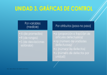 UNIDAD 3. GRÁFICAS DE CONTROL Por variables (medible) • X-(de promedios) • R (de rangos) • S (de desviaciones estándar) ING. MBA JESSICA ESCOBAR MONCADA Por atributos (pasa-no pasa) • p (proporción o fracción de artículos defectuosos) • np (número de unidades defectuosas) • c (número de defectos) • u (número de defectos por unidad) CARTAS DE CONTROL POR VARIABLES GRÁFICA X – MEDIAS: Indica qué tanto se están alejando las mediciones de la tendencia central, que en este caso es la media o promedio. Por ejemplo un nuevo trabajador o nuevos instrumentos de trabajo harán que las mediciones se alejen más de línea central. GRÁFICA R: Qué tanta ganancia o pérdida de uniformidad hay en la dispersión de un proceso dentro de una muestra. En otras palabras, el rango es la resta del valor más grande con el valor más pequeño de una muestra, lo que nos permite determinar la variabilidad. El valor resultante es plasmado en un gráfico de control para ser comparado con el rango de otra serie de muestras. Con esto logramos ver si hay presencia de uniformidad en los puntos ubicados o si no, para intervenir. GRÁFICA X-R: Utilizamos ambos tipos de gráficas cuando se miden la relación de las especificaciones de calidad con la tendencia central y la dispersión. En este sentido, ubicamos una gráfica ligeramente encima de la otra y analizamos el comportamiento de cada punto. ING. MBA JESSICA ESCOBAR MONCADA CARTAS DE CONTROL POR ATRIBUTOS Gráfico p: En él medimos el porcentaje de defectos por muestra. Por ejemplo si tenemos una muestra de 100 productos y 10 de ellos tienen al menos un defecto, hay una fracción defectuosa de 0,1. Este valor se ubica en el gráfico sobre el eje y. Gráfico np: A diferencia de p, este valor no es una fracción. Es el número de unidades defectuosas en una muestra. Si es una muestra de 100 productos, 10 de ellos tienen al menos un defecto, 10 será el valor a ubicar en el gráfico sobre el eje y. Gráfico c: Es el número de defectos por unidad de producción durante un período de muestreo. En este caso, los defectos por producto se cuentan, y establecemos un valor para definir a partir de cuántos defectos una unidad es defectuosa. Por ejemplo, el número de zonas desgastadas que tenga una chaqueta de cuero, si la chaqueta tiene más de 5 zonas desgastadas, se considera una unidad no conforme. Gráfico u: En él medimos el porcentaje de defectos en una unidad durante un período de muestreo. ING. MBA JESSICA ESCOBAR MONCADA CARTAS DE CONTROL µ: Promedio de los datos σ: Desviación estándar, raíz cuadrada de la varianza, mide la variación de los datos. 6σ: 6 desviaciones estándar en relación a la media. Es equivalente a 0 defectos. Nivel de funcionamiento correcto del 99.999%, donde los defectos en proceso y producto son prácticamente inexistentes. Muchos procesos operan en 1, 2 y 3 sigma. La meta seis sigma es muy ambiciosa. ING. MBA JESSICA ESCOBAR MONCADA GRÁFICA DE CONTROL POR VARIABLES X-R-S Para entender los gráficos X-R, es necesario conocer el concepto de Subgrupos (o Subgrupos racionales). Trabajar con subgrupos significa agrupar las mediciones que se obtienen de un proceso, de acuerdo a algún criterio. Los subgrupos se realizan agrupando las mediciones de tal modo que haya la máxima variabilidad entre subgrupos y la mínima variabilidad dentro de cada subgrupo. ING. MBA JESSICA ESCOBAR MONCADA FÓRMULAS PARA CONSTRUIR GRÁFICA DE CONTROL POR VARIABLES Después de calcular el Promedio y el Rango de cada subgrupo, tendríamos una tabla como la siguiente: La desviación standard del proceso se puede calcular a partir del rango promedio, utilizando el coeficiente d2, que depende del número de mediciones en el subgrupo: ING. MBA JESSICA ESCOBAR MONCADA FACTORES PARA CONSTRUIR GRÁFICA DE CONTROL POR VARIABLES X-R Con esto podemos calcular los Límites de Control para el gráfico de X: La desviación standard del rango se puede calcular utilizando el coeficiente d3, que también depende del número de mediciones en el subgrupo: ING. MBA JESSICA ESCOBAR MONCADA FACTORES PARA CONSTRUIR GRÁFICA DE CONTROL POR VARIABLES X-R Con esto podemos calcular los Límites de Control para el gráfico de X: La desviación standard del rango se puede calcular utilizando el coeficiente d3, que también depende del número de mediciones en el subgrupo: Y así podemos calcular los Límites de Control para el Gráfico de R: ING. MBA JESSICA ESCOBAR MONCADA GRÁFICA DE CONTROL X (PROMEDIOS) GRÁFICA DE CONTROL R (RANGOS) ING. MBA JESSICA ESCOBAR MONCADA FACTORES PARA CONSTRUIR GRÁFICA DE CONTROL POR VARIABLES S Los gráficos de control de medias X y desviación estándar S, se construyen de forma similar a los gráficos de medias X y rangos R; solamente que ahora calcularemos la media de la muestra y la desviación estándar de la muestra. Generalmente es preferible trabajar con los gráficos de control X y S, que con los gráficos X y R. Fundamentalmente por las mejores propiedades estadísticas de la desviación estándar en comparación a las del rango. Si tenemos el tamaño de cada subgrupo es de n. La desviación estándar de cada muestra se calcula de la forma usual: De la misma forma, si se tienen m subgrupos, la forma de calcular ING. MBA JESSICA ESCOBAR MONCADA Las fórmulas definitivas para el gráfico de control S, nos quedan como: FACTORES PARA CONSTRUIR GRÁFICA DE CONTROL POR VARIABLES ING. MBA JESSICA ESCOBAR MONCADA GRÁFICA DE CONTROL P (FRACCIÓN DE DEFECTUOSOS) ING. MBA JESSICA ESCOBAR MONCADA GRÁFICA DE CONTROL P Línea central La desviación estándar para la distribución de la muestra se calcula así: n es 92,96 que es el tamaño de la muestra, en este caso el tamaño promedio de los lotes. El cálculo de los límites se hace así: El número de desviaciones estándar se conoce como z. Mesfir (la empresa) limita los valores a 3 desviaciones estándar de la media, lo que equivale a 99,73%. Es por eso que ING.en MBA e