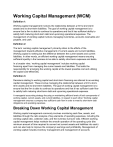 Working Capital Management (WCM) Definition 1: Working capital management involves the relationship between a firm's short-term assets and its short-term liabilities. The goal of working capital management is to ensure that a firm is able to continue its operations and that it has sufficient ability to satisfy both maturing short-term debt and upcoming operational expenses. The management of working capital involves managing inventories, accounts receivable and payable, and cash. Definition 2: The term ‘working capital management’ primarily refers to the efforts of the management towards effective management of current assets and current liabilities. Working capital is nothing but the difference between the current assets and current liabilities. In other words, an efficient working capital management means ensuring sufficient liquidity in the business to be able to satisfy short-term expenses and debts. In a broader view, ‘working capital management’ includes working capital financing apart from managing the current assets and liabilities. That adds the responsibility for arranging the working capital at the lowest possible cost and utilizing the capital cost-effectively. Definition 3: Decisions relating to working capital and short-term financing are referred to as working capital management. These involve managing the relationship between a firm's shortterm assets and its short-term liabilities. The goal of working capital management is to ensure that the firm is able to continue its operations and that it has sufficient cash flow to satisfy both maturing short-term debt and upcoming operational expenses. A managerial accounting strategy focusing on maintaining efficient levels of both components of working capital, current assets, and current liabilities, in respect to each other. Working capital management ensures a company has sufficient cash flow in order to meet its short-term debt obligations and operating expenses. Breaking Down Working Capital Management Working capital management commonly involves monitoring cash flow, assets, and liabilities through the ratio analysis of key elements of operating expenses, including the working capital ratio, collection ratio, and the inventory turnover ratio. Efficient working capital management helps maintain the smooth operation of the operating cycle (the minimum amount of time required to convert net current assets and liabilities into cash) and can also help to improve the company's earnings and profitability. Management of working capital includes inventory management and management of accounts receivables and accounts payables. The main objectives of working capital management include maintaining the working capital operating cycle and ensuring its ordered operation, minimizing the cost of capital spent on the working capital, and maximizing the return on current asset investments. Objectives of Working Capital Management The primary objectives of working capital management include the following: Smooth Operating Cycle: The key objective of working capital management is to ensure a smooth operating cycle. It means the cycle should never stop for the lack of liquidity whether it is for buying raw material, salaries, tax payments etc. Lowest Working Capital: For achieving the smooth operating cycle, it is also important to keep the requirement of working capital at the lowest. This may be achieved by favorable credit terms with accounts payable and receivables both, faster production cycle, effective inventory management etc. Minimize Rate of Interest or Cost of Capital: It is important to understand that the interest cost of capital is one of the major costs in any firm. The management of the firm should negotiate well with the financial institutions, select the right mode of finance, maintain optimal capital structure etc. Optimal Return on Current Asset Investment: In many businesses, you have a liquidity crunch at one point of time and excess liquidity at another. This happens mostly with seasonal industries. At the time of excess liquidity, the management should have good short-term investment avenues to take benefit of the idle funds. Advantages of Working Capital Management Working capital management ensures sufficient liquidity when required. It evades interruptions in operations. Profitability maximized. Achieves better financial health. Develops competitive advantage due to streamlined operations. Disadvantages of Working Capital Management It only considers monetary factors. There are non-monetary factors that it ignores like customer and employee satisfaction, government policy, market trend etc. Difficult to accommodate sudden economic changes. Too high dependence on data is another downside. A smaller organization may not have such data generation. Too many variables to keep in mind say current ratios, quick ratios, collection periods, etc. Importance of Effective Working Capital Management Although the importance of working capital is unquestionable in any type of business. Working capital management is a day to day activity, unlike capital budgeting decisions. Most importantly, inefficiencies at any levels of management have an impact on the working capital and its management. Following are the main points that signify why it is important to take the management of working capital seriously. Ensures Higher Return on Capital Improvement in Credit Profile & Solvency Increased Profitability Better Liquidity Business Value Appreciation Most Suitable Financing Terms Interruption Free Production Readiness for Shocks and Peak Demand Advantage over Competitors Elements of Working Capital Management The working capital ratio, calculated as current assets divided by current liabilities, is considered a key indicator of a company's fundamental financial health since it indicates the company's ability to successfully meet all of its short-term financial obligations. Although numbers vary by industry, a working capital ratio 