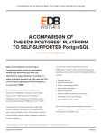 A COMPARISON OF THE EDB POSTGRES™ PLATFORM TO SELF-SUPPORTED PostgreSQL A COMPARISON OF THE EDB POSTGRES™ PLATFORM TO SELF-SUPPORTED PostgreSQL THE KEY DIFFERENCES Open source databases are becoming an To meet these needs, EnterpriseDB created the increasingly popular option for organizations EDB Postgres™ Platform, which adds additional features, seeking high performance yet lower cost capabilities and support around the PostgreSQL database alternatives to legacy databases. According to a including: report by Gartner Research, by 2018, more than 70% of new in-house applications will be developed on an open-source DBMS. 1 As organizations explore these new open source alternatives, PostgreSQL is becoming an increasingly popular choice. This popularity was reflected in DB-Engines.com (a leading source of database usage research) naming Postgres “DBMS of the Year” for 2017. Increased security Enterprise-ready tools Oracle® compatibility features More deployment options Enhanced integration Enhanced DBA and Developer productivity PostgreSQL community leadership 24x7 “Follow-the-Sun” support Like all database management systems, PostgreSQL This document explains the key differences between requires additional enterprise tools and capabilities to PostgreSQL using the EDB Postgres Platform compared to ensure high availability at scale. These include additional self-supported PostgreSQL alone. tools for backup, disaster recovery, replication, monitoring and data migration. 1 - GARTNER, EMERGING TECHNOLOGY TRENDS CREATE OPPORTUNITIES FOR DBMS COST OPTIMIZATION, PUBLISHED: 21 APRIL 2016 EDB WHITE PAPER | PAGE 1 A COMPARISON OF THE EDB POSTGRES™ PLATFORM TO SELF-SUPPORTED PostgreSQL PostgreSQL The EDB Postgres Platform PostgreSQL is a relational database management system The EDB Postgres Platform™ starts with the open source (DBMS) that has been an active open source project since PostgreSQL database system and adds enterprise-class 1996. It is one of the oldest and most stable open source features and tools. These critical components are used by projects as a result of the commitment of its members and thousands of organizations worldwide to reliably operate its independence as a stand-alone community. Postgres at scale while minimizing risk. The community consists of a wide variety of individuals The platform consists of two database options: from many different backgrounds. Some are from PostgreSQL PostgreSQL consulting businesses, software vendors, and EDB Postgres Advanced Server (EPAS) large organizations who sponsor individuals to work on PostgreSQL. EnterpriseDB is one of the largest employers For readability, in the remainder of this paper, the term of PostgreSQL community members. Two of the five core “Postgres” refers to either the PostgreSQL or EPAS PostgreSQL team members, seven committers and a much databases. EPAS is a continuously synchronized larger number of contributors are EDB employees. commercial derivative database based on PostgreSQL, containing all the features and fixes of the open source Feature suggestions and code may be submitted by database, plus added enterprise features for security, anyone, but the core team members and source code performance, and database compatibility for Oracle. committers ultimately make the key decisions for each release. PostgreSQL has a reputation for high quality, Why does EDB include two databases in its platform? standards-based code, extensive security features, Some companies mandate use of open source software excellent documentation, and application for a wide To provide choice depending upon the needs of any variety of workloads including unstructured data like JSON given application or organization documents and key-value stores. New releases are To provide additional enterprise features and published yearly, regular updates are provided quarterly capabilities not available in standard PostgreSQL and ad hoc security or maintenance updates are published as needed. Surrounding the database in the EDB Postgres Platform are tools developed, maintained, packaged, distributed, Users can freely download source code and build the supported and documented by EDB. These help database binaries themselves. If users prefer not to build organizations with management, monitoring, tuning, high the binaries themselves, they can either obtain free availability, disaster recovery, and database replication PostgreSQL from a number of packagers who include it in needs. Enterprises also have access to data adapters for their software distribution (e.g. Red Hat Enterprise Linux) or integrating other relational and non-relational databases. from easy to use RPM or GUI installers. These powerful tools surrounding the database are one of the biggest differences between using self-supported The PostgreSQL software license is quite liberal and allows PostgreSQL and the EDB Postgres Platform. use without cost or signed agreements. It also allows modification and redistribution without the need to The EDB Postgres Platform also facilitates a wider array of contribute changes back to the community. database deployment options including bare metal, virtual EDB WHITE PAPER | PAGE 2 A COMPARISON OF THE EDB POSTGRES™ PLATFORM TO SELF-SUPPORTED PostgreSQL machines, containers, private cloud, public cloud, and difference between PostgreSQL and EPAS. In direct hybrid cloud. In addition, EDB Postgres™ Ark DBaaS response to a customer feature request (a top US-based software deploys and manages databases in multiple credit card processor), EDB added database integrated public or private clouds while integrating into existing password policy management capabilities for passwords. DevOps and ITSM environments. These govern password strength, lockout times, password lifetime, grace periods, and more. This allowed the And finally, the EDB Postgres Platform includes services such as 24x7 technical support, training and certification, along with a 