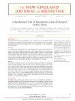 new england journal of medicine The established in 1812 August 23, 2018 vol. 379 no. 8 A Randomized Trial of Epinephrine in Out-of-Hospital Cardiac Arrest G.D. Perkins, C. Ji, C.D. Deakin, T. Quinn, J.P. Nolan, C. Scomparin, S. Regan, J. Long, A. Slowther, H. Pocock, J.J.M. Black, F. Moore, R.T. Fothergill, N. Rees, L. O’Shea, M. Docherty, I. Gunson, K. Han, K. Charlton, J. Finn, S. Petrou, N. Stallard, S. Gates, and R. Lall, for the PARAMEDIC2 Collaborators* a bs t r ac t BACKGROUND Concern about the use of epinephrine as a treatment for out-of-hospital cardiac arrest led the International Liaison Committee on Resuscitation to call for a placebocontrolled trial to determine whether the use of epinephrine is safe and effective in such patients. METHODS In a randomized, double-blind trial involving 8014 patients with out-of-hospital cardiac arrest in the United Kingdom, paramedics at five National Health Service ambulance services administered either parenteral epinephrine (4015 patients) or saline placebo (3999 patients), along with standard care. The primary outcome was the rate of survival at 30 days. Secondary outcomes included the rate of survival until hospital discharge with a favorable neurologic outcome, as indicated by a score of 3 or less on the modified Rankin scale (which ranges from 0 [no symptoms] to 6 [death]). RESULTS The authors’ full names, academic degrees, and affiliations are listed in the Appendix. Address reprint requests to Dr. Perkins at Warwick Clinical Trials Unit, Warwick Medical School, University of Warwick, Coventry CV4 7AL, United Kingdom, or at ­paramedictrial@­warwick.­ac.­uk. * A complete list of collaborators in the PARAMEDIC2 trial is provided in the Supplementary Appendix, available at NEJM.org. This article was published on July 18, 2018, at NEJM.org. N Engl J Med 2018;379:711-21. DOI: 10.1056/NEJMoa1806842 Copyright © 2018 Massachusetts Medical Society. At 30 days, 130 patients (3.2%) in the epinephrine group and 94 (2.4%) in the placebo group were alive (unadjusted odds ratio for survival, 1.39; 95% confidence interval [CI], 1.06 to 1.82; P = 0.02). There was no evidence of a significant difference in the proportion of patients who survived until hospital discharge with a favorable neurologic outcome (87 of 4007 patients [2.2%] vs. 74 of 3994 patients [1.9%]; unadjusted odds ratio, 1.18; 95% CI, 0.86 to 1.61). At the time of hospital discharge, severe neurologic impairment (a score of 4 or 5 on the modified Rankin scale) had occurred in more of the survivors in the epinephrine group than in the placebo group (39 of 126 patients [31.0%] vs. 16 of 90 patients [17.8%]). CONCLUSIONS In adults with out-of-hospital cardiac arrest, the use of epinephrine resulted in a significantly higher rate of 30-day survival than the use of placebo, but there was no significant between-group difference in the rate of a favorable neurologic outcome because more survivors had severe neurologic impairment in the epinephrine group. (Funded by the U.K. National Institute for Health Research and others; Current Controlled Trials number, ISRCTN73485024.) n engl j med 379;8 nejm.org August 23, 2018 711 The New England Journal of Medicine Downloaded from nejm.org at KAOHSIUNG MEDICAL UNIVERSITY on September 10, 2018. For personal use only. No other uses without permission. Copyright © 2018 Massachusetts Medical Society. All rights reserved. The n e w e ng l a n d j o u r na l I n attempting to reduce the rate of death and disability associated with cardiac arrest worldwide,1,2 emergency medical workers have few effective treatments other than early initiation of cardiopulmonary resuscitation (CPR) and prompt defibrillation.3 For more than 50 years, treatment strategies have included the use of various drugs, but there is limited evidence that such treatments are effective.4 Epinephrine (adrenaline) has potentially beneficial effects in cardiac arrest through the constriction of arterioles mediated by α-adrenergic receptors. Such constriction increases aortic diastolic pressure during CPR, thereby augmenting coronary blood flow and increasing the chance of a return of spontaneous circulation.5 Potentially harmful effects on the heart are mediated through β-adrenergic stimulation, which causes dysrhythmias and increased myocardial oxygen demand and increases the risk of recurrent cardiac arrest.6 In addition, α-adrenergic stimulation causes platelet activation, which promotes thrombosis7 and impairs the microvascular blood flow in the cerebral cortex, which in turn increases the severity of cerebral ischemia during CPR and after a return of spontaneous circulation.8 Previous trials that have compared standarddose epinephrine (1 mg) with high-dose epinephrine (5 to 10 mg), with epinephrine and vasopressin, or with placebo have not shown evidence of better outcomes.9 Observational studies involving more than 500,000 patients have reported higher rates of return of spontaneous circulation but worse neurologic outcomes in patients who were treated with epinephrine.10 The interpretation of these findings has been limited by conflicting results and the influence of unmeasured confounders. Thus, the International Liaison Committee on Resuscitation, a consortium of seven major organizations involved in the field of resuscitation worldwide, called for the initiation of a placebo-controlled trial to establish whether epinephrine is safe and effective as a treatment for cardiac arrest.4,11 Subsequently, we initiated the PARAMEDIC2 (Prehospital Assessment of the Role of Adrenaline: Measuring the Effectiveness of Drug Administration in Cardiac Arrest) trial to determine whether epinephrine is beneficial or harmful as a treatment for out-of-hospital cardiac arrest.12 712 n engl j med 379;8 of m e dic i n e Me thods Trial Design and Oversight From December 2014 through October 2017, the multicenter, randomized, double-blind, placebocontrolled PARAMEDIC2 trial was conducted by fiv