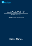 List of Components ■ Standard Items MODEL Main Body Main Body with analog output Main Body with pressure sensor Main body with pressure sensor and analog output 6501-00 Qty - 6501-A0 6501-B0 Functions With analog output function One of these With pressure measurement function With pressure measurement and analog output functions 6501-C0 6531-06 1 Air velocity, air temperature, humidity sensor (directivity) Air velocity, air temperature sensor (directivity) Air velocity, air temperature sensor (needle-type) Air velocity, air temperature, humidity sensor (spherical) Air velocity, air temperature sensor (spherical) Air velocity sensor (mini-spherical, straight type) Air velocity sensor (mini-spherical, articulating type) Air velocity, air temperature sensor (directivity) To connect Probe to Main Body USB Cable - 1 USB Communication Cable Carrying Case - 1 Hard case Operation Manual - 1 - Manganese AA Batteries - 6 - 6531-21 6541-21 6542-21 6533-21 Probe 6543-21 One of these 6551-21 6552-21 6561-21 Probe Cable ■ Available Accessories Items MODEL Functions Extension Rod (Flexible) 6531-04 For measurements in high places Extension Rod (Straight) 6531-05 For measurements in high places AC Adaptor 6113-02 Power Supply Printer (Recommended) DPU-S245 To print out data, calculation results, etc. Printer Cable Mobile ANEMOMASTER Measurement Software Hands-free Case 6000-31 To connect the Main Body to the Printer 6000-41 Data acquisition software 6000-61 For hands-free measurement i Important Safety Information The symbols for the warnings used in this manual are defined below: Classifications Danger: To Prevent Serious Injury or Death Warnings in this classification indicate a danger that may result in serious injury or death if not observed. Caution: To Prevent Damage to the Product Warnings in this classification indicate a risk of damage to the product that may void the product warranty if not observed. Description of Symbols △This symbol indicates a condition that requires caution (including danger). The subject of each caution is illustrated inside the triangle (e.g. the high temperature caution symbol is shown on the left). This symbol indicates a prohibition. Do not take the prohibited action shown inside or near this symbol (e.g. the disassembly prohibition symbol is shown on the left). ●This symbol indicates a mandatory action. A specific action is given near the symbol. ii Danger Never bring the probe close to a flammable gas atmosphere. The heated sensor may cause a fire or explosion. Forbidden Never touch the sensor. Don’t touch Hot surface The sensor is heated during operation. Touching the heated sensor may cause burns, and may also damage the sensor itself. Do not disassemble or heat the batteries, or put them into a fire. Use properly Explosive Caution This may cause burns and the batteries may burst. If abnormal noises, smells or smoke occur, or if liquid enters the instrument, turn off the instrument immediately, and remove the batteries or pull out the plug. There is possibility of malfunction, electric shock, and/or fire. Please contact your local distributor or our service center for repair. Caution Always unplug the instrument from the electrical outlet when the instrument is not in use. Failure to do so may cause an electrical shock, fire or circuit damage. Use properly Do not use the instrument in a water vapor atmosphere. Forbidden Condensed steam on the sensor will change the heat dissipation rate, resulting in inaccurate measurements. It may also cause damage to the sensor. This instrument is designed to be used in an environment with a clean air stream without any dust or foreign materials. Forbidden Foreign materials may cause damage to the sensor. Also dust or foreign materials on the sensor will impede accurate measurements. Do not apply force to the sensor. Forbidden If the sensor is deformed, the accuracy of the sensor may be affected. When measuring, ensure that the direction mark is facing into the airflow. Set up properly Otherwise, the measurement may be inaccurate, as some sensors (uni-directional probes) have a specific directivity. iii Forbidden Do not use or leave the instrument in a high temperature, high humidity or dusty environment. Do not leave this instrument under direct sunlight for a prolonged period. The instrument may not function properly out of the specified operating conditions. Do not subject the instrument or the probe to strong impacts. Forbidden Dropping the unit or placing heavy objects on it may cause damage or malfunction to the instrument. Never disassemble, modify or repair the product. Do not remodel/ disassemble Failure to observe the above may cause a short circuit and/or other failures that will affect the performance. Do not pick up or carry the instrument by the probe cable. It may cause a malfunction or the wire may break. Forbidden Set up properly Remove the batteries from the battery compartment when storing the instrument for a long period. Do not leave exhausted batteries in the battery compartment. When inserting batteries be sure to insert them with the polarity facing the correct direction. Failure to do so may cause battery leakage. Do not wipe the instrument with a volatile solvent. Forbidden The body may deform or deteriorate. Use a soft dry cloth to remove stains. If stains persist, soak the cloth in a neutral detergent and wipe the instrument with the soft cloth. Never use volatile solvents such as thinner or benzene. Discharge any built-up static electricity from your body before touching the instrument. Forbidden Electrified ForbiddenUse properly iv The built-up static electricity may influence the readings and cause damage to the circuit. Regularly check the head of the probe for contamination. Impurities (such as dust) on the sensor may affect the accuracy of the measurements. To get rid of dust, use a blow blush for cameras to blow it off, or you can rinse it with water and allow it to air-dry completel