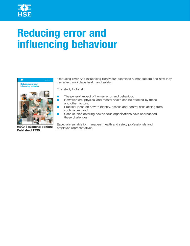 Reducing error and influencing behaviour Health and Safety Executive Reducing error and influencing behaviour aviour actors and how ‘Reducing Error And Influencing Behaviour’ examines human factors and how they can affect workplace health and safety. Health and Safety Executive Reducing error and influencing behaviour This study looks at: ■■ ■■ d by these s arising from proached als and ■■ ■■ ISBN 978-0-7176-2452-2 9 780717 624522 The general impact of human error and behaviour; How workers’ physical and mental health can be affected by these and other factors; Practical ideas on how to identify, assess and control risks arising from such issues; and Case studies detailing how various organisations have approached these challenges. HSG48 https://books.hse.gov.uk/ 02/08/2018 09:49 HSG48 (Second edition) Published 1999 Especially suitable for managers, health and safety professionals and employee representatives. Published by TSO (The Stationery Office), part of Williams Lea Tag, and available from: Online https://books.hse.gov.uk/ Mail, Telephone, Fax & E-mail TSO PO Box 29, Norwich, NR3 1GN Telephone orders/General enquiries: 0333 202 5070 Fax orders: 0333 202 5080 E-mail: customer.services@tso.co.uk Textphone 0333 202 5077 TSO@Blackwell and other Accredited Agents © Crown copyright 1999 First published 1989 Second edition 1999 ISBN 978 0 7176 2452 2 This information is licensed under the Open Government Licence v3.0. To view this licence, visit http://www.nationalarchives.gov.uk/doc/open-government-licence/ Any enquiries regarding this publication should be sent to: copyright@hse.gov.uk Some images and illustrations in this publication may not be owned by the Crown and cannot be reproduced without permission of the copyright owner. Where we have identified any third party copyright information you will need to obtain permission from the copyright holders concerned. Enquiries should be sent to copyright@hse.gov.uk Printed in the United Kingdom for The Stationery Office. J003465850 C0.7 08/18 This guidance is issued by the Health and Safety Executive. Following the guidance is not compulsory, unless specifically stated, and you are free to take other action. But if you do follow the guidance you will normally be doing enough to comply with the law. Health and safety inspectors seek to secure compliance with the law and may refer to this guidance. Health and Safety Executive Contents Introduction 4 Chapter 1 What are ‘human factors’? 5 Why should I be interested in human factors issues at work? 6 How do I know if these problems exist in my organisation? 6 Isn’t it just about people ‘taking more care’? 7 This seems to be a very broad topic area, where should I start? 7 Isn’t this going to be costly? 7 Should I seek the views of the workforce and their representatives? What kind of control measures are possible? 8 Chapter 2 Understanding human failure Human failure and accidents 9 The human contribution to accidents Causes of human failure 12 Breaking the rules 16 Chapter 3 Designing for people 8 9 11 19 Ergonomic design 19 Designing jobs for mental well-being 21 Writing procedures 24 Designing warnings for maximum effect 27 Human Reliability Assessment 28 Chapter 4 Managing the influences on human performance 31 Fatigue and shift work 31 Effective shift communication 33 Focusing on behaviour 34 Health and safety culture 39 Chapter 5 Getting started 42 Where do I start? 42 Human factors in risk assessments 42 Human factors when analysing incidents, accidents and near misses 44 Human factors in design and procurement 44 Human factors in other aspects of health and safety management 45 How can I do all of this? 45 Checklist for human factors in the workplace 46 Chapter 6 Case studies: Solutions to human factors problems Acknowledgements Glossary References 47 69 69 70 Further information 73 Reducing error and influencing behaviour iii Page 3 of 73 Reducing error influencing behaviour Reducing error and influencing behaviour Health and Safety Executive Introduction This guidance is aimed at managers with health and safety responsibilities, health and safety professionals and employee safety representatives. The message is that proper consideration of ‘human factors’ is a key ingredient of effective health and safety management. Human factors is a broad field and organisations may have viewed it in the past as being too complex or difficult to do anything about. This guidance aims to overcome such fears by providing practical help on how to tackle some of the important issues. The guidance: n n n n explains how human error and behaviour can impact on health and safety; shows how human behaviour and other factors in the workplace can affect the physical and mental health of workers; provides practical ideas on what you can do to identify, assess and control risks arising from the human factor; and includes illustrative case studies to show how other organisations have tackled different human problems at work. The format of the publication is as follows: Chapter 1 provides an introduction to human factors. Chapter 2 looks at types of human failures, their causes and ways of reducing them. Chapter 3 considers how to improve health and safety at work through better design of tasks, equipment, procedures and warnings. Chapter 4 looks at some key operational issues: shiftwork and fatigue, shift communication, risk perception and behaviour, and health and safety culture. Chapter 5 provides some hints on how to get started. Chapter 6 presents a series of case studies which illustrate practical cost-effective solutions to real human factors problems. Tables enable you to read only those cases which are most relevant to your organisation and problem area. Some of the approaches shown in this guidance represent ‘good practice’ rather than what is strictly required by legislation. The guidance cannot cover every aspect of human factors. It introduces some key influ