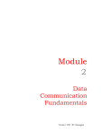 Module 2 Data Communication Fundamentals Version 2 CSE IIT, Kharagpur Lesson 1 Data and Signal Version 2 CSE IIT, Kharagpur Specific Instructional Objectives At the end of this lesson the students will be able to: • • • • • • • • • Explain what is data Distinguish between Analog and Digital signal Explain the difference between time and Frequency domain representation of signal Specify the bandwidth of a signal Specify the Sources of impairment Explain Attenuation and Unit of Attenuation Explain Data Rate Limits and Nyquist Bit Rate Distinguish between Bit Rate and Baud Rate Identify Noise Sources 2.1.1 Introduction A simplified model of a data communication system is shown in Fig. 2.1.1. Here there are five basic components: • Source: Source is where the data is originated. Typically it is a computer, but it can be any other electronic equipment such as telephone handset, video camera, etc, which can generate data for transmission to some destination. The data to be sent is represented by x(t). COMMUNICATION MEDIUM Figure 2.1.1 Simplified model of a data communication system • Transmitter: As data cannot be sent in its native form, it is necessary to convert it into signal. This is performed with the help of a transmitter such as modem. The signal that is sent by the transmitter is represented by s(t). Version 2 CSE IIT, Kharagpur • Communication Medium: The signal can be sent to the receiver through a communication medium, which could be a simple twisted-pair of wire, a coaxial cable, optical fiber or wireless communication system. It may be noted that the signal that comes out of the communication medium is s’(t), which is different from s(t) that was sent by the transmitter. This is due to various impairments that the signal suffers as it passes through the communication medium. • Receiver: The receiver receives the signal s’(t) and converts it back to data d’(t) before forwarding to the destination. The data that the destination receives may not be identical to that of d(t), because of the corruption of data. • Destination: Destination is where the data is absorbed. Again, it can be a computer system, a telephone handset, a television set and so on. 2.1.2 Data Data refers to information that conveys some meaning based on some mutually agreed up rules or conventions between a sender and a receiver and today it comes in a variety of forms such as text, graphics, audio, video and animation. Data can be of two types; analog and digital. Analog data take on continuous values on some interval. Typical examples of analog data are voice and video. The data that are collected from the real world with the help of transducers are continuous-valued or analog in nature. On the contrary, digital data take on discrete values. Text or character strings can be considered as examples of digital data. Characters are represented by suitable codes, e.g. ASCII code, where each character is represented by a 7-bit code. 2.1.3 Signal It is electrical, electronic or optical representation of data, which can be sent over a communication medium. Stated in mathematical terms, a signal is merely a function of the data. For example, a microphone converts voice data into voice signal, which can be sent over a pair of wire. Analog signals are continuous-valued; digital signals are discrete-valued. The independent variable of the signal could be time (speech, for example), space (images), or the integers (denoting the sequencing of letters and numbers in the football score). Figure 2.1.2 shows an analog signal. Version 2 CSE IIT, Kharagpur Figure 2.1.2 Analog signal Digital signal can have only a limited number of defined values, usually two values 0 and 1, as shown in Fig. 2.1.3. Figure 2.1.3 Digital signal Signaling: It is an act of sending signal over communication medium Transmission: Communication of data by propagation and processing is known as transmission. 2.1.4 Signal Characteristics A signal can be represented as a function of time, i.e. it varies with time. However, it can be also expressed as a function of frequency, i.e. a signal can be considered as a composition of different frequency components. Thus, a signal has both time-domain and frequency domain representation. Version 2 CSE IIT, Kharagpur 2.1.4.1 Time-domain concepts A signal is continuous over a period, if limt->a s (t) = s (a), for all a, i.e., there is no break in the signal. A signal is discrete if it takes on only a finite number of values. A signal is periodic if and only if s (t+T) = s (t) for - α < t < α , where T is a constant, known as period. The period is measured in seconds. In other words, a signal is a periodic signal if it completes a pattern within a measurable time frame. A periodic signal is characterized by the following three parameters. Amplitude: It is the value of the signal at different instants of time. It is measured in volts. Frequency: It is inverse of the time period, i.e. f = 1/T. The unit of frequency is Hertz (Hz) or cycles per second. Phase: It gives a measure of the relative position in time of two signals within a single period. It is represented by φ in degrees or radian. A sine wave, the most fundamental periodic signal, can be completely characterized by its amplitude, frequency and phase. Examples of sine waves with different amplitude, frequency and phase are shown in Fig. 2.1.4. The phase angle φ indicated in the figure is with respect to the reference waveform shown in Fig. 2.1.4(a). Figure 2.1.4 Examples of signals with different amplitude, frequency and phase Version 2 CSE IIT, Kharagpur An aperiodic signal or nonperiodic signal changes constantly without exhibiting a pattern or cycle that repeats over time as shown in Fig. 2.1.5. a). Analog aperiodic signal b). Digital aperiodic signal Figure 2.1.5 Examples of aperiodic signals 2.1.4.2 Frequency domain concepts The time domain representation displays a signal using time-domain plot, which shows changes in sign