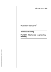 AS 1100.201—1992 Australian StandardR Technical drawing Accessed by WOODSIDE ENERGY LTD on 21 Nov 2001 Part 201: Mechanical engineering drawing This Australian Standard was prepared by Committee ME/72, Technical Drawing. It was approved on behalf of the Council of Standards Australia on 25 August 1992 and published on 16 November 1992. The following interests are represented on Committee ME/72: Association of Consulting Engineers Australia Australian Chamber of Commerce Bureau of Steel Manufacturers of Australia Confederation of Australian Industry Department of Administrative Services Department of Defence Department of Employment and Technical and Further Education, South Australia Institute of Draftsmen, Australia Institute of Industrial Arts Institution of Engineers, Australia Master Builders—Construction and Housing Association Australia N.S.W Technical and Further Education Commission Public Works Department, N.S.W. University of New South Wales University of Queensland Additional interests participating in preparation of Standard: Accessed by WOODSIDE ENERGY LTD on 21 Nov 2001 University of Technology, Sydney Review of Australian Standards. To keep abreast of progress in industry, Australian Standards are subject to periodic review and are kept up–to–date by the issue of amendments or new editions as necessary. It is important therefore that Standards users ensure that they are in possession of the latest edition, and any amendments thereto. Full details of all Australian Standards and related publications will be found in the Standards Australia Catalogue of Publications; this information is supplemented each month by the magazine ‘The Australian Standard’, which subscribing members receive, and which gives details of new publications, new editions and amendments, and of withdrawn Standards. Suggestions for improvements to Australian Standards, addressed to the head office of Standards Australia, are welcomed. Notification of any inaccuracy or ambiguity found in an Australian Standard should be made without delay in order that the matter may be investigated and appropriate action taken. This Standard was issued in draft form for comment as DR 90109. AS 1100.201—1992 Australian StandardR Technical drawing Accessed by WOODSIDE ENERGY LTD on 21 Nov 2001 Part 201: Mechanical engineering drawing For history before 1992, see Preface. Second edition AS 1100.201—1992. Incorporating Amdt 1-1992 PUBLISHED BY STANDARDS AUSTRALIA (STANDARDS ASSOCIATION OF AUSTRALIA) 1 THE CRESCENT, HOMEBUSH, NSW 2140 ISBN 0 7262 7805 X PREFACE This Standard was prepared by the Standards Australia Committee on Technical Drawing to supersede AS 1100.201–1984. AS 1100.201 was a revision and amalgamation of AS 1100 Parts 9 to 11 all published in 1974 and AS 1100 Part 12 published in 1979. AS 1100 Parts 9 to 12 ran concurrently with AS CZ1.1 of 1976 which was withdrawn in 1982. AS CZ1.1 was a revision of AS CZ1 which was first published in 1941 with further editions published in 1944, 1946, 1951, 1966 and 1973. The 1966 edition also superseded AS Z8 of 1956 (endorsement of BS 308.2—1953 without amendment). The AS CZ1 Standards were endorsements of The Institution of Engineers, Australia publications entitled, Engineering Drawing Practice. The document from which these publications originated, was published by the Institution under the title, Recommended Engineering Drawing Practice but this was not endorsed by this Association. This Standard is one of a series dealing with technical drawing, the other Standards in the series being as follows: General principles Part 101: Part 301: Architectural drawing Part 401: Engineering survey and engineering survey design drawing Part 501: Structural engineering drawing In the preparation of this Standard, the committee took account of changes in Australian technical drawing practice and recommendations of the International Organization for Standardization. Also considered were the equivalent British and American Standards. In its preparation, many changes in the layout of the text and figures have taken place resulting in greater consistency and improved ease of use of the document. New material introduced in this edition includes the simplified representation of pipelines, centre holes, seals and a guide to general tolerancing of castings. The section on dimensioning and tolerancing which previously was in this part of the Standard is now contained in Part 101. Reference to Part 101 is required for the source and definition of some of the contents of this part. This Standard is in agreement with the following International Standards: ISO 128 1302 2162 2203 2768 2768–1 Accessed by WOODSIDE ENERGY LTD on 21 Nov 2001 2768–2 6410 6411 6412 6412–1 6412–2 6413 8062 8826 8826–1 9222 9222–1 9222–2 Technical drawings — General principles of presentation Technical drawings — Method of indicating surface texture on drawings Technical drawings — Representation of springs Technical drawings — Conventional representation of gears General tolerances Part 1: Tolerances for linear and angular dimensions without individual tolerance indications Part 2: Geometrical tolerances for features without individual tolerance indications Technical drawings — Conventional representation of threaded parts Technical drawings — Simplified representation of centre holes Technical drawings — Simplified representation of pipelines Part 1: General rules and orthogonal representation Part 2: Isometric projection Technical drawings — Representation of splines and serrations Castings — System of dimensional tolerances Technical drawings — Rolling bearings Part 1: General simplified representation Technical drawings — Seals for dynamic application Part 1: General simplified representation Part 2: Detailed simplified representation CONTENTS Page SECTION 1 SCOPE AND GENERAL 1.1 1.2 1.3 1.4 1.5 SCOPE . . . . . . . . . . . . . . . . . . . . . . . . . . . . . . 