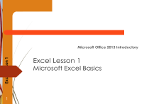 Excel Lesson 1 Microsoft Office 2013 Introductory 1 Excel Lesson 1 Microsoft Excel Basics Objectives Define the terms spreadsheet and worksheet. Identify the parts of a worksheet. Excel Lesson 1 Start Excel, open an existing workbook, and save a workbook. 22 Move the active cell in a worksheet. Objectives (continued) Select cells and enter data in a worksheet. Edit and replace data in cells. Zoom, preview, and print a worksheet. Excel Lesson 1 Close a workbook and exit Excel. 33 Introduction to Spreadsheets Microsoft Excel 2013 is the spreadsheet program in Microsoft Office 2013. Excel Lesson 1 A spreadsheet is a grid of rows and columns in which you enter text, numbers, and the results of calculations. 44 In Excel, a computerized spreadsheet is called a worksheet. The file used to store worksheets is called a workbook. Starting Excel Excel Lesson 1 You start Excel from the Start menu in Windows. Click the Start button, click All Programs, click Microsoft Office, and then click Microsoft Excel 2013. 55 Starting Excel (continued) Excel Lesson 1 Excel program window 6 Exploring the Parts of the Workbook Each workbook contains three worksheets by default. The worksheet displayed in the work area is the active worksheet. Excel Lesson 1 Columns appear vertically and are identified by letters. Rows appear horizontally and are identified by numbers. 77 A cell is the intersection of a row and a column. Each cell is identified by a unique cell reference. Exploring the Parts of the Workbook (continued) Excel Lesson 1 The cell in the worksheet in which you can type data is called the active cell. 88 The Name Box, or cell reference area, displays the cell reference of the active cell. The Formula Bar displays a formula when a worksheet cell contains a calculated value. A formula is an equation that calculates a new value from values currently in a worksheet. Opening an Existing Workbook Excel Lesson 1 Opening a workbook means loading an existing workbook file from a drive into the program window. 99 To open an existing workbook, you click the File tab on the Ribbon to display Backstage view, and then click Open in the navigation bar. The Open dialog box appears. Excel Lesson 1 Opening an Existing Workbook (continued) 10 Saving a Workbook Excel Lesson 1 11 11 The Save command saves an existing workbook, using its current name and save location. The Save As command lets you save a workbook with a new name or to a new location. Moving the Active Cell in a Worksheet Excel Lesson 1 12 12 The easiest way to change the active cell in a worksheet is to move the pointer to the cell you want to make active and click. You can display different parts of the worksheet by using the mouse to drag the scroll box in the scroll bar to another position. You can also move the active cell to different parts of the worksheet using the keyboard. Moving the Active Cell in a Worksheet (continued) Excel Lesson 1 Keys for moving the active cell in a worksheet 13 Selecting a Group of Cells A group of selected cells is called a range. The range is identified by its range reference, for example, A3:C5. Excel Lesson 1 In an adjacent range, all cells touch each other and form a rectangle. 14 To select an adjacent range, click the cell in a corner of the range, drag the pointer to the cell in the opposite corner of the range, and release the mouse button. Selecting a Group of Cells (continued) A nonadjacent range includes two or more adjacent ranges and selected cells. Excel Lesson 1 To select a nonadjacent range, select the first adjacent range or cell, press the Ctrl key as you select the other cells or ranges you want to include, and then release the 15 Ctrl key and the mouse button . Entering Data in a Cell Worksheet cells can contain text, numbers, or formulas. Text is any combination of letters and numbers and symbols. Excel Lesson 1 Numbers are values, dates, or times. 16 Formulas are equations that calculate a value. You enter data in the active cell. Changing Data in a Cell You can edit, replace, or clear data. Excel Lesson 1 You can edit cell data in the Formula Bar or in the cell. The contents of the active cell always appear in the Formula Bar. 17 17 To replace cell data, select the cell, type new data, and press the Enter button on the Formula Bar or the Enter key or the Tab key. To clear the active cell, you can use the Ribbon, the keyboard, or the mouse. Searching for Data Excel Lesson 1 The Find command locates data in a worksheet, which is particularly helpful when a worksheet contains a large amount of data. You can use the Find command to locate words or parts of words. 18 18 The Replace command is an extension of the Find command. Replacing data substitutes new data for the data that the Find command locates. Searching for Data (continued) Excel Lesson 1 Find and Replace options 19 Zooming a Worksheet You can change the magnification of a worksheet using the Zoom controls on the status bar. Excel Lesson 1 The default magnification for a workbook is 100%. 20 20 For a closer view of a worksheet, click the Zoom In button or drag the Zoom slider to the right to increase the zoom percentage. Zooming a Worksheet (continued) Excel Lesson 1 Zoom dialog box and controls 21 Previewing and Printing a Worksheet You can print a worksheet by clicking the File tab on the Ribbon, and then clicking Print in the navigation bar to display the Print tab. Excel Lesson 1 The Print tab enables you to choose print settings. 22 22 The Print tab also allows you to preview your pages before printing. Closing a Workbook and Exiting Excel Excel Lesson 1 You can close a workbook by clicking the File tab on the Ribbon, and then clicking Close in the navigation bar. Excel remains open. 23 23 To exit the workbook, click the Exit command in the navigation bar. Summary Excel Lesson 1 In this lesson, you learned: 24 24 The primary purpose of a spreadsheet is to solve problems involving numbers. The advantage of using a computer spreadsheet is that