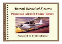 Aircraft Electrical Systems Princeton Airport Flying Tigers Presented by Ernie Schirmer Why Study Electrical Systems? · To enable a pilot to get a better understanding of how the aircraft’s electrical system operates which will enable the pilot to maintain and operate the aircraft more safely and respond more confidently to emergencies. Learning Objectives · Objectives To present an overview of basic electrical concepts (e.g. voltage, current and resistance). To review which aircraft instruments are typically electrically powered. To understand the electrical system of simple aircraft To review failure modes and simple troubleshooting techniques. Preventive Maintenance What Maintenance Can An Owner or Pilot Perform? FAR 43.3(g) “The holder of a pilot certificate issued under Part 61 may perform preventive maintenance on any aircraft owned or operated by that pilot which is not used under Part 121, 129, or 135.” Based on 14 CFR Ch. 1 (1-1-03) Edition What Maintenance Can An Owner or Pilot Perform? FAR 43.13(a) “Each person performing maintenance … shall use the methods, techniques, and practices prescribed in the current manufacturer’s maintenance manual or Instruction for Continued Airworthiness prepared by its manufacturer, or other methods, techniques, and practices acceptable to the Administrator except as noted in Section 43.16.” What Maintenance Can An Owner or Pilot Perform? FAR 43.13(a) “He shall use the tools, equipment, and test apparatus necessary to assure completion of the work in accordance with accepted industry practices. If special equipment or test apparatus is recommended by the manufacturer involved, he must use that equipment or apparatus or its equivalent acceptable to the Administrator.” What Maintenance Can An Owner or Pilot Perform? FAR 43.13(b) “Each person … performing preventive maintenance, shall do that work in such a manner and use materials of such a quality, that the condition of the aircraft … worked on will be at least equal to its original or properly altered condition … ” What Maintenance Can An Owner or Pilot Perform? FAR 43 Appendix A (c) “Preventive Maintenance is limited to the following work, provided it does not involve complex assembly operations: (16) Troubleshooting and repairing broken circuits in landing light wiring circuits. (17) Replacing bulbs, reflectors, and lenses of position and landing lights. (24) Replacing and servicing batteries.” What Maintenance Can An Owner or Pilot Perform? FAR 43 Appendix A (30) “The inspection and maintenance tasks prescribed and specifically identified as preventive maintenance in a primary category aircraft type certificate or supplemental type certificate holder’s approved special inspection and preventive maintenance program when accomplished on a primary category aircraft … “ The Paperwork FAR 43.9 (a) “ … each person who … performs preventive maintenance … shall make an entry in the maintenance record of that equipment containing the following information: (1) a description … of work done. (2) the date of completion of the work (3) the name of the person performing the work …“ The Panel Mechanical Instruments Attitude Indicator Airspeed Vertical speed Directional Gyro Oil pressure Tachometer Suction gage Magnetic compass Stall warning Electrically-powered Instruments Pitot heater Oil temp gage Exhaust gas temperature (EGT) Fuel gages Engine hour meter (“Hobbs”) Turn-and-Slip indicator Turn coordinator Clock The Manual Cessna 172N Manual Cessna 172N Manual Cessna 172N Manual Electrical Concepts Electrical Units of Measure Voltage (pressure) ± unit of measure is the Volt Current (flow) ± unit of measure is the Ampere (amp) Resistance (friction) ± unit of measure is the Ohm Power (force) ± unit of measure is the Watt Electrical Symbols Voltage – Voltage symbol is traditionally “E” for ElectroMotive Force (EMF) Current – Current symbol is traditionally “I” for Intensity Resistance – Resistance symbol is “R” in equations and the Greek symbol omega Ω for values Power – Power symbol may be “P”ower or “W”atts The Equations E = I*R Voltage = Current times Resistance P = E*I Watts = Voltage times Current Landing Light Problem Switch 24-volt Battery What is the resistance (in ohms) of the landing light? Landing 9 Amps Light What is the power (wattage) Actual return path is via aircraft skin of the landing light? Landing Light Resistance Calculation E = I*R 24 = 9*R 24/9 = 9*R/9 2.7 ohms = R The resistance of the landing light is 2.7 Ω Landing Light Power Calculation P = E*I P = 24*9 P = 216 watts Landing Light Schematic Starter Motor Problem Starter Relay Contacts Ignition Switch 24-volt Battery What happens Starter if the Motor resistance of the relay 150 Amps contacts increases from Starter 0.01 ohms to .1 Relay ohms? Coil Starter Motor Voltage Drop Calculation Part 1 E = IR E = 150*0.01 E = 1.5 volts 24 - 1.5 = 22.5 volts available to starter motor Starter Motor Voltage Drop Calculation Part 2 E = IR E = 150*0.1 E = 15 volts 24 - 15 = 9 volts available to starter motor Starter Motor Power Calculation P = E*I P = 24*150 P = 3,600 Watts 746 watts = 1 horsepower 3,600 watts = 4.83 HP at 100% efficiency What Power Does It Take? Nav/Comm – ~ 1 amp receive – ~ 3 amps transmit Transponder – ~ 2 amps ADF – ~ 1 amp What Takes The Most Power? Heating loads (typically continuous) – Pitot heater (~ 3 amps) – Windscreen heater Motor loads (intermittent) – flaps (~ 9 amps) – landing gear Incandescent lamps – landing light (~ 9 amps) – position lights (~ 2.5 amps) Aircraft Batteries Batteries: Failure Mode Analysis Mechanical – Vibration Thermal – Heat Chemical – Normal chemistry of charge/discharge cycles Electrical – Deep cycling – Overcharging Typical Cessna Batteries Typical Cessna Batteries Spill-proof Vented Battery Cap Typical Cessna Battery (Gill) Unsealed wet lead-acid with non-spill vent caps