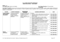 K to 12 BASIC EDUCATION CURRICULUM SENIOR HIGH SCHOOL – CORE SUBJECT Grade: 11/12 Core Subject Title: Statistics and Probability No. of Hours/Semester: 80 hours/semester Prerequisite: Core Subject Description: At the end of the course, the students must know how to find the mean and variance of a random variable, to apply sampling techniques and distributions, to estimate population mean and proportion, to perform hypothesis testing on population mean and proportion, and to perform correlation and regression analyses on real-life problems. CONTENT Random Variables and Probability Distributions Normal Distribution CONTENT STANDARDS The learner demonstrates understanding of key concepts of random variables and probability distributions. The learner demonstrates understanding of key concepts of normal probability distribution. PERFORMANCE STANDARDS The learner is able to apply an appropriate random variable for a given real-life problem (such as in decision making and games of chance). The learner is able to accurately formulate and solve real-life problems in different disciplines K to 12 Senior High School Core Curriculum – Statistics and Probability December 2013 LEARNING COMPETENCIES CODE 1. illustrates a random variable (discrete and continuous). M11/12SP-IIIa-1 2. distinguishes between a discrete and a continuous random variable. M11/12SP-IIIa-2 3. finds the possible values of a random variable. M11/12SP-IIIa-3 4. illustrates a probability distribution for a discrete random variable and its properties. M11/12SP-IIIa-4 5. constructs the probability mass function of a discrete random variable and its corresponding histogram. M11/12SP-IIIa-5 6. computes probabilities corresponding to a given random variable. M11/12SP-IIIa-6 7. illustrates the mean and variance of a discrete random variable. M11/12SP-IIIb-1 8. calculates the mean and the variance of a discrete random variable. M11/12SP-IIIb-2 9. interprets the mean and the variance of a discrete random variable. M11/12SP-IIIb-3 10. solves problems involving mean and variance of probability distributions. M11/12SP-IIIb-4 The learner … The learner … 11. illustrates a normal random variable and its characteristics. 12. constructs a normal curve. M11/12SP-IIIc-1 M11/12SP-IIIc-2 Page 1 of 7 CONTENT Sampling and Sampling Distributions CONTENT STANDARDS The learner demonstrates understanding of key concepts of sampling and sampling distributions of the sample mean. K to 12 BASIC EDUCATION CURRICULUM SENIOR HIGH SCHOOL – CORE SUBJECT PERFORMANCE LEARNING COMPETENCIES STANDARDS involving normal 13. identifies regions under the normal curve distribution. corresponding to different standard normal values. The learner is able to apply suitable sampling and sampling distributions of the sample mean to solve real-life problems in different disciplines. M11/12SP-IIIc-4 15. computes probabilities and percentiles using the standard normal table. M11/12SP-IIIc-d1 The learner … 1. illustrates random sampling. 2. distinguishes between parameter and statistic. 3. identifies sampling distributions of statistics (sample mean). 4. finds the mean and variance of the sampling distribution of the sample mean. 5. defines the sampling distribution of the sample mean for normal population when the variance is: (a) known (b) unknown 7. defines the sampling distribution of the sample mean using the Central Limit Theorem. 8. solves problems involving sampling distributions of the sample mean. The learner demonstrates understanding of key concepts of estimation of population mean and The learner is able to estimate the population mean and population proportion to make sound K to 12 Senior High School Core Curriculum – Statistics and Probability December 2013 M11/12SP-IIIc-3 14. converts a normal random variable to a standard normal variable and vice versa. 6. illustrates the Central Limit Theorem. Estimation of Parameters CODE M11/12SP-IIId-2 M11/12SP-IIId-3 M11/12SP-IIId-4 M11/12SP-IIId-5 M11/12SP-IIIe-1 M11/12SP-IIIe-2 M11/12SP-III-3 M11SP-IIIe-f-1 The learner … 1. illustrates point and interval estimations. M11/12SP-IIIf-2 2. distinguishes between point and interval estimation. M11/12SP-IIIf-3 Page 2 of 7 CONTENT CONTENT STANDARDS population proportion. K to 12 BASIC EDUCATION CURRICULUM SENIOR HIGH SCHOOL – CORE SUBJECT PERFORMANCE LEARNING COMPETENCIES STANDARDS inferences in real-life 3. identifies point estimator for the population mean. problems in different disciplines. 4. computes for the point estimate of the population mean. 5. identifies the appropriate form of the confidence interval estimator for the population mean when: (a) the population variance is known, (b) the population variance is unknown, and (c) the Central Limit Theorem is to be used. 9. illustrates the t-distribution. M11/12SP-IIIf-4 M11/12SP-IIIf-5 M11/12SP-IIIg-1 M11/12SP-IIIg-2 10. constructs a t-distribution. M11/12SP-IIIg-3 11. identifies regions under the t-distribution corresponding to different t-values. M11/12SP-IIIg-4 11. identifies percentiles using the t-table. M11/12SP-IIIg-5 12. computes for the confidence interval estimate based on the appropriate form of the estimator for the population mean. 13. solves problems involving confidence interval estimation of the population mean. M11/12SP-IIIh-1 M11/12SP-IIIh-2 14. draws conclusion about the population mean based on its confidence interval estimate. M11/12SP-IIIh-3 15. identifies point estimator for the population proportion. M11/12SP-IIIi-1 16. computes for the point estimate of the population proportion. M11/12SP-IIIi-2 17. identifies the appropriate form of the confidence interval estimator for the population proportion based on the Central Limit Theorem. 18. computes for the confidence interval estimate of the population proportion. 19. solves problems involving confidence interval estimation of the population proportion. K to 12 Senior High School Core Curriculum – Statistics and Probability December 2013 CO