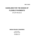 IRC:37-2018 GUIDELINES FOR THE DESIGN OF FLEXIBLE PAVEMENTS (Fourth Revision) INDIAN ROADS CONGRESS Kama Koti Marg, Sector-6, R.K. Puram, New Delhi-110 022 NOVEMBER, 2018 IRC:37-2018 First Published : Reprinted : First Revision : Reprinted : Reprinted : Second Revision : Reprinted : Reprinted : Reprinted : Reprinted : Reprinted : Reprinted : Reprinted : Reprinted : Reprinted : Third Revision : Fourth Revision : September, 1970 December, 1976 December, 1984 October, 1990 (Incorporates Amendment No. 1, September 1988) April, 1995 July, 2001 March, 2002 July, 2004 April, 2005 June, 2006 June, 2007 December, 2007 September, 2008 October, 2009 July, 2011 July, 2012 November, 2018 (All Rights Reserved. No part of this publication shall be reproduced, translated or transmitted in any form or by any means without the permission of the Indian Roads Congress) Contents ABBREVIATIONS AND SYMBOLS ........................................................................................... v 1 INTRODUCTION .................................................................................................................. 1 2 SCOPE .................................................................................................................................... 3 3 DESIGN PRINCIPLES .......................................................................................................... 3 4 TRAFFIC .............................................................................................................................. 13 4.1 General ........................................................................................................................... 13 4.2 Traffic growth rate ......................................................................................................... 14 4.3 Design period ................................................................................................................. 14 4.4 Vehicle damage factor .................................................................................................... 15 4.5 Lateral distribution of commercial traffic over the carriageway.................................... 17 4.6 Computation of design traffic ........................................................................................ 17 5 PAVEMENT COMPOSITIONS .......................................................................................... 18 6 SUBGRADE ......................................................................................................................... 19 7 8 9 6.1 General ........................................................................................................................... 19 6.2 Selection of dry density and moisture content for laboratory testing of subgrade material 19 6.3 Resilient modulus of the subgrade ................................................................................. 20 6.4 Effective modulus/CBR for design ................................................................................ 20 SUB-BASES ......................................................................................................................... 21 7.1 General ........................................................................................................................... 21 7.2 Granular (unbound) sub-base layer ................................................................................ 21 7.3 Cementitious (cement treated) sub-base (CTSB) layer .................................................. 24 BASES .................................................................................................................................. 25 8.1 Unbound base layer ........................................................................................................ 25 8.2 Cementitious bases (CTB) ............................................................................................. 26 8.3 Crack relief layer ............................................................................................................ 27 8.4 Bitumen emulsion/foamed bitumen treated reclaimed asphalt pavement (RAP) base .. 28 BITUMINOUS LAYERS ..................................................................................................... 28 9.1 General ........................................................................................................................... 28 9.2 Resilient modulus of bituminous mixes ......................................................................... 30 ii 10 LONG-LIFE PAVEMENTS ................................................................................................. 33 11 PAVEMENT DESIGN PROCEDURE ................................................................................. 34 12 PAVEMENT STRUCTURAL DESIGN CATALOUGES .................................................. 36 13 DESIGN IN FROST AFFECTED AREAS .......................................................................... 61 14 QUALITY CONTROL TESTS DURING CONSTRUCTION ............................................ 62 15 REFERENCES ..................................................................................................................... 63 APPENDIX-A............................................................................................................................... 66 Appendix A: The principles and approach followed in these guidelines ..................................... 67 A.1 An overview ................................................................................................................... 67 A.2 Cracking in bituminous layers........................................................................................ 67 A.3 Rutting in bituminous pavements ................................................................................... 69 A.4 Structural analysis of pavement ..................................................................................... 70 A.5 Effect of