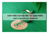 GIỚI THIỆU CƠ HỘI ĐẦU TƯ TRÁI PHIẾU CÔNG TY CỔ PHẦN KINH DOANH F88 TIÊU ĐIỂM CHÍNH 1 Thông tin chung về trái phiếu phát hành 2 Thông tin về tổ chức phát hành 3 Kế hoạch kinh doanh & Dòng tiền trả nợ 4 Quản trị dòng tiền, bảo lãnh thanh toán & cam kết của TCPH 5 Các bước đăng ký đầu tư Trái phiếu 1 THÔNG TIN CHUNG VỀ TRÁI PHIẾU PHÁT HÀNH TRÁI PHIẾU F88 – KÊNH ĐẦU TƯ HIỆU QUẢ & AN TOÀN Lãi suất hấp dẫn 12,5% Kỳ hạn ngắn 12 tháng Quyền bán lại Trái phiếu Cam kết hiệu quả hoạt động EBITDA/Dư nợ cho vay Khách hàng 09 tháng 1,45% /tháng Toàn bộ dòng tiền hoạt động của TCPH được kiểm soát bởi Đại lý quản lý tài khoản – thanh toán và quản lý dòng tiền là môt ngân hàng TMCP có uy tín và kinh nghiệm Bảo lãnh thanh toán bởi Công ty CP Đầu tư F88 – Đơn vị có tỷ lệ sở hữu của NĐT nước ngoài là các tổ chức tài chính có tên tuổi trên 51% (Mekong Capital 42% và Granite Oak: 12,5%) Các cổ đông lớn của CTCP Đầu tư F88 cùng cam kết nắm giữ tối thiểu 75% vốn điều lệ của Công ty này trong suốt thời hạn Trái Phiếu TRÁI PHIẾU F88 – CÁC TỔ CHỨC THAM GIA GIAO DỊCH UY TÍN Đơn vị tư vấn Đại lý QL tài khoản, thanh toán & dòng tiền Đại lý phát hành Đơn vị tư vấn luật Đại lý đăng ký lưu ký Đơn vị kiểm toán CÁC ĐIỀU KIỆN VÀ ĐIỀU KHOẢN CHÍNH ĐỢT 2 Tên Trái phiếu Trái phiếu Công ty Cổ phần Kinh doanh F88 Mã Trái phiếu F88BOND2019-022 Tổng mệnh giá TP phát hành Đợt 2 Lên tới 50 tỷ đồng trong tổng số phát hành cả 3 đợt là 200 tỷ đồng Mệnh giá TP 100.000 đồng/Trái Phiếu Ngày Phát Hành Đợt 2 Tháng 03/2020 Kỳ Hạn 12 tháng kể từ Ngày Phát Hành Đợt 2 Mục đích phát hành Tăng quy mô vốn hoạt động của doanh nghiệp Lãi suất 12,5%/năm Kỳ tính lãi và trả lãi 3 tháng/lần Loại hình Trái Phiếu Trái Phiếu không chuyển đổi, không có bảo đảm, được bảo lãnh thanh toán bởi CTCP Đầu tư F88 Mua lại Trái phiếu trước hạn Sau 09 (chín) tháng kể từ Ngày Phát Hành mỗi đợt, mỗi Người Sở Hữu Trái Phiếu có thể đề nghị Tổ Chức Phát Hành mua lại một phần hoặc toàn bộ các Trái Phiếu do mình sở hữu 2 THÔNG TIN VỀ TỔ CHỨC PHÁT HÀNH ĐIỂM NHẤN DOANH NGHIỆP Tiên phong trong hoạt động kinh doanh tài chính cá nhân tại Việt Nam Tốc độ tăng trưởng ấn tượng Ban điều hành có năng lực và kinh nghiệm quản trị Hệ thống định giá Tài sản cầm cố minh bạch và theo tiêu chuẩn quốc tế về định giá tài sản HOẠT ĐỘNG KINH DOANH CỦA F88 Ngern Tid Lor: F88 hướng đến tập khách hàng ưa thích việc vay, mượn nhanh chóng, tiện lợi, với nhu cầu khoản vay nhỏ (rơi vào vùng đệm giữa nhu cầu cho vay của ngân hàng và của các công ty tài chính tiêu dùng), không muốn thực hiện các thủ tục vay phức tạp. Công ty tiên phong, có lịch sử hơn 30 năm trong lĩnh vực tài chính vi mô tại Thái Lan với hệ thống hơn 950 phòng giao dịch trên khắp đất nước Thái Lan. F88 là doanh nghiệp đi tiên phong tại thị trường Việt Nam với mô hình Hệ thống cầm cố và hướng đến xây dựng mô hình hệ thống cầm đồ như Ngern Tid Lor HOẠT ĐỘNG KINH DOANH CỦA F88 (tiếp) Hà Nội Hải Phòng Vĩnh Phúc Bắc Ninh Bắc Giang Thanh Hóa Hệ thống cửa hàng cửa hàng của F88 trên toàn quốc tăng gần 3 lần, tổng doanh thu tăng hơn 6 lần chỉ sau hơn 1 năm 160,000 1,389 1,408 1600 140,000 1400 120,000 1200 100,000 1000 80,000 623 60,000 40,000 20,000 - 140,797 37 800 600 400 23,058 2017 Doanh thu Tp. Hồ Chí Minh Đồng Nai Bình Dương 63,898 46 2018 Số cửa hàng 100 200 0 9T.2019 Doanh thu/cửa hàng Đơn vị: Triệu đồng SẢN PHẨM CHO VAY Tỷ lệ Giá trị giải ngân Lãi suất Từ 50%-80% giá trị định giá tài sản (*) Lên tới 2 tỷ đồng Lên tới 300.000.000 VND Lãi suất cho vay dưới 20%/năm, chưa bao gồm chi phí lưu kho, chi phí thẩm định tài sản (*) Được định giá bởi hệ thống định giá online được xây dựng tự động bằng trí tuệ nhân tạo và kiểm soát bộ phận định giá của DN theo các tiêu chuẩn quốc tế, công khai minh bạch. Khách hàng có thể kiểm tra giá trị tài sản định giá của mình bất cứ thời điểm nào SẢN PHẨM CHO VAY (tiếp) Thời hạn vay 143 ngày 277 ngày 50 ngày Loại tài sản cầm cố Xe Xe Cầm cố trực tiếp tài sản Thời gian xử lý hồ sơ 30-45 phút 5-20 phút 15-20 phút KẾT QUẢ KINH DOANH 92,395 DOANH THU VÀ CÁC NGUỒN THU (triệu đồng) 29,343 1,515 8,934 Cầm cố xe máy 25,081 13,824 Cầm cố ô tô lần so với 5,972 năm 2017 742 6T cuối năm 2016 Năm 2017 Doanh thu và các nguồn thu của TCPH trong năm 2018 tăng 3,4 Năm 2018 9T. 2019 KẾT QUẢ KINH DOANH 20,139 19,154 DOANH THU VÀ CÁC NGUỒN THU (triệu đồng) 7,757 1,957 Cầm cố tài sản khác 28,336 26,906 9T.2019 tăng 1,8 lần so với cả năm 2018 4,020 Nguồn thu khác 455 6T cuối năm 2016 Năm 2017 Doanh thu và các nguồn thu của TCPH trong Năm 2018 9T. 2019 BAN ĐIỀU HÀNH Ông: Phùng Anh Tuấn Chủ tịch HĐQT kiêm TGĐ Ông Tuấn là người sáng lập ra F88 và là TGĐ điều hành toàn bộ hoạt động của F88. Hiện ông Tuấn đang nắm giữ 40% cp của CTCP Đầu tư f88 – Công ty mẹ của F88 Ông: Nguyễn Văn Tuyên 