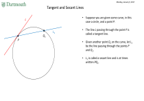 Monday, January 9, 2017 Tangent and Secant Lines • Suppose you are given some curve, in this case a circle, and a point P. L P Q1 L1 • The line L passing through the point P is called a tangent line. • Given another point Q1 on the curve, let L1 be the line passing through the points P and Q1. • L1 is called a secant line and is at times written PQ1. Monday, January 9, 2017 Tangent and Secant Lines L2 L • Pick a point Q2 closer to P. Q2 P Q1 • Notice that the slope of the secant line L2 is closer to the slope of L compared to the slope of L1. L1 • In fact, as we pick points closer and closer to P, the slope of the associated secant lines will get closer and closer to the slope of L. Q: So, how can we differentiate between secant lines and tangent lines? Is it enough to say that a tangent line goes through one point, while a secant line goes through two points? A: No! Tangent and Secant Lines • L is the tangent line to P, even though it intersects the curve more than once. P L • However, we can remedy this by saying that there is a neighborhood of the point P for which L doesn’t intersect the curve at any other point within this neighborhood. Q: Is this enough? Do we have enough information now to distinguish between tangent and secant lines? A: Not quite. Tangent and Secant Lines L1 P • L1 is a secant line for the curve through the point P. • We can find a neighborhood of P such that L1 doesn’t intersect any other point of the curve within the neighborhood. What then is the real distinction between tangent lines and secant lines? Tangent and Secant Lines P • If we zoom in on the point P, the curve at P starts to look more and more like the tangent line at P. L • We can think of the tangent line as a linear approximation of the curve at P. • The notion of linear approximation is a really powerful tool in math. We will study it a bit later in the course. Warning: The tangent line to a curve at a given point may NOT exist. This is equivalent to saying that there is no good linear approximation of the curve at the given point. Ex: Cusps P L No matter how close we zoom in, L will never give a linear approximation of the curve at the point P. Tangent and Secant Lines L P • If we zoom in on the point P, the curve at P starts to look more and more like the tangent line at P. • We can think of the tangent line as a linear approximation of the curve at P. • The notion of linear approximation is a really powerful tool in math. We will study it a bit later in the course. P L1 • A secant line through the point P, on the other hand, doesn’t give a linear approximation of the curve at P. • Nonetheless, secant lines have their use! Quick Review of Lines L • Recall that the equation of a line is of the form y = mx + b, where m is the slope and b is the y-intercept. • Let L be a line, (x1,y1) and (x2,y2) two points on L such that x2 > x1. y2 (x2,y2) y2 – y1 y1 (x1,y1) • The slope m = (y2 - y1)/(x2 – x1). • To find the y-intercept, plug in either (x1,y1) or (x2,y2) into the equation y = mx + b and solve for b. x2 – x1 x1 x2 Quick Review of Lines Ex: Find the equation of the line passing through the points (5,7) and (1,8). • Since 5 > 1, the slope is given by: m = (7-8)/(5-1) = -1/4 • Thus, the equation of the line is going to be of the form: y = (-1/4)x + b • Since the point (1,8) is on the line, it must be that 8 = (-1/4)(1) + b which means that b = 33/4 • Hence, the equation of the line is given by y = (-1/4)x + 33/4 Quick Review of Lines: Class Problems. Question 1: What is the slope of the line passing through (1,1) and (2,4)? Question 2: What is the slope of the line passing through (1,1) and (a,a2), for a ≠ 1? Calculating Tangent and Secant Lines f f(b) • Suppose you are given the graph of a function f and a secant line through points (a,f(a)) and (b,f(b)). • We can calculate the equation of the secant line using the technique we reviewed in the previous slide. f(a) • The slope is given by: m=(f(b) – f(a))/(b – a) a b Calculating Tangent and Secant Lines f f(a + h) • Suppose you are given the graph of a function f and a secant line through points (a,f(a)) and (b,f(b)). • We can calculate the equation of the secant line using the technique we reviewed in the previous slide. f(a) • The slope is given by: m=(f(b) – f(a))/(b – a) a a+h • Since b = a + h, for some quantity h, we can replace the formula for the slope by m = (f(a + h) – f(a))/((a + h) – a) = (f(a + h) – f(a))/h Slope of the secant line = Calculating Tangent and Secant Lines Slope of the secant line = f(a) a • If we allow the quantity h to get smaller, the point (a+h,f(a+h)) is getting closer to (a,f(a)), which in turn means that the slope of the secant line through (a+h,f(a+h)) is getting closer to the slope of the tangent line at (a,f(a)). • Thus, the slope of the tangent line is given by taking the limit as h goes to 0. Slope of the tangent line at (a,f(a)) = Calculating Tangent and Secant Lines Ex: Calculate the equation of the tangent line of f(x)=x3 at the point (2,8). • The slope of the tangent line is given by: limh→0 ! !!! !!(!) = limh→0 = limh→0 ! • Given that the slope is 12, we can plug in the point (2,8) to find the y(2 + ℎ)! −2! intercept ℎ 8 = 12(2) + b, and so b = -16 !!!"#! !"! ! !! !! = limh→0 ! !"#! !"! ! !! ! = limh→0 (12 + 6h + h2) = 12 • Thus, the equation of the line is given by y = 12x -16. Calculating Tangent and Secant Lines: Class Problems Consider the function f(x) = x2 Question 3: What is the slope of the line passing through (1,1) and (1 + h,(1 + ℎ)! )? Question 4: What is the slope and equation of the tangent line at (1,1)? Question 5: What is the slope and equation of the tangent line at (a,a2)? Limits of Functions L f • Given a function f, and a number a, the limit of f as x approaches a is the value, L, f(x) approaches as x goes to a. • In this case, we write limx→a f(x) = L a Lim