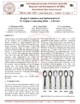 International Journal of Trend in Scientific Research and Development (IJTSRD) International Open Access Journal ISSN No: 2456 - 6470 | www.ijtsrd.com | Volume - 2 | Issue – 3 Design Evaluation and Optimization of IC Engine Connecting Rods – A Review N. Mohammed Raffic Assistant Professor, Nehru Institute of Technology, Coimbatore, Tamil Nadu, India Dr. K. Ganesh Babu Dean, Bharath Institute of Engineering & Technology, Hyderabad, Telangana, India K. N. Arun Kumar Assistant Professor, Nehru Institute of Technology, Coimbatore, Tamil Nadu, India ABSTRACT Fatigue analysis and Optimization of connecting rod are the modern trend in automotive engineering industry emphasis on many parameters like total deformation, life, factor of safety, stress biaxiality and fatigue sensitivity. The main scope of this work comprises detailed review on various methods and procedures adopted by different researchers in Fatigue analysis of commercially used Engine Connecting rod. The objective of conducting fatigue analysis varies from each other like Weight reduction, Cost reduction, Shape hape optimization and fatigue life calculation at varying boundary conditions and loads. Fatigue analysis has a very dominant position in product design and development as more than 50% of the products, structural failures are due to fatigue concept only. The review have emphasized the importance of conducting the fatigue analysis of the connecting rod to identity its critical points, fatigue life and factor of safety etc., for its better performance and life period extension. The Connecting rod of IC engine is a crucial component of high volume production. Connecting rod acts as a link between piston and crankshaft to transfer the reciprocating ciprocating motion of piston to rotary motion of connecting rod as well power and energy. The forces acting over a connecting rod during engine operation are 1. Force on the piston due to gas pressure and inertia of the reciprocating parts 2. Force due to inertia of the connecting rod 3. Force due to friction of the piston rings and of the piston 4. Force due to the friction of the piston pin bearing and crank pin bearing. The connecting rod is generally made with I section to provide maximum rigidity with minimum weight [4] and the stress distribution is even in I sections when comparing to the other cross sections. The Fig 1.0 shows the various sections used for design and production of a connecting rod. Keywords: ANSYS, Fatigue Life, GLARE, Stress Biaxiality 1. INTRODUCTION The Life, sensitivity and Maximum durability of any engineering component has become a common desire of any customer with no doubt. Product design and development has many phases out of which analysis of a product with varying objective have more importance. e. Product analysis can be different types like Static, Dynamic, Fatigue, Harmonic and so on. Fig 1.0 Different Cross Sections for Connecting Rod Ro @ IJTSRD | Available Online @ www.ijtsrd.com | Volume – 2 | Issue – 3 | Mar-Apr Apr 2018 Page: 88 International Journal of Trend in Scientific Research and Development (IJTSRD) ISSN: 2456-6470 Fatigue analysis has a predominant position in engineering analysis as 50-90% of the components fail due to fatigue [5]. Fatigue may occur when a member is subjected to repeated cyclic loadings. Structures subjected to repeated cyclic loadings can undergo progressive damage which shows itself by the propagation of cracks. This damage is called fatigue and is represented by a loss of resistance with time. A number of factors influence the fatigue life of a component in service, viz., (i) complex stress cycles, (ii) engineering design, (iii) manufacturing and inspection, (iv) service conditions and environment and (v) material of construction [2].The authors have reported that the fatigue analysis can be classified in to three areas 1. Materials 2. Analysis and 3. Results evaluation. The Fig 2.0 shows an Optimized Connecting rod after Fatigue analysis [9]. Fig 2.0 Optimized Connecting Rod after Fatigue Analysis 2. LITERATURE REVIEW M.omid et.al (2008) has made an attempt to analyse the Connecting rod of Universal tractor (U650). The authors have given a clear idea about the fatigue analysis and it’s types in the introduction part of their research work. The authors have adopted continuum mechanics approach in their study for the fatigue crack initiation and Coffin – Manson method is adopted for the analysis in which the relation between the deformations (є) , stresses (σ) and number of loading cycles (N) are considered. The authors have considered the connecting rod with high strength alloy steel as the material and the maximum load that acts over the part will be 9500 N and it has been applied in the form of fully reversed loading which has no mean stress presence. The authors have meshed the connecting rod using 10-node tetrahedral element in ANSYS 7 as the element can provide the results with high degree of accuracy. The load was applied over the connecting rod in both the forms ie. Tensile and compressive to find the maximum values of stress analysis output parameters which may provide a idea for fatigue analysis. The analysis have revealed the critical points of the connecting rod such as end of the shank and area near to piston pin hole (Point 46 in mesh) , lateral and inner face of crank end of the connecting rod and the end of the shank and near to crank hole. The fatigue analysis in conducted with stress concentration coefficient as 1.25 and factor of safety for a design life of 1,000,000 cycles. The authors have concluded that in order to improve the fatigue life of the connecting rod of tractors further the design life cycle may be increased by decreasing the value of stress concentration coefficient and the allowed number of cyclic loading on the connecting rod is found to be 108 cycles. Mohammad Ranjbarkohan et.al (2011) has investigated the Fatigue Analysis of Connecting rod used in Samand Engin
