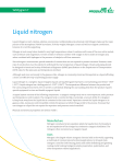 Safetygram 7 Liquid nitrogen Liquid nitrogen is inert, colorless, odorless, noncorrosive, nonflammable, and extremely cold. Nitrogen makes up the major portion of the atmosphere (78.03% by volume, 75.5% by weight). Nitrogen is inert and will not support combustion; however, it is not life supporting. Nitrogen is inert except when heated to very high temperatures, where it combines with some of the more active metals, such as lithium and magnesium, to form nitrides. It will also combine with oxygen to form oxides of nitrogen and, when combined with hydrogen in the presence of catalysts, will form ammonia. Since nitrogen is noncorrosive, special materials of construction are not required to prevent corrosion. However, materials of construction must be selected to withstand the low temperature of liquid nitrogen. Vessels and piping should be designed to American Society of Mechanical Engineers (ASME) specifications or the Department of Transportation (DOT) codes for the pressures and temperatures involved. Although used more commonly in the gaseous state, nitrogen is commonly stored and transported as a liquid, affording a more cost-effective way of providing product supply. Liquid nitrogen is a cryogenic liquid. Cryogenic liquids are liquefied gases that have a normal boiling point below –130°F (–90°C). Liquid nitrogen has a boiling point of –320°F (–196°C). The temperature difference between the product and the surrounding environment, even in winter, is substantial. Keeping this surrounding heat from the product requires special equipment to store and handle cryogenic liquids. A typical system consists of the following components: a cryogenic storage tank, one or more vaporizers, and a pressure and temperature control system. The cryogenic tank is constructed like, in principle, a vacuum bottle. It is designed to keep heat away from the liquid that is contained in the inner vessel. Vaporizers convert the liquid nitrogen to its gaseous state. A pressure control manifold controls the pressure at which the gas is fed to the process. Processes that use nitrogen as a liquid do not require the vaporizers and pressure control manifold. Physical and chemical properties are listed in Table 1. Manufacture Nitrogen is produced at air separation plants by liquefaction of atmospheric air and separation of the nitrogen by continuous cryogenic distillation. The nitrogen is then recovered as a cryogenic liquid. Uses Nitrogen is the largest volume inorganic chemical sold in the world, supporting a multitude of commercial and technical applications. In its liquid state, nitrogen is used for food freezing, plastic and rubber deflashing and grinding, cooling, metal treating, biological sample preservation, pulverization, and other temperature-related applications. Table 1: Liquid Nitrogen Physical and Chemical Properties Health effects Being odorless, colorless, tasteless, and nonirritating, nitrogen has no warning properties. Humans possess no senses that can detect the presence of nitrogen. Although nitrogen is nontoxic and inert, it can act as a simple asphyxiant by displacing the oxygen in air to levels below that required to support life. Inhalation of nitrogen in excessive amounts can cause dizziness, nausea, vomiting, loss of consciousness, and death. Death may result from errors in judgment, confusion, or loss of consciousness that prevents self-rescue. At low oxygen concentrations, unconsciousness and death may occur in seconds and without warning. Chemical Formula N2 Molecular Weight 28.01 Boiling Point @ 1 atm –320.5°F (–195.8°C) Freezing Point @ 1 atm –346.0°F (–210.0°C) Critical Temperature –232.5°F (–146.9°C) Critical Pressure 492.3 psia (33.5 atm) Density, Liquid @ BP, 1 atm 50.47 lb/scf (808.5 Kg/m3) Density, Gas @ 68°F (20°C), 1 atm 0.0725 lb/scf (1.16 Kg/m3) Specific Gravity, Gas (air=1) @ 68°F (20°C), 1 atm 0.967 Specific Gravity, Liquid (water=1) @ 68°F (20°C), 1 atm 0.808 Specific Volume @ 68°F (20°C), 1 atm 13.80 scf/lb (0.861 m3/kg) Latent Heat of Vaporization 85.6 Btu/lb (199.1 kJ/kg) Expansion Ratio, Liquid to Gas, BP to 68°F (20°C) 1 to 694 Containers Liquid nitrogen is stored, shipped and handled in several types of containers, depending upon the quantity required by the user. The types of containers in use are the dewar, cryogenic liquid cylinder, and cryogenic storage tank. Storage quantities vary from a few liters to many thousands of gallons. Since heat leak is always present, Personnel, including rescue workers, vaporization takes place continuously. should not enter areas where the Rates of vaporization vary, depending oxygen concentration is below 19.5%, on the design of the container and the unless provided with a self-contained volume of stored product. breathing apparatus or air-line respirator. Containers are designed and manufactured according to the applicable For more information on oxygencodes and specifications for the temdeficient atmospheres, consult peratures and pressures involved. Air Products’ Safetygram #17, “Dangers of Oxygen-Deficient Atmospheres.” Extensive tissue damage or burns can result from exposure to liquid nitrogen or cold nitrogen vapors. 2 Dewars Figure 1 illustrates a typical, vacuumjacketed dewar. A loose fitting dust cap over the outlet of the neck tubes prevents atmospheric moisture from plugging the neck and allows gas produced from vaporized liquid to escape. This type of container is a nonpressurized container. The unit of measure for the capacity of a dewar is typically the liter. Five- to 200-liter dewars are available. Product may be removed from small dewars by pouring, while larger sizes will require a transfer tube. Cryogenic liquid cylinders that are pressurized vessels are sometimes incorrectly referred to as dewars. Figure 1: Typical Dewar Cryogenic liquid cylinders Figure 2a: Typical Cryogenic Liquid Cylinder, side view Figure 2 shows a typical cryogenic liquid cylinder. Cryogenic li