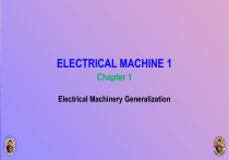 ELECTRICAL MACHINE 1 Chapter 1 Electrical Machinery Generalization ELECTRICAL MACHINE 1 Electrical Machinery Generalization Rotating Electrical Machines • The two (2) most frequently used types for rotating electrical machines are: (a) Generators – mechanical energy is converted into electrical energy. (b) Motor – electrical energy is converted into mechanical energy. ELECTRICAL MACHINE 1 Electrical Machinery Generalization Rotating Electrical Machines ( GENERATOR ) A + Tm S S Te N N B _ ELECTRICAL LOAD APPLICATION CONCEPT OF ALIGNMENT OF TWO MAGNETIC FIELDS ELECTRICAL MACHINE 1 Electrical Machinery Generalization Rotating Electrical Machines S ( MOTOR ) A + S DC SUPPLY v Te N B N _ TL APPLICATION CONCEPT OF ALIGNMENT OF TWO MAGNETIC FIELDS ELECTRICAL MACHINE 1 Electrical Machinery Generalization Rotating Electrical Machines • Two other types of rotating electrical machines not used so often are: rotary converters and frequency converters. Basic Operations: • Electric Generator – it is driven (rotated) by a mechanical machine usually called a prime mover ( can be a steam turbine, a gasoline engine, an electric motor, or even a hand-operated crank). A generator action can take place when, and only when, there is a relative motion between conducting wires (usually copper) and magnetic lines of force. • Electric Motor – it is supplied with electrical energy and develops torque, that is a tendency to produce rotation. ELECTRICAL MACHINE 1 Electrical Machinery Generalization Rotating Electrical Machines • All rotating electric generators consists essentially of two important parts: (1) An even set of electromagnets or permanent magnets. (2) The laminated steel core containing current-carrying copper wires which is called an armature winding. • In dc-generator, the armature winding is mechanically rotated through a stationary magnetic fields created by electromagnets or permanent magnets. • In ac-generator, the electromagnets or the permanent magnets and their accompanying magnetic fields are rotated with respect to the stationary armature winding. • In dc-motor, current is sent into the armature winding, the latter is being placed inside a set of radially supported magnet poles. ELECTRICAL MACHINE 1 Electrical Machinery Generalization Rotating Electrical Machines Field Structure for a dc machine Field Structure for a ac machine FIG 1: Field Structure for a dc generator (rear) and ac machine (foreground) ELECTRICAL MACHINE 1 Electrical Machinery Generalization Rotating Electrical Machines • In the illustration of previous slide: (a) dc-generator – shows many main and commutating poles bolted to the outside yoke; also visible is the brush rigging on the far side. (b) ac-machine – the two rings mounted on the shaft; the two ends of the entire field winding are connected to these rings so that stationary brushes riding on the latter can “feed” direct current into the rotating structure. ELECTRICAL MACHINE 1 Electrical Machinery Generalization Rotating Electrical Machines Wound Stationary armature FIG 2: Wound Stationary armature for a low speed ac generator. A field similar to that depicted of the ac –machine in figure 1 would be rotated inside this frame. ELECTRICAL MACHINE 1 Electrical Machinery Generalization Rotating Electrical Machines FIG 3: DC Motor – The armature commutator and the carbon brushes are clearly visible on the near side. ELECTRICAL MACHINE 1 Electrical Machinery Generalization Rotating Electrical Machines • In an ac motor, current is sent into the armature winding, which is usually placed in a stationary laminated iron core; the rotating element may or may not be set of magnet poles. FIG 4: A rotary converter ELECTRICAL MACHINE 1 Electrical Machinery Generalization Rotating Electrical Machines • A synchronous type, in which a small dc generator is placed on the shaft extension to supply dc excitation to the rotating field. • The rotary converter, electrical energy of one form is changed into electrical energy of another, the usual arrangement is to change ac energy into dc energy although the reverse is sometimes done. FIG 5: A small frequency converter set ELECTRICAL MACHINE 1 Electrical Machinery Generalization Rotating Electrical Machines • The frequency converter, has very limited application; its function is to change ac electrical energy at one frequency into ac electrical energy at another frequency. How to do this? Two rotating machines are directly coupled together; one of them operates as an ac motor when connected to an ac source having a given frequency, while the other, driven machine functions as an ac generator to deliver electrical energy at some other frequency. The stationary part of the ac generator is also connected to an ac source, the same supply to which the motor is connected. ELECTRICAL MACHINE 1 Electrical Machinery Generalization Rotating Electrical Machines DC MACHINES YOKE BRUSH AXIS . . S FIELD WINDING + + _ + + BRUSH + + + . . FIELD N POLES MAIN FIELD AXIS + + + ARMATURE ARMATURE CONDUCTORS APPLICATION CONCEPT OF ALIGNMENT OF TWO MAGNETIC FIELDS ELECTRICAL MACHINE 1 Electrical Machinery Generalization Main Constructional Features 1. BODY OR MAGNETIC FRAME OR YOKE 2. POLE CORE AND POLE SHOES 3. FIELD or EXCITING COILS 4. ARMATURE CORE 5. ARMATURE WINDING 6. COMMUTATOR ELECTRICAL MACHINE 1 Electrical Machinery Generalization Main Constructional Features 7. BRUSHES 8. END HOUSINGS 9. BEARINGS 10. SHAFT ELECTRICAL MACHINE 1 Electrical Machinery Generalization Main Constructional Features Bearing Pulley Brush Body / Yoke End Housing Shaft Armature Commutator Field Core Brush holder Field Winding MAIN CONSTRUCTIONAL FEATURES ELECTRICAL MACHINE 1 Electrical Machinery Generalization Main Constructional Features ARMATURE YOKE + SHAFT FIELD POLE & COIL BRUSH - COMMUTATOR MAIN CONSTRUCTIONAL FEATURES ELECTRICAL MACHINE 1 Electrical Machinery Generalization Main Constructional Features OTHER MECHANICAL PARTS : E