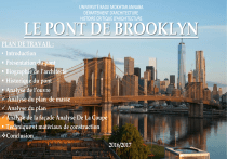 UNIVERSITÉ BADJI MOKHTAR ANNABA DÉPARTEMENT D’ARCHITECTURE HISTOIRE CRITIQUE D’ARCHITECTURE LE PONT DE BROOKLYN PLAN DE TRAVAIL : • Introduction Présentation du pont Biographie de l’architecte Historique du pont Analyse de l’ouvre Analyse du plan de masse Analyse du plan Analyse de la façade Analyse De La Coupe Technique et matériaux de construction Conclusion 2016/2017 INTRODUCTION : Au 19ème siècle(1850 -1940) , le monde a connu une révolution industrielle qui a débutée en Angleterre et s’est diffusée en Europe puis en Amérique, elle a touché tous les domaines et parmi eux : l’architecture qui a entrainé une accélération de l’urbanisation et a provoqué une supériorité technique et économique de société occidentale sur les autres ; les constructions se sont développé , comme les tours, les palaces , les bibliothèque et les ponts tel que le pont de Brooklyn qui n'est pas seulement le plus haut édifice de new York, c'est aussi, à l'époque, le plus long pont suspendu jamais réalisé, et surtout le seul et unique pont de new York et qui est le génie d’une famille d’ingénieurs « John August roebling, son fils Washington et sa femme Emily» . PRÉSENTATION DE L’ŒUVRE: Informations générales Autre nom(s): Début des travaux: Achèvement: Etat: Brooklyn Bridge 1869 24 mai 1883 en service Type de construction Structure: Pont suspendu avec haubans Pont routier (pont-route) Fonction / Pont-tramway / pont-métro utilisation: Passerelle pour piétons Matériau: Pont en acier Informations techniques Dimensions portée principale longueur totale nombre de voies 487 m 1 825 m 1950: 2 x 3 Matériaux câbles tablier tour acier acier maçonnerie Situation de l'ouvrage Lieu: Franchit le/la: A côté de: Coordonnées: Manhattan, New York, New York, EtatsUnis Brooklyn, New York, New York, Etats-Unis East River Manhattan Bridge (1912) 40° 42' 20.00" N 73° 59' 47.00" W La première conception du pont vient de John A. Roebling, mais celui meurt peu avant le commencement de la construction. Son pied est blessé dans un accident de bateau. Son fils, Washington Roebling, continue les travaux. Luimême est paralysé à vie après ses poumons sont endommagé Il reste dans un appartement près du site et sa femme Emily Roebling relie ses instruction aux travailleur. En effet Emily Roebling devient ingénieur-en-chef jusqu'à la fin de la construction du pont. Biographie de l’architecte : John Roebling Né en 1806 à Mühlhausen dans le land de Thuringe, en Allemagne, John Roebling est un pionnier de la conception et de la construction des ponts suspendus et de la fabrication des câbles métalliques. Formé à Berlin, au Gewerbeinstitut, il obtient son diplôme d’ingénieur en 1826 et part pour les États-Unis en 1831. Établi en Pennsylvanie, il participe à la conquête de l’Ouest en réalisant l’étude topographique du tracé des canaux et des routes, dont il supervise ensuite la construction. C’est l’occasion pour lui de commencer à réfléchir à la fabrication de câbles en fils de fer, dont il commence la fabrication à Saxon burg, le hameau qu’il a créé. Décédé le 22 juillet 1869 à Brooklyn new York états unis Washington Augustus Roebling né le 26 /05/ 1837 à Pennsylvanie, et mort le 21/07/1926 à New Jersey, est un ingénieur américain d'origine allemande, connu pour son rôle majeur dans la construction du pont de Brooklyn, construction commencée par son père John Augustus Roebling. Après ses études au Rensselaer Polytechnic Institute à New York, Roebling s’engage auprès de son père pour l’aider dans la construction de ponts. Après avoir servi dans la United States Army pendant la guerre de Sécession, il assiste son père pour la construction du pont de Brooklyn, l’un des plus ambitieux projets d’architecture de l'époque. Il prend la direction du chantier après la mort de son père. Emily Warren Roebling C’est la Femme de Washington Roebling , est née le 23/09/1843 a New York, États-Unis , et décès le 28/02/1903 Elle a étudié mathématique a Université de New York et parmi ses livres Livre : The Journal of the Reverend Silas Constant, Together With Notes on the Nelson, Van Cortlandt, Warren, HISTORIQUE DU PONT Au milieu du XIXe siècle, la ville de New York ne s'étend que sur la partie méridionale de l'île de Manhattan, La circulation des hommes et des marchandises entre les deux villes augmente rapidement pendant cette première moitié du XIXe siècle ; les bacs qui sillonnent l'East River depuis 1640 sont surchargés en permanence et les passagers De part et d'autre, on cherche des solutions pour traverser le bras de mer sans gêner le trafic portuaire ce pont la il avait été question, dès 1800, Depuis le 1807 plusieurs ingénieure et des architectes ont proposées des ponts et a partir de 1850 presque chaque mois une nouvelle suggestion voit le jour : les ponts flottant, levant, suspendus, ponts de toutes sortes. En 1867, au cours d'un hiver terrible, le trafic est interrompu et cinq mille personnes tentent la traversée à pied, sur la glace ; du coup, l'État de New York autorise la création d'une société financière pour la construction du pont Le pont sera conçu et dessiné par un homme de soixante ans, qui a déjà réfléchi au problème de la traversée de l'East River et jouit d'une excellente réputation scientifique et morale, John August Roebling, propose le projet du pont entre Brooklyn et Manhattan dès 1847. Et a dessiné les plans du pont de Brooklyn et qui a créer le câble métallique : Ce n'est qu'en 1867 qu'il est chargé du projet puis a trouvé la mort suite à un accident lors des travaux (il meurt de Tétanos). Il n’a jamais vu l’achèvement du pont. Après sa mort, son fils Washington Roebling a mené le projet à son terme aidé de sa femme Emily Warren Roebling. Il fut, lui aussi, victime d’un grave accident et il a dû suivre C’est sa femme Emily s