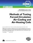 ANSI/ASHRAE Standard 33-2016 (Supersedes ANSI/ASHRAE Standard 33-2000) Methods of Testing Forced-Circulation Air-Cooling and Air-Heating Coils Approved by ASHRAE on March 31, 2016, and by the American National Standards Institute on April 1, 2016. ASHRAE Standards are scheduled to be updated on a five-year cycle; the date following the Standard number is the year of ASHRAE approval. The latest edition of an ASHRAE Standard may be purchased on the ASHRAE website (www.ashrae.org) or from ASHRAE Customer Service, 1791 Tullie Circle, NE, Atlanta, GA 30329-2305. E-mail: orders@ashrae.org. Fax: 678539-2129. Telephone: 404-636-8400 (worldwide) or toll free 1-800-527-4723 (for orders in US and Canada). For reprint permission, go to www.ashrae.org/permissions. © 2016 ASHRAE ISSN 1041-2336 Includes test data forms available online. ASHRAE Standard Project Committee 33 Cognizant TC: 8.4, Air-to-Refrigerant Heat Transfer Equipment SPLS Liaison: John A. Clark Ram Narayanamurthy, Chair* Gary W. Price*Vice-Chair Jose A. Perez-Galindo* Secretary John E. Bade Harold Dubensky William Burgess Fox* Byron B. Hagan, Sr.* Shaobo Jia* Michael Kaler Todd A. Michael Kashif Nawaz Mary Opalka Brent Pearce Kevin Peck Josef Schmidt Jerry Sipes Christopher Stone Glenn Wilson Lauren Zelinski * Denotes members of voting status when the document was approved for publication ASHRAE STANDARDS COMMITTEE 2015–2016 Douglass T. Reindl, Chair Rita M. Harrold, Vice-Chair James D. Aswegan Niels Bidstrup Donald M. Brundage John A. Clark Waller S. Clements John F. Dunlap James W. Earley, Jr. Keith I. Emerson Steven J. Emmerich Julie M. Ferguson Walter T. Grondzik Roger L. Hedrick Srinivas Katipamula Rick A. Larson Lawrence C. Markel Arsen K. Melikov Mark P. Modera Cyrus H. Nasseri Heather L. Platt David Robin Peter Simmonds Dennis A. Stanke Wayne H. Stoppelmoor, Jr. Jack H. Zarour Julia A. Keen, BOD ExO James K. Vallort, CO Stephanie C. Reiniche, Senior Manager of Standards SPECIAL NOTE This American National Standard (ANS) is a national voluntary consensus Standard developed under the auspices of ASHRAE. Consensus is defined by the American National Standards Institute (ANSI), of which ASHRAE is a member and which has approved this Standard as an ANS, as “substantial agreement reached by directly and materially affected interest categories. This signifies the concurrence of more than a simple majority, but not necessarily unanimity. Consensus requires that all views and objections be considered, and that an effort be made toward their resolution.” Compliance with this Standard is voluntary until and unless a legal jurisdiction makes compliance mandatory through legislation. ASHRAE obtains consensus through participation of its national and international members, associated societies, and public review. ASHRAE Standards are prepared by a Project Committee appointed specifically for the purpose of writing the Standard. The Project Committee Chair and Vice-Chair must be members of ASHRAE; while other committee members may or may not be ASHRAE members, all must be technically qualified in the subject area of the Standard. Every effort is made to balance the concerned interests on all Project Committees. The Senior Manager of Standards of ASHRAE should be contacted for a. interpretation of the contents of this Standard, b. participation in the next review of the Standard, c. offering constructive criticism for improving the Standard, or d. permission to reprint portions of the Standard. DISCLAIMER ASHRAE uses its best efforts to promulgate Standards and Guidelines for the benefit of the public in light of available information and accepted industry practices. However, ASHRAE does not guarantee, certify, or assure the safety or performance of any products, components, or systems tested, installed, or operated in accordance with ASHRAE’s Standards or Guidelines or that any tests conducted under its Standards or Guidelines will be nonhazardous or free from risk. ASHRAE INDUSTRIAL ADVERTISING POLICY ON STANDARDS ASHRAE Standards and Guidelines are established to assist industry and the public by offering a uniform method of testing for rating purposes, by suggesting safe practices in designing and installing equipment, by providing proper definitions of this equipment, and by providing other information that may serve to guide the industry. The creation of ASHRAE Standards and Guidelines is determined by the need for them, and conformance to them is completely voluntary. In referring to this Standard or Guideline and in marking of equipment and in advertising, no claim shall be made, either stated or implied, that the product has been approved by ASHRAE. CONTENTS ANSI/ASHRAE Standard 33-2016, Methods of Testing Forced-Circulation Air-Cooling and Air-Heating Coils SECTION PAGE Foreword .....................................................................................................................................................................2 1 Purpose.............................................................................................................................................................2 2 Scope ................................................................................................................................................................2 3 Definitions .........................................................................................................................................................2 4 Coil Classification..............................................................................................................................................2 5 Symbols ............................................................................................................................................................4 6 Test Instruments and Calibration ......................................................................................................................5 7 Test
