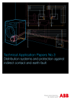 Technical Application Papers No.3 Distribution systems and protection against indirect contact and earth fault Technical Application Papers Distribution systems and protection against indirect contact and earth fault 6.2.1 Miniature circuit-breakers System pro M Index 1 Introduction......................................... 2 2 Main definitions............................... 3 3 Protection against earth fault 3.1 General aspects....................................... 5 4 Classification of electrical distribution systems 4.1 4.2 4.3 4.4 TT system................................................ 6 TN system................................................ 6 IT system................................................. 7 Conclusions............................................. 7 5 Protection against indirect contact 5.1 5.2 5.3 5.4 5.5 Effects of current on human body........... 8 Protection against indirect contact by automatic disconnection of the circuit........... 9 Protection against indirect contact in TT systems ........................................ 13 6.1 6.2 6.2.2 Residual current releases for Tmax 6.3 6.4 transformer............................................ 30 The solution with function G................... 31 Protection function G or residual current . protection?............................................ 33 6.4.1 Typical applications of residual current . ............................................ circuit-breakers 33 6.4.2 Typical applications of moulded-case 6.5 and air circuit-breakers equipped with function G against earth fault.................. 34 Advanced protection systems against earth fault................................................. 34 6.5.1 General aspects..................................... 34 6.5.2 Source Ground Return........................... 35 6.5.3 Restricted Earth Fault Protection............ 35 7 Discrimination of the protections against earth fault......................... 37 Protection against indirect contact in IT systems.......................................... 20 Annex B: The solution with residual current devices...................................... 23 moulded-case and air circuit-breakers with . integrated residual current protection..... 29 6.2.4 Residual current relay with external Annex A: General aspects................................... 22 moulded-case circuit-breakers............... 28 6.2.3 Electronic releases PR… ranges for Protection against indirect contact in TN systems........................................ 17 6 ABB SACE solutions for protection against earth fault and System pro M compact with residual current protection..................... 23 Direct current distribution systems.......................... 39 Protection against direct contact............................. 41 Annex C: Protection against indirect contact without automatic disconnection of the circuit .................................... 43 Annex D: Combined protection against both direct and indirect contact................................................................... 45 Annex E: Considerations on the neutral and protective conductor............................................................... 47 Glossary................................................................ 52 1 Technical Application Papers 1 Introduction 1 Introduction The earth fault, caused by an insulation loss between a live conductor and an exposed conductive part, represents a plant engineering problem which may cause damage to the electrical installations and above all may jeopardize people; as a matter of fact, people could get in touch with an exposed-conductive-part not normally live but which, due to the fault, might have a dangerous potential to ground. The scope of this technical paper is providing the reader with the necessary information about the main normative aspects regarding protection against earth fault and indirect contact, clarifying the relevant problems and illustrating the solution proposed by ABB SACE. This document is divided into three main parts: • normative aspects (definitions, classification of the distribution systems, prescriptions regarding protection, etc.) • ABB SACE solutions for protection against earth fault and indirect contact • discrimination of the protections against earth fault. In addition, to complete this document, there are some annexes analyzing thoroughly further aspects of the protection against electric shock, in particular protection against indirect contact, combined protection against both direct and indirect contact, considerations on the neutral and protective conductor, etc. 2 Distribution systems and protection against indirect contact and earth fault 2 Main definitions • Live part: conductor or conductive part intended to be energized in normal operation, including a neutralconductor, but by convention not a PEN. • Hazardous-live-part: live part which, under certain conditions, can give a harmful electric shock. • Exposed-conductive-part: conductive part of equipment which can be touched and which is not normally live, but which can become live when basic insulation fails2. • Direct contact: electric contact of persons with live parts. • Indirect contact: electric contact of persons with exposed-conductive-parts which have become live under fault conditions. • Arm's reach: zone of accessibility to touch extending from any point on a surface where persons usually stand or move about to the limits which a person can reach with the hand, in any direction, without assistance. • Simultaneously accessible parts: conductors or conductive parts which can be touched simultaneously by a person. 2 Main definitions The definitions which are fundamental to understand better the content of this paper are reported hereunder; these definitions are extracted from the Standard IEC 60050 - International Electrotechnical Vocabulary: • (Effective) touch voltage: voltage between conductive parts when touched simultaneously by 