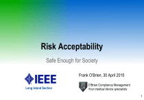 Risk Acceptability Safe Enough for Society Frank O’Brien, 30 April 2015 Long Island Section O’Brien Compliance Management Your medical device specialists 1 Frank O'Brien ● Founded consulting firm in 2004 ● Has evaluated 1000's of medical devices; 24 years at UL ● Participates on IEC TC62 committees ● Lives in Boston; in past, San Jose, Frankfurt Germany, Long Island ● BS EE Clarkson College; MS Tech Mgt SUNY Stony Brook. O’Brien Compliance Management ● Medical device safety consulting and testing ● IEC 60601 Training ○ Chicago, Boston ● Free guidance on website, obcompman.com OBCM Office, Chelmsford, MA 3 The goal? ● Calibrate to society’s risk evaluation meter ○ Meaning behind risk management terms ○ Regulatory perspective on risk management 4 Risk Acceptability, Agenda 5 1. Risk Management Quick Review 6 The requirements ● ISO 14971:2007 ○ EN/ISO 14971:2012, Annex ZA ■ key emphasis, reduce risk as far as possible (AFAP) ● Your company’s own Risk Management Procedure, which must implement ○ these RM requirements and ○ any other management policy and objectives 7 Cause, Risk Control, No Harmful Effect Hazard Pre-Risk Post-Risk Harm l tro k n o C s Ri 8 Management process Procedures Records Management Tasks, 3.2, 3.3 Risk Management Plan 3.4 Risk Management Tasks, 4 to 9 Risk Management File 3.5 9 Hypothetical risk acceptability policy ● Reduce risk “as far as possible” (AFAP), based upon ○ Applicable national or regional regulations ○ Relevant International Standards, and ○ Available information such as ■ ■ The generally accepted state of the art (GASOTA), and Known stakeholder concerns ● Periodically review AFAP is dependent on Regulations, Standards and GASOTA, which take into account economic, technical improvements, constraints. In the context of AFAP, “possible”, “feasible” and/or “practicable” have same meaning. ISO 14971, 3.2, and EU MDD, ER 2 10 Risk Plan ● Scope, identify, describe medical device, life-cycle (expected service life) ● Assign responsibilities and authorities ● Requirements for review of risk management activities ● Criteria for probability, severity, risk acceptability ○ Where risk policy/procedure need refinement for specific medical device, use characteristics ● Verification activities ● Activities related to collection and review of relevant production and post-production information ISO 14971, 3.4.d 11 Risk Assessment and Control Release All hazards 4. Risk Analysis 4.2. intended use characteristics related to safety 4.3. identification of hazards 4.4. estimation of risk Our focus 5. Risk Evaluation 6. Risk Control 6.1. risk reduction 6.2. option analysis 6.3. implementation 6.4. residual risk evaluation 6.5. risk/benefit analysis 6.6. risks arising from risk control measure 6.7. completeness of risk control 7. Evaluation of overall residual risk acceptability 8. Risk Management Report 12 Risk Management Continuous improvement Release All hazards 4. Risk Analysis 4.2. intended use characteristics related to safety 4.3. identification of hazards 4.4. estimation of risk Our focus 5. Risk Evaluation 6. Risk Control 6.1. risk reduction 6.2. option analysis 6.3. implementation 6.4. residual risk evaluation 6.5. risk/benefit analysis 6.6. risks arising from risk control measure 6.7. completeness of risk control 7. Evaluation of overall residual risk acceptability 8. Risk Management Report 9. Production and postproduction information (good yesterday, good today?) 13 2. Risk Estimation 14 Risk dependencies Probability of occurrence of harm Low Risk High Risk Severity of harm 15 Probability of Occurrence of Harm, Qualitative Common Term Description (occurrences in installed base over Expected Service Life) Frequent Often Probable Likely to occur; considerable certainty that harm will occur Occasional Reasonable probability of occurrence of harm; good chance Remote Remote probability of occurrence of harm; expected that harm occur rarely/ from time to time (e.g., with no clear trend); Negligible Inconceivable; not possible (e.g. extremely unlikely) ISO 14971:2007, Annex D; IEC 61010-1:2010, Annex J; and IEC 61508-1:2010 16 Sequence of events Probability of occurrence of harm ISO 14971, D.4 17 Hazard to Harm Terminology ISO 14971 Definition Hazard Potential source of harm (1st) Foreseeable Sequence of Leading to [exposure of] Hazard Events Hazardous situation Exposure of hazard (2nd) Foreseeable Sequence of Events Leading from exposure of hazard to harm Harm Injury to being, property, or environment 18 Possible hazard categories ● ● ● ● ● ● ● ● Electromagnetic Radiation Mechanical energy Biological Biocompatibility Clinical function Use Error Information for Safety ISO 14971, Table E.1 19 P1 initiating events and circumstances ● Incomplete requirements ○ parameters, performance, service, end of life ● Manufacturing processes ● Transport and storage ● Environmental and EM field factors ● Cleaning, disinfection, sterilization ● Formulation ○ Biocompatibility ● Human factors ● Failure modes ISO 14971, Table E.2 ○ HW, SW, materials 20 P2 initiating events and circumstances ● Often usability (human factors) related ● To identify and estimate risk ○ Use studies, and/or ○ Historical data for similar products 21 Probability dependances, 1/2 ● Scales for probability can include ○ ○ ○ ○ Probability of harm per use Probability of harm per device Probability of harm per hour of use, etc. Probability of harm in installed base over lifetime ISO 14971, Annex D.3.4 22 Probability dependances, 2/2 ● How often is a particular medical device used? ○ ○ ○ ○ What is the lifetime of the medical device? Who makes up the user and patient populations? What is the number of users/patients? How long and under what circumstances is the user/patient exposed? ISO 14971, Annex D.3.4 23 Severity of Harm, Qualitative 1/2; person Common Term Person Cat