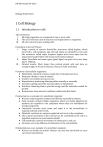 RIP BIO CLASS OF 2K17 Biology Study Notes: 1 Cell Biology 1.1 Introduction to cells The Cell Theory: I. All living organisms are composed of one or more cells. II. The cell is the basic unit of structure and organisation in organisms. III. All cells come from pre-existing cells. Exceptions to the Cell Theory: I. Fungi: consists of narrow thread-like structures called hyphae, which have both a cell membrane and cell wall. Many are divided by cross wall like structures called septa. Aseptate hyphae don’t have septa and are long uninterrupted tubes with many nuclei spread along it. II. Algae: Unicellular and some types (giant algae) can grow to be very large (up to 100mm). III. Striated muscle: Much larger than normal animal cells and have an average length of 30 mm in humans. They are multi-nucleated. Functions of unicellular organisms: ● Metabolism: chemical reactions inside the cell (respiration etc.). ● Response: Ability to react to stimuli ● Growth: irreversible increase in size. ● Reproduction: producing offspring either sexually or asexually. ● Excretion: getting rid of the waste products of metabolism ● Nutrition: obtaining food to provide energy and the materials needed for growth. ● Homeostasis: keep internal conditions within tolerable limits. Paramecium as an example of a unicellular organism: ● Nucleus contains genetic material and divides asexually by mitosis.. ● Food vacuoles contain smaller organisms, which are slowly digested; the products are expelled to the cytoplasm where they are assimilated for energy and growth. ● Contractile vacuoles store water and expel it to the extracellular to maintain internal water levels. ● Metabolic reactions are enzyme-regulated and occur in the cytoplasm. ● Cilia control movement of the cell and can be controlled by the cell as a regulated response to environment stimuli. ● Cell membrane controls movements of substances in and out. ● Excretion occurs by diffusion of substances to the extracellular. Chlamydomonas as an example of a unicellular organism: ● Nuclear can divide via mitosis. Nuclear can also fuse and divide to carry out sexual reproduction. RIP BIO CLASS OF 2K17 ● Metabolic reactions occur in the cytoplasm with the enzymes present. ● Cell wall is freely permeable; cell membrane controls what enters/exists the cell. Oxygen, waste product, diffuses out of the cell. ● Contractile vacuole maintains internal water levels by expelling water into the extracellular. ● Photosynthesis occurs in the chloroplasts. Carbon Dioxide is absorbed from carbon compounds of other organisms. ● Light sensitive eyespot enables detection of light and flagellum facilitates movement towards light. Limitations to cells size: ● Surface area to volume ratio is important to be maintained because a small ratio would slow down the rate of exchange between substances in the extra/intracellular. ● Waste products would be expelled too slowly and products needed for cellular reactions would be absorbed too slowly. ● This would result in a built up of waste products as they would be excreted slower than produced. ● Heat production and loss would also be affected as the cell may over heat, as it would produce heat faster than it loses it over the cell’s surface. Multicellular organisms: ● Cells in multicellular organisms can be regarded as cooperative groups. ● Individual cells in a group can work together to form distinctive overall properties called emergent properties. These arise from the interaction of the component parts of a complex structure. Cell differentiation in multicellular organisms: ● Specialised tissues can develop by cell differentiation in multicellular organisms. ● A group of cells to specialise in the same way to perform the same function are called a tissue. This allows them to be more efficient. ● There are 220 highly specialised cell types in humans (that have been recognised so far). Gene expression and cell differentiation: ● Differentiation involves the expression of some genes and not others in a cell’s genome. ● All tissues have the same genes, however specialisation involves the ‘turning on’, or expression, of particular genes, which define a specific function. Differentiation occurs because different sequences of genes are expressed in different cell types. Stem cells: ● The capacity of stem cells to divide and differentiate along different pathways is necessary in embryonic development. It also makes them suitable for therapeutic uses. ● Therapeutic uses of stem cells include replacing damaged skin tissue and non-therapeutic uses include formation of striated muscle for human RIP BIO CLASS OF 2K17 consumption. ● Stem cells can be found in the bone marrow, skin and liver and can be used for self-repair. Use of stem cells to cure Stargardt’s macular dystrophy: ● Stargardt’s macular dystrophy is a genetic disease that develops in children ages 6-12 years old. ● Recessive mutation of ABCA 4 gene and results in the malfunctioning of a membrane protein responsible for active transport in retina cells. ● Photoreceptor cell degenerate and vision decays. ● Stem cells are injected into the eye and attach themselves to damaged cells resulting in improved vision. Use of stem cells to cure Leukaemia: ● Involves the production of lots of white blood cells at an uncontrollable rate. ● Chemotherapy kills the dividing cells. ● Adult stem cells are extracted from the bone marrow with a large needle and then frozen. ● Chemotherapy is then executed and kills cells in the bone marrow. ● Stem cells are then returned to the patient’s body. Sources of stem cells and the ethics of using them: Embryonic stem cells Cord blood stem cells Adult stem cells ● Can differentiate ● Easily obtained ● Difficult to obtain into any type of and stored. because they are cell. ● Limited buried deep in ● Likely to be differentiation tissues. genetically capacity and 