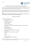 (rev. 01/19) Civics (History and Government) Questions for the Naturalization Test The 100 civics (history and government) questions and answers for the naturalization test are listed below. The civics test is an oral test and the USCIS Officer will ask the applicant up to 10 of the 100 civics questions. An applicant must answer 6 out of 10 questions correctly to pass the civics portion of the naturalization test. On the naturalization test, some answers may change because of elections or appointments. As you study for the test, make sure that you know the most current answers to these questions. Answer these questions with the name of the official who is serving at the time of your eligibility interview with USCIS. The USCIS Officer will not accept an incorrect answer. Although USCIS is aware that there may be additional correct answers to the 100 civics questions, applicants are encouraged to respond to the civics questions using the answers provided below. AMERICAN GOVERNMENT A: Principles of American Democracy 1. What is the supreme law of the land? ▪ the Constitution 2. What does the Constitution do? ▪ sets up the government ▪ defines the government ▪ protects basic rights of Americans 3. The idea of self-government is in the first three words of the Constitution. What are these words? ▪ We the People 4. What is an amendment? ▪ a change (to the Constitution) ▪ an addition (to the Constitution) 5. What do we call the first ten amendments to the Constitution? ▪ the Bill of Rights 6. What is one right or freedom from the First Amendment?* ▪ speech ▪ religion ▪ assembly ▪ press ▪ petition the government 7. How many amendments does the Constitution have? ▪ twenty-seven (27) * If you are 65 years old or older and have been a legal permanent resident of the United States for 20 or more years, you may study just the questions that have been marked with an asterisk. -1- www.uscis.gov 8. What did the Declaration of Independence do? ▪ announced our independence (from Great Britain) ▪ declared our independence (from Great Britain) ▪ said that the United States is free (from Great Britain) 9. What are two rights in the Declaration of Independence? ▪ life ▪ liberty ▪ pursuit of happiness 10. What is freedom of religion? ▪ You can practice any religion, or not practice a religion. 11. What is the economic system in the United States?* ▪ capitalist economy ▪ market economy 12. What is the “rule of law”? ▪ Everyone must follow the law. ▪ Leaders must obey the law. ▪ Government must obey the law. ▪ No one is above the law. B: System of Government 13. Name one branch or part of the government.* ▪ Congress ▪ legislative ▪ President ▪ executive ▪ the courts ▪ judicial 14. What stops one branch of government from becoming too powerful? ▪ checks and balances ▪ separation of powers 15. Who is in charge of the executive branch? ▪ the President 16. Who makes federal laws? ▪ Congress ▪ Senate and House (of Representatives) ▪ (U.S. or national) legislature 17.What are the two parts of the U.S. Congress?* ▪ the Senate and House (of Representatives) 18. How many U.S. Senators are there? ▪ one hundred (100) * If you are 65 years old or older and have been a legal permanent resident of the United States for 20 or more years, you may study just the questions that have been marked with an asterisk. -2- www.uscis.gov 19. We elect a U.S. Senator for how many years? ▪ six (6) 20. Who is one of your state’s U.S. Senators now?* ▪ Answers will vary. [District of Columbia residents and residents of U.S. territories should answer that D.C. (or the territory where the applicant lives) has no U.S. Senators.] 21. The House of Representatives has how many voting members? ▪ four hundred thirty-five (435) 22. We elect a U.S. Representative for how many years? ▪ two (2) 23. Name your U.S. Representative. ▪ Answers will vary. [Residents of territories with nonvoting Delegates or Resident Commissioners may provide the name of that Delegate or Commissioner. Also acceptable is any statement that the territory has no (voting) Representatives in Congress.] 24. Who does a U.S. Senator represent? ▪ all people of the state 25. Why do some states have more Representatives than other states? ▪ (because of) the state’s population ▪ (because) they have more people ▪ (because) some states have more people 26. We elect a President for how many years? ▪ four (4) 27. In what month do we vote for President?* ▪ November 28. What is the name of the President of the United States now?* ▪ Visit uscis.gov/citizenship/testupdates for the name of the President of the United States. 29. What is the name of the Vice President of the United States now? ▪ Visit uscis.gov/citizenship/testupdates for the name of the Vice President of the United States. 30. If the President can no longer serve, who becomes President? ▪ the Vice President 31. If both the President and the Vice President can no longer serve, who becomes President? ▪ the Speaker of the House 32. Who is the Commander in Chief of the military? ▪ the President 33. Who signs bills to become laws? ▪ the President 34. Who vetoes bills? ▪ the President 35. What does the President’s Cabinet do? ▪ advises the President * If you are 65 years old or older and have been a legal permanent resident of the United States for 20 or more years, you may study just the questions that have been marked with an asterisk. -3- www.uscis.gov 36. What are two Cabinet-level positions? ▪ Secretary of Agriculture ▪ Secretary of Commerce ▪ Secretary of Defense ▪ Secretary of Education ▪ Secretary of Energy ▪ Secretary of Health and Human Services ▪ Secretary of Homeland Security ▪ Secretary of Housing and Urban Development ▪ Secretary of the Interior ▪ Secretary of Labor ▪ Secretary of State ▪ Secretary of Transportation ▪ Secretary of the Treasury ▪ Secretary of Veterans A