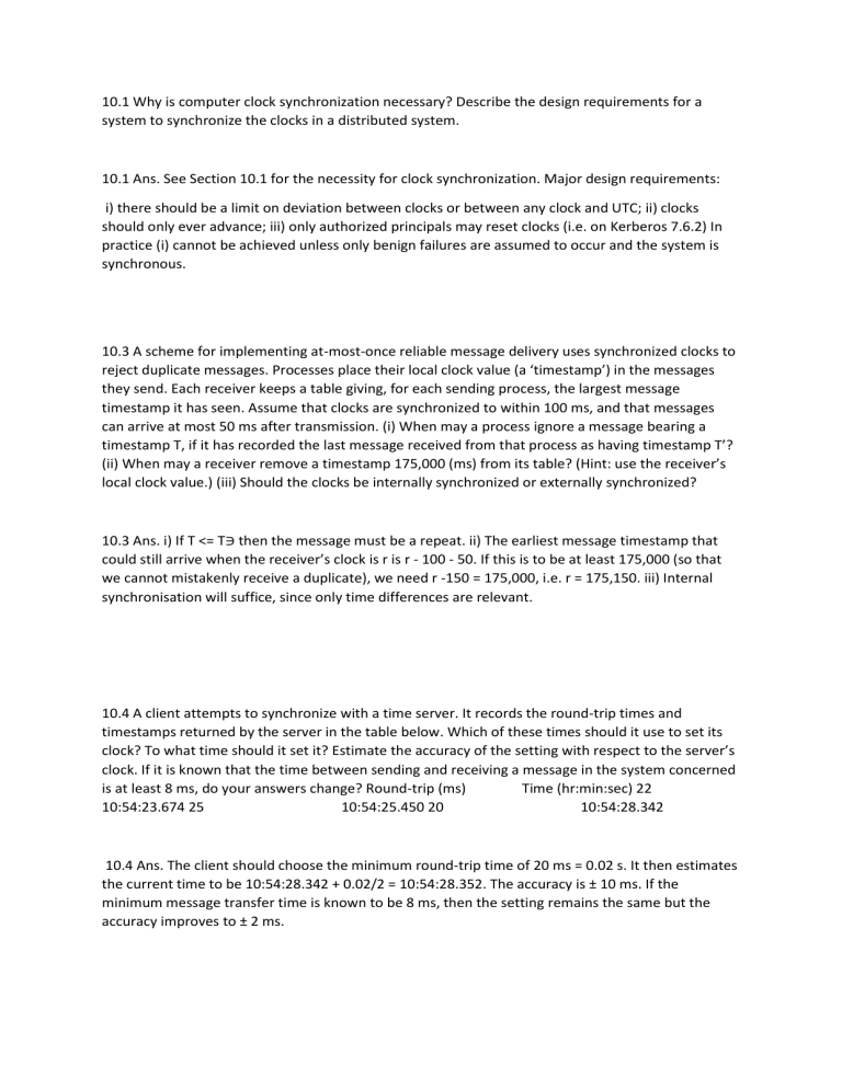10.1 Why is computer clock synchronization necessary? Describe the design requirements for a