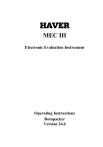 HAVER MEC III Electronic Evaluation Instrument Operating Instructions Rotopacker Version 24.6 Contents ========================================================================== 1 Functional Overview 2 Functional Description 2.1 Parameter summary 2.1.1 Spout parameter 2.1.2 Sort parameters 2.1.3 Calibration parameters 2.2 Functional description 2.2.1 Automatic function test 2.2.2 Functional sequence 2.3 Positions on the packer periphery 2.4 Angle measurement 3 3.1 3.1.1 Operating instructions Controls and display elements Operating message 3.2 Terminal dialog 3.3 Short dialog 3.4 Main dialog 3.4.1 Main menu 3.4.2 Sort parameters 3.4.3 Display values 3.4.4 Set up weigher 3.4.5 Calibration 4 Error handling 1 5.964.0134.09 Inhaltsverzeichnis ========================================================================= 5 Connector Assignments 6 Inputs 7 Outputs 8 Descriiption of the Input/Output Signals 8.1 Description of the input signals 8.2 Description of the Output signals 9 Technical Data 10 Installations Requirements 2 5.964.0134.09 Functional Overview 1 ========================================================================== MEC III is an electronic evaluation instrument with up to 6000 parts, which can be calibrated and is combined with a control system that supports all the functions of a filling spout. A Rotopacker that is equipped with MEC III has a weigher fitted to each spout on the rotating portion. The operation and display of all functions is performed through an operating terminal. The entire adjustment of the converter card is made through the dialog. A multi-scale weigher with 3 partial weighing ranges can be set up, and each range can be individually adjusted. The weigher controls all the spout functions independently. The definition of up to 99 different sorts is carried out from the integral keypad and the built-in LCD graphics display, in English, German and various other languages. These settings are saved in nonvolatile memory. The changeover to a different sort can be made with a selector switch on the stationary section of the machine, or by selecting the sort with the keypad. When the bag that was most recently filled has been discharged, the machine automatically sets itself to the newly selected sort, and is immediately ready for operation again. The controls are linked together through an Ethernet network. In a further stage of expansion, a central input/output unit – the server – is connected to the network and so linked to all the spouts. Weigher data, control signals, error messages and warning signals are sent from the individual spouts to the MECIII server, via the network. This displays the messages that have been received, and establishes the connections to other peripheral units and systems. Two check-weighers and a higher-level (supervisory) computer can be connected to the server. Parallel inputs and outputs provide the connections to the system. One check-weigher per discharge belt can be connected to the MECIII server, as a higher-level bagweight correction system. From here, a new adjustment can be made for a spout that has produced a bag that was too light or too heavy. The check-weigher can initiate the ejection of bags that have an incorrect weight. If a check-weigher is not available, then the server can control one ejection device per output belt instead. Both the weigher/control system and the server have been designed as a compatible system of modules, with components that can be exchanged with one another. This means that even a layman is able to search for a fault, if necessary, by swapping modules, a facility that increases the availability of the machine. 3 5.964.0134.09 Functional Description 2 ========================================================================= 2.1 Parameter summary 2.1.1 Weigher parameters On each spout, several parameters can be set that do not depend on the sort. These parameters are called Weigher parameters. Weigher parameters Possible entries Validity ========================================================================== Spout number 1 - 50 Line number 1 - 199 Pulses per turn Offset 0 - 9999 0 - 359.9 degrees 1) 1) Auto Place Start Belt1 Auto Place Stop Belt1 Operate bag holder Belt1 Manual placing Belt1 Empty-bag position Belt1 Broken-bag position Belt1 Start discharge position Belt1 Stop discharge position Belt1 0 - 359.9 degrees 0 - 359.9 degrees 0 - 359.9 degrees 0 - 359.9 degrees 0 - 359.9 degrees 0 - 359.9 degrees 0 - 359.9 degrees 0 - 359.9 degrees 1) 1) 1) 1) 1) 1) 1) 1) Auto Place Start Belt2 Auto Place Stop Belt2 Operate bag holder Belt2 Manual placing Belt2 Empty-bag position Belt2 Broken-bag position Belt2 Start discharge position Belt2 Stop discharge position Belt2 0 - 359.9 degrees 0 - 359.9 degrees 0 - 359.9 degrees 0 - 359.9 degrees 0 - 359.9 degrees 0 - 359.9 degrees 0 - 359.9 degrees 0 - 359.9 degrees 1) 1) 1) 1) 1) 1) 1) 1) Start switch Network monitoring on / off on / off 1 = Packers with position determination based on angle measurement 4 5.964.0134.09 Functional Description 2.1.2 ========================================================================== 2.1.2 Sort parameters The sort-dependent parameters can be set up individually for each sort. Sort parameters Possible entries Validity ==================================================================== Product name __________ Function gravimetric - volumetric Target weight 0,000 - 9000,0 Kg Classification 0.2 / 0.5 / 1 / 2 / 5 / x Underweight depends on classification Overweight depends on classification Fine-feed quantity 0.00 - target weight Fine-feed cross-section 0 - 999 Filling break (pause) 0.0 - 9.9 sec Correction 0.0 - 9.9 Kg Fine-feed dosing time 0.0 - 9.9 sec Lead dynamic / static Fixed value yes / no Static lead 0.0 - 9.9 Kg Machine constant 0.0 - 5.0 sec Turbine delay 0.0 - 2.0 sec Start aeration 0.0 - 9.9 sec Initial air 0 - 99 sec Maximum pause time 0 - 99 minutes Filling interruption on / off Maximum filling time 