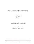 SOUTH AFRICAN POULTRY ASSOCIATION CODE OF PRACTICE 2012 Broiler Production May 2012 SAPA Code of Practice for Broiler Production Page 1 FOREWORD This is the latest version [as per the date shown below] of the Code of Practice compiled by the South African Poultry Association. All members of SAPA, by agreeing to be members of SAPA, bind themselves to follow this Code which, as with previous versions, is established as a minimum set of standards for local poultry production. Members are encouraged to use higher standards wherever they see fit and none of these standards trump any local laws or regulations. This Code has been drawn up by the Poultry Welfare Working Group of SAPA’s Technical Committee. No Code such as this can be seen as a final document. As new knowledge is defined by science this Code will be amended. Comments and advice from members will keep this document alive and relevant. You are all invited to comment as you see fit. The role of the poultry industry in feeding the nation is likely to grow due to the nutritious and affordable nature of our products. We are duty bound to produce food safely, responsibly, and with as little harm to the environment as possible. May 2012 SAPA Code of Practice for Broiler Production Page 2 Index 1 2 3 4 5 6 Background and Introduction ............................................................................................................... 4 Broiler Production Systems ................................................................................................................... 6 2.1 Introduction .................................................................................................................................. 6 2.2 Housing of broilers in Floor Systems............................................................................................. 6 2.3 Housing of Broilers in Cage Systems ............................................................................................. 7 2.4 Free Range Broiler Production ...................................................................................................... 7 2.4.1 Internal Environment ............................................................................................................ 8 2.4.2 External Environment ........................................................................................................... 9 Preparation of Poultry Houses .............................................................................................................. 9 3.1.1 Cleaning, Disinfection and Sanitary Break ............................................................................ 9 3.1.2 House Preparation .............................................................................................................. 10 3.2 Management Practices in Rearing of Broilers............................................................................. 10 3.2.1 Receiving of Chicks .............................................................................................................. 10 3.2.2 Temperature Control .......................................................................................................... 10 3.2.3 Ventilation Control .............................................................................................................. 11 3.2.4 Light Control........................................................................................................................ 11 3.2.5 Feed..................................................................................................................................... 11 3.2.6 Drinking Water .................................................................................................................... 12 3.2.7 Supervision .......................................................................................................................... 12 3.2.8 Access to External Environment in Free Range Production................................................ 13 3.2.9 Transfer of Birds to Processing ........................................................................................... 13 3.3 Health Control ............................................................................................................................. 14 3.3.1 Rearing Establishment ........................................................................................................ 14 3.3.2 Flock Health......................................................................................................................... 15 3.3.3 Records................................................................................................................................ 15 3.3.4 Vaccination.......................................................................................................................... 15 3.3.5 Disease monitoring and investigation................................................................................. 15 3.3.6 Parasite, Vermin and Insect Control ................................................................................... 16 3.3.7 Biosecurity - people ............................................................................................................ 16 Appendix 1 .......................................................................................................................................... 17 Appendix 2 .......................................................................................................................................... 21 Appendix 3 .......................................................................................................................................... 23 May 2012 SAPA Code of Practice for Broiler Production Page 3 1 Background and Introduction This Code of practice has been compiled by the South African Poultry Association as an objective guide for all poultry and poultry products produced in South Africa a