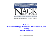 E SC 412 Nanotechnology: Materials, Infrastructure, and Safety Wook Jun Nam © 2013 The Pennsylvania State University Unit 2 Infrastructure Lecture 2 Facilities © 2013 The Pennsylvania State University Unit Outline • Infrastructure * What is it ? * Why do we need it in nanotechnology ? • Facilities • Equipment Systems * Vacuum Based Systems * Non-vacuum Based Systems © 2013 The Pennsylvania State University Lecture Outline • Introduction • Facilities − Why do we need special facilities ? − Types * Clean work stations * Tunnel/Bay structures * Cleanrooms * Mini-environments © 2013 The Pennsylvania State University Why do we need special facilities ? • • • • • Place for manufacturing Safety Contamination control Protection of workers and environment Process control © 2013 The Pennsylvania State University What are some examples of the facilities used ? • Clean Work Stations • Tunnel/ Bay Structures • Cleanrooms • Mini-environments − SMIF boxes http://techon.nikkeibp.co.jp/NEA/archive/200205/183172/ © 2013 The Pennsylvania State University Clean Work Stations • One approach in nanofabrication and synthesis is to create individual work stations, such as chemical hoods with air filters and non-shedding materials. • A large room with the work stations (or hoods) arranged in rows, so products under fabrication can be moved to each station, without coming in contact with “dirty” air. © 2013 The Pennsylvania State University Clean Work Stations • Filters in the clean hoods are known as High Efficiency Particle Attenuation (HEPA) filters. • HEPA filters consist of large, porous fibers folded into a filter holder in an accordion design. • HEPA filters allow a large volume of air to pass at a low velocity (90-100 ft/min.) and have a filtering efficiency of 99.99%. © 2013 The Pennsylvania State University The HEPA Filter Design Dirty Air Clean Air Public Domain: Image Generated by CNEU Staff for free use © 2013 The Pennsylvania State University Clean Work Stations • A typical clean hood has a HEPA filter mounted in the top. • “Dirty” air is pushed through the filter and exits in a laminar pattern. • A shield directs the exiting air over the work area in the hood. • These type of hoods are known as vertical laminar flow (VLF) hoods. © 2013 The Pennsylvania State University VLF Hood Cross Section Perfilter Blower Air Flow HEPA Filter Clean Air Work surface Public Domain: Image Generated by CNEU Staff for free use © 2013 The Pennsylvania State University Glove box • Glove box is an enclosed workstation which provides inert atmosphere. • The gas (argon, nitrogen or helium) continuously circulates between the glove box and the gas purification system. The gas is purified to a value of < 1 ppm in relation to moisture and Oxygen. © 2013 The Pennsylvania State University Basic Components of Glove box Glove Box Vacuum-tight stainless steel working space. Glove Ports / Gloves Butyl gloves for comfortable working. Antechamber : For material transfer. http://home2.btconnect.com/MBRAUN-UK/technical-guide.htm Vacuum Pump - to evacuate the system - To pump antechamber - for final cleaning of the purifiers at the end of the regeneration cycle © 2013 The Pennsylvania State University Basic Components of Glove box Gas Purification System Usually attains < 1 ppm Oxygen Usually attains < 1 ppm moisture Purifier can be regenerated using hydrogen/nitrogen mixed gas Control Panel For central controlling and monitoring of the system http://home2.btconnect.com/MBRAUN-UK/technical-guide.htm © 2013 The Pennsylvania State University Basic Operation of Glove box G : Gas flow Circulation between box and purifier F : Exhaust filter Inlet/outlet of the circulation tubes are protected by aerosol filters. The filters supply particle-free atmosphere and separate the box from the purifier(s) and tubes V : Valves Usually electropneumatic valves http://home2.btconnect.com/MBRAUN-UK/technical-guide.htm C : Cooling (heat exchanger) Electric heat as well as compression heat increase the gas temperature © 2013 The Pennsylvania State University Basic Operation of Glove box P : Purifier Unit (regenerable) Oxygen: Removed by chemical binding at polydispersed copper Moisture (water vapor): Removed by adsorption in microporous molecular sieve Other gases: Removes all gases that react with Cu or CuO. Traps gases that fit into the 1.3 nm holes of the molecular sieve B : Blower (circulation unit) Causes the circulation of gas flow. It is encapsulated in a vacuum-tight container http://home2.btconnect.com/MBRAUN-UK/technical-guide.htm © 2013 The Pennsylvania State University Glove Box Applications • • • • • • Allows work with anaerobic organisms or anaerobes. (living organisms that do not require oxygen for survival and could possibly react negatively, and even die, if oxygen is present) Allows use of oxygen/moisture sensitive materials Allows inert welding Allows battery production; e.g., lithium batteries need a moisture free production environment Allows deposition of relatively contamination-free thin films; e.g., Al, Cu, P3HT/PCBM Can be used to allow work with hazardous materials such as high-biosafety level pathogens and radio active material © 2013 The Pennsylvania State University Tunnel/Bay Concept • For more stringent particulate control clean hoods are less popular because of the potential for personnel induced contamination • This contamination issue can be solved by dividing the fabrication/synthesis area into clean regions called “bays” or “tunnels” • Work stations are then located in these bays/tunnels © 2013 The Pennsylvania State University Tunnel/Bay Concept • In this design, clean air enters into a bay or tunnel from above by HEPA filters built into the ceiling • Materials are less vulnerable to personnelgenerated contamination because there are fewer workers in the immediate area • On the downside, tunnel/bay designs a