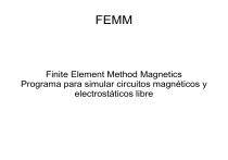 FEMM Finite Element Method Magnetics Programa para simular circuitos magnéticos y electrostáticos libre FEMM FEMM Abrir archivo de programación Lua Codificar comandos en LUA FEMM Definir el tipo de problema nuevo FEMM FEMM FEMM FEMM FEMM FEMM • Si creamos un nuevo problema nos preguntara si es magnético o electrostático Después debemos hacer unos ajustes en la definición del problema a través del la opción “Problem” del menú principal 15/02/2015 15/02/2015 Transparencia nº 11 Unidades de longitud del dibujo, mm, cm o m. Frecuencia de operación del problema, si se indica 0 Hz, será un problema magnetostático, en electrostática no sale la casilla. “Depth” profundidad teórica del dibujo, se utilizara en los cálculos para estimar fuerzas o caídas de tensión totales del modelo. Tipo de problema: planar, en coordenadas cartesianas; o axionometrico, en coordenadas cilíndricas, radios y alturas, ambos en 2 dimensiones. Precisión en la resolución numérica del problema, la mínima es 1x10-8 Ángulo mínimo de los triángulos en la creación de la malla del problema, es variable de 1 a 33,8, y solo en caso de problemas al mallar se debe bajar. 15/02/2015 15/02/2015 Transparencia nº 12 •“Grid” Rejilla para dibujar Es importante dibujar ajustado a una rejilla, pues todas la formas cerradas, por ejemplo un cuadrado de material, deben estar bien cerradas, de no ser así el programa lo detecta, dando fallos de calculo. Ver Rejilla Define tamaño de rejilla y tipo de coordenadas Ajustar puntos del dibujo a la rejilla 15/02/2015 15/02/2015 Transparencia nº 13 Recomendaciones a considerar Sustituir una ranura real de elemento a simular, con aislante, conductores separados asilados, por una ranura con una densidad de corriente equivalente. X A/mm2 Una pequeña línea dejada en el dibujo, aumenta mucho el número de triángulos en esta zona, y puede hacer imposible el trazado de los mismos Líneas o puntos muy cerca unos de otros puede ralentizar el cálculo de triangulación. 15/02/2015 15/02/2015 Transparencia nº 14 Compatibilidad con otros programas El programa permite importar ficheros de dibujo de Autocad, en formato DXF, desde el menú “File” 15/02/2015 15/02/2015 Transparencia nº 15 Se puede dibujar directamente con el programa con un sencillo editor de gráficos, en el que primero se han de marcar los puntos, y luego los segmentos entre ellos. Para trazado de segmentos rectos entre dos puntos. Si dos segmentos se cortan crean el punto de intersección Para trazado de arcos entre dos puntos, entre 1 y 180 grados. El arco se traza del primer al segundo puntos en la dirección de las agujas del reloj. El número de segmento indica la precisión del trazado, mayor a mayor precisión. Para marcar puntos en el dibujo, con el ratón, o con la tecla “TAB” dando la coordenadas del punto Para dar nombre a los materiales, los materiales siempre tienen que ser superficies cerradas. Primero dibujar puntos, por ratón o teclado, que serán los extremos de rectas y arcos. Cualquier superficie cerrada, por rectas o arcos, se tiene que definir como material. Para seccionar puntos, líneas, arcos o materiales. Para crear puntos o materiales, o seleccionar los puntos de principio y fin de líneas, y arcos Para deseleccionar Esc Del Para borrar lo seleccionado Ratón Para introducir por teclado coordenadas de puntos o materiales Tab Para editar propiedades de puntos, líneas, arcos o materiales Barra Espacio Ventana de “Mover” o “Copiar”, en que se permite la rotación o translación, simple o múltiple Ejemplo de edición, rotación de 60º seis veces Copiar Escalado Mover Simetría Formato de selección, rectangular o circular 15/02/2015 15/02/2015 Borrar Transparencia nº 18 ● ● ● Después de realizar el dibujo se deben asignar propiedades a los puntos, líneas y materiales Para ello tenemos el menú “Propiedades”, que nos permitirá está asignación. Este menú, incluye una librería de materiales, que se puede pasar a nuestro modelo y ampliar. Librería de materiales Materiales del modelo actual 15/02/2015 15/02/2015 Transparencia nº 19 Ventana de “Mover” o “Copiar”, en que se permite la rotación o translación, simple o múltiple Ejemplo de edición, rotación de 60º seis veces Copiar Escalado Mover Simetría Formato de selección, rectangular o circular 15/02/2015 15/02/2015 Borrar Transparencia nº 20 Materiales Desde la opción de “Materiales” del menú propiedades, se pueden crear nuevos materiales, borrar y editar o modificar Los datos de un material han de ser, el Nombre, la permitividad relativa εr en ambos ejes, habitualmente la misma, si el material no es anisótropo. Y en caso de existir la densidad volumétrica de carga. 15/02/2015 15/02/2015 Transparencia nº 21 Problemas de magnetostática, propiedades Después de realizar el dibujo se deben asignar propiedades a los puntos, líneas y materiales Para ello tenemos el menú “Propiedades”, que nos permitirá está asignación. Este menú, incluye una librería de materiales, que se puede pasar a nuestro modelo y ampliar. Librería de materiales Materiales del modelo actual 15/02/2015 15/02/2015 Transparencia nº 22 Problemas de magnetostática, propiedades de materiales Materiales del modelo actual Materiales magnéticos lineales o no lineales Si lineales indicar μ relativa Si no lineal indicar puntos de la curva B-H Conductividad del material Si en un imán permanente indicar su fuerza coercitiva Densidad de corriente 15/02/2015 15/02/2015 Transparencia nº 23 Problemas de magnetostática, propiedades de materiales En materiales magnéticos no lineales tenemos que entrar pares de valores de densidad de flujo, B y intensidad de campo magnético, H, hasta conseguir la característica deseada. Pares de puntos 15/02/2015 15/02/2015 Gráfica B-H no lineal Transparencia nº 24 Problemas de magnetostática, propiedades de líneas Las propiedades de las líneas, sirven pa