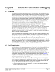 Chapter 4 4.1 Soil and Rock Classification and Logging Overview The detailed description and classification of soil and rock are an essential part of the geologic interpretation process and the geotechnical information developed to support design and construction. The description and classification of soil and rock includes consideration of the physical characteristics and engineering properties of the material. The soil and rock descriptions that are contained on the field logs should be based on factual information. Interpretive information should not be included on the field logs, but provided elsewhere, such as in the text of geological, and geotechnical reports. This chapter provides standards for describing and logging soil and rock. The Unified Soil Classification System, as outlined in ASTM 2488 – “Standard Practices for Description of Soils (Visual – Manual Procedure)”, provides a conventional system for classifying soils. However, it alone does not provide adequate descriptive terminology and criteria for identifying soils for engineering purposes. Therefore, the ASTM Standard has been modified to account for these additional descriptive terms and criteria. It is not intended to replace the standard but to improve upon it, and make it better understood. There are numerous rock classification systems, but none of these is universally used. This chapter provides a composite of those classification systems that incorporates the significant descriptive terminology relevant to geotechnical design and construction. An important facet of soil and rock classification is the determination of what constitutes “rock”, as opposed to extremely weathered, partially cemented, or altered material that approaches soil in its character and engineering characteristics. Extremely soft or decomposed rock that is friable (easily crumbled), and can be reduced to gravel size or smaller by normal hand pressure, should be classified as a soil. 4.2 Soil Classification Soil classification, for engineering purposes, is based on the distribution and behavior of the fine-grained and coarse-grained soil constituents. Soil descriptions that are contained on the field exploration logs are based on modified procedures as outlined in ASTM 2488. The visual - manual procedure provided in this standard utilizes visual observation and simple field index tests to identify the characteristics of the soil constituents. Definitions for the various soil constituents can be found in Table 4-1. In addition, soil properties that address angularity, consistency/relative density, color, moisture, structure, etc. have been defined. Soils are divided into four broad categories. These soil categories are coarse-grained soils, fine-grained inorganic soils, organic soils, and peat. The first step in identifying soil is to make a determination regarding which of the four broad categories the soil belongs. The definitions for these broad categories are as follows: • Coarse Grained Soils: Soils that contain 50 % or less of soil particles passing a 0.0030 in. (0.075 mm) opening. WSDOT Geotechnical Design Manual October 2013 M 46-03.08 Page 4-1 Soil and Rock Classification and Logging Chapter 4 • Fine Grained Inorganic Soils: Soils that contain more than 50 % of soil particles passing a 0.0030 in. (0.075 mm) opening. • Fine Grained Organic Soils: Soils that contain enough organic particles to influence the soil properties. • Peat: Soils that are composed primarily of vegetative tissue in various stages of decomposition that has a fibrous to amorphous texture, usually dark brown to black, and an organic odor are designated as a highly organic soil called peat. Once a soil has been identified as a peat (group symbol PT), the soil should not be subjected to any further identification procedures. Soil Constituent Description Boulder Particles of rock that will not pass through a 12 in. opening. Cobble Particles of rock that will pass through a 12 in. opening, but will not pass through a 3 in. opening. Gravel Particles of rock that will pass through a 3 in. opening, but will not pass a 0.19 in. (4.75 mm) opening. Sand Particles of rock that will pass through a 0.19 in. (4.75 mm) opening, but will not pass a 0.003 in. (0.075 mm) opening. Silt Soil that will pass through a 0.003 in. (0.075 mm) opening that is nonplastic or very slightly plastic and exhibits little or no strength when air-dried. Clay Soil that will pass through a 0.003 in. (0.075 mm) opening that can be made to exhibit plasticity (putty-like properties) within a range of water contents, and exhibits considerable strength when air-dried. Organic Soil Peat Soil that contains enough organic particles to influence the soil properties. Soil that is composed primarily of vegetable tissue in various stages of decomposition usually with an organic odor, a dark brown to black color, a spongy consistency, and a texture ranging from fibrous to amorphous. Soil Constituent Definition Table 4-1 4.2.1 Coarse Grained Soils Coarse grained soils are classified as either a gravel or a sand, depending on whether or not the percentage of the coarse grains are larger or smaller than a 0.19 in. (4.75 mm) opening. A soil is defined as a gravel when the estimated percentage of the gravel size particles is greater than the sand size particles. A soil is defined as a sand when the estimated percentage of the sand size particles are greater than the gravel size particles. If the soil is classified as a gravel, it is then identified as either clean or dirty. Dirty means that the gravel contains an appreciable (greater than 10 %) amount of material that passes a 0.003 in. (0.075 mm) opening (fines), and clean means that the gravel is essentially free of fines (less than 10 %). The use of the terms clean and dirty are for distinction purposes only and should not be utilized in the description contained on the field log. Page 4-2 WSDOT Geotechnical Design Manual M 46-03.08 October 2013 Cha