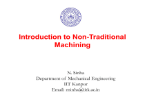 Introduction to Non-Traditional Machining N. Sinha Department of Mechanical Engineering IIT Kanpur Email: nsinha@iitk.ac.in Non-Traditional Machining • Traditional machining is mostly based on removal of materials using tools that are harder than the materials themselves. • New and novel materials because of their greatly improved chemical, mechanical and thermal properties are sometimes impossible to machine using traditional machining processes. • Traditional machining methods are often ineffective in machining hard materials like ceramics and composites or machining under very tight tolerances as in micromachined components. • The need to a avoid surface damage that often accompanies the stresses created by conventional machining. Example: aerospace and electronics industries. • They are classified under the domain of non traditional processes. Classification of Non-Traditional Machining These can be classified according to the source of energy used to generate such a machining action: mechanical, thermal, chemical and electrochemical. Mechanical: Erosion of the work material by a high velocity stream of abrasives or fluids (or both) Thermal: The thermal energy is applied to a very small portion of the work surface, causing that portion to be removed by fusion and/or vaporization of the material. The thermal energy is generated by conversion of electrical energy. Electrochemical: Mechanism is reverse of electroplating. Chemical: Most materials (metals particularly) are susceptible to chemical attack by certain acids or other etchants. In chemical machining, chemicals selectively remove material from portions of the workpart, while other portions of the surface are protected by a mask. Classification of Non-Traditional Machining Mechanical Machining • Ultrasonic Machining (USM) and Waterjet Machining (WJM) are typical examples of single action, mechanical non traditional machining processes. • The machining medium is solid grains suspended in an abrasive slurry in the former, while a fluid is employed in the WJM process. • The introduction of abrasives to the fluid jet enhances the machining efficiency and is known as abrasive water jet machining. Similar case happens when ice particles are introduced as in Ice Jet Machining. Thermal Machining Thermal machining removes materials by melting or vaporizing the work piece material. Many secondary phenomena occur during machining such as microcracking, formation of heat affected zones, striations etc. The source of heat could be plasma as during EDM and PBM or photons as during LBM, electrons in EBM, ions in IBM etc. Chemical and Electrochemical Machining • Chemical milling and photochemical machining or photochemical blanking all use a chemical dissolution action to remove the machining allowance through ions in an etchant. • Electrochemical machining uses the electrochemical dissolution phase to remove the machining allowance using ion transfer in an electrolytic cell. Water Jet Cutting (WJC) • Also known as hydrodynamic machining. • Uses a fine, high-pressure, high-velocity of water directed at the work surface to cause cutting of the work. • Nozzle diameter: 0.1 to 0.4 mm • Pressure: up to 400 MPa • Velocity: up to 900 m/s • Fluid is pressurized by a hydraulic pump Important process parameters Standoff distance: small to avoid dispersion of the fluid stream (3.2 mm) Nozzle opening diameter: affects precision Water pressure: high for thicker materials Cutting feed rate: the velocity at which the WJC nozzle is traversed along the cutting path Water Jet Cutting (WJC) Water Jet Cutting (WJC) Introduction to Abrasive Jet Machining (AJM) • In AJM, the material removal takes place due to impingement of the fine abrasive particles. • The abrasive particles are typically of 0.025mm diameter and the air discharges at a pressure of several atmosphere. Abrasive Jet Machining (AJM) Mechanics of AJM • Abrasive particle impinges on the work surface at a high velocity and this impact causes a tiny brittle fracture and the following air or gas carries away the dislodged small work piece particle. Fracture of work surface Formation of cavity Mechanics of AJM • The process is more suitable when the work material is brittle and fragile. • A model for the material removal rate (MRR) is available from Sarkar and Pandey, 1980. The MRR (Q) is given as Process Parameters The process characteristics can be evaluated by judging (1) the MRR, (2) the geometry of the cut, (3) the roughness of the surface produced, and (4) the rate of nozzle wear. The major parameters which control these quantities are: 1. The abrasive (composition, strength, size and mass flow rate). 2. The gas (composition, pressure and velocity). 3. The nozzle (geometry, material, distance from and inclination to the work surface). The Abrasive Mainly two types of abrasives are used (1) Aluminum oxide and (2) Silicon carbide. (Grains with a diameter 10-50 microns are readily available) For good wear action on the surfaces, the abrasive grains should have sharp edges. A reuse of the abrasive powder is normally not recommended because of a decrease of cutting capacity and clogging of the nozzle orifices due to contamination. The mass flow rate of the abrasive particles depends on the pressure and the flow rate of the gas. There is an optimum mixing ratio (mass fraction of the abrasive in the jet) for which the metal removal rate is the highest. When the mass flow rate of the abrasive increases the material removal rate also increases. The Gas The AJM unit normally operates at a pressure of 0.2-1.0 N/mm2 . The composition of gas and a high velocity has a significant impact on the MRR even if the mixing ratio is not changed. The Nozzle The nozzle is one of the most vital elements controlling the process characteristics. The nozzle material should be hard to avoid any significant wear due to the flowing abrasive. [Normally WC (avg. life: 12-30 hrs.) or Sapphire