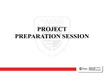 PROJECT PREPARATION SESSION PROJECT GUIDELINES • Passing in Project is Mandatory to Complete Post Graduate Diploma. • Weightage: 100 Marks • Preferably in your area of Specialization. • Opportunity to show your basic understanding of various aspect of management/ chosen specialization / work experience(if any) etc. • Research Methodology Content also shared with you. PROJECT GUIDELINES • For PG/PDWM students, Project is one of the mandatory subjects of Semester-IV. (Passing 50/100) • Students need to thoroughly refer to the latest applicable Project Preparation guidelines, Project Methodology & Project Evaluation criteria. • Minimum No. of Pages is 50 but not more than 100. Project needs to be typed using MS-Word with readable font size of (11/12). • Pls. convert the typed MS-Word file to PDF format and only then upload in portal. No handwritten or scanned image file submitted will be considered and will be awarded zero. PROJECT • The student shall submit one project as part of his/her fourth semester program structure. • The project shall be from the area of specialization of Post graduate diploma program/PDWM, however the students of PGDBM program will have the option to do project in – Marketing – HR – Finance – IT / Operations PROJECT • Select a project where; – You have some interest and understanding of the topic. – There is a possibility to get sufficient data. – Try and give something new or different in your topic (Research Gap). SAMPLE TOPICS • Marketing – Customer Relationship Management in XYZ company – Competition Analysis for IT sector – Effectiveness of Sales Promotion & Advertising in Insurance Companies • Finance – Mergers & Acquisitions in Manufacturing /Banking Industry – Future of derivatives in India SAMPLE TOPICS • Human Resources • 360 degree Appraisal at INFOSYS • Performance Appraisal Techniques /Methods at XYZ Company • Competency Mapping /Model at any organization Finance STRUCTURE • • • • • Title of the project Acknowledgements Table of contents Body of the project Annexure TITLE OF THE PROJECT • The project should start with the details of the project title, your name, student number (SAP ID). • Select a title which clearly describes the project you will be doing. • Use simple words like, A Study of…, An analytical study of…... Comparative study of…….etc. • Avoid general titles like, 'Performance Management', 'Branding' etc. Title should be specific and clear. Remember title generates the interest of the reader, hence meaningful and apt title is important ACKNOWLEDGEMENTS • A brief thank you note to the people who have helped you in the project. TABLE OF CONTENTS • List of the various topics covered in the project along with the page numbers. BODY OF THE PROJECT • This would include the detailed report. See Table II for detail description – – – – – – – Objectives of the project Scope of the project Executive Summary Methodology Data Collection & Analysis Findings Suggestions/Recommendation – Bibliography ANNEXURE • This will contain the graphs, charts or any other data you need to attach which serves the purpose of the report TABLE II • • • • • • • • Objectives of the project Scope of the project Executive Summary Methodology Data Collection & Analysis Findings Suggestions/Recommendation Bibliography OBJECTIVES OF THE PROJECT • Title should be in congruence with the Objectives • There can be one or many objectives. • Objectives may be divided in Primary and secondary objectives as per the need / importance /flow of the project. • Be brief and number your objectives (this facilitates giving references whenever necessary). • (Writing many objectives to impress or give the page good look is unwarranted) Restrict yourself to those objectives for which you can achieve / get some information. SCOPE OF THE PROJECT • Aspects covered in the project EXECUTIVE SUMMARY • It is the most important part of the project. • It is a snapshot of the project. • It should be ideally in 2-3 pages, It helps the readers to know what the project is all about. • It should cover all the findings, conclusions or recommendations. METHODOLOGY • It is the method used to do the project. Mention how you have selected the sample, data collection Research Methodology: • NGA-SCE provides learning material on research methodology which the student must go through before start working on a project. • To know more about research methodologies he/she can also refer the following books: • a. Business Research Methods, Donald Cooper, Pamela Schindler • b. Research Methodology , C.R. Kothari METHODOLOGY • Choose right research tools. • Remember that research methodology is of vital importance in your project and carries significant weightage. • Literature review is very important & you need to assign considerable time to visit library & websites. • Keep the visits and information records updated, they are necessary for giving references. (Strictly avoid copying from books, web etc.) • Hypothesis …, test rightfully if you choose to go ahead with it. Tools and data collection process. DATA COLLECTION & ANALYSIS • For each objective there has to be a supportive data collected, from either primary or secondary or in some cases from both the sources. • List out such probable sources for each of the project objective and keep collecting and sorting data • Represent the data / analysis clearly and easily understandable language / format. Use correct graphs and charts as applicable • Number all tables and graphs. Prepare index and have it in the initial pages. • Start collecting data as early as possible than doing it in haste at the end. FINDINGS • It is the heart of the project. Mention the major conclusions drawn from the study. • Write findings chronologically & in line with the objectives. Give references to primary and second