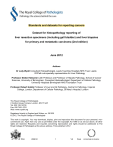 Standards and datasets for reporting cancers Dataset for histopathology reporting of liver resection specimens (including gall bladder) and liver biopsies for primary and metastatic carcinoma (2nd edition) June 2012 Authors Dr Judy Wyatt Consultant Histopathologist, Leeds Teaching Hospitals NHS Trust, Leeds; RCPath sub-specialty representative for Liver Pathology Professor Stefan Hübscher Leith Professor and Professor of Hepatic Pathology, School of Cancer Sciences, University of Birmingham; Consultant Histopathologist, Department of Cellular Pathology, University Hospitals Birmingham NHS Foundation Trust Professor Robert Goldin Professor of Liver and GI Pathology, Centre for Pathology, Imperial College, London; Department of Cellular Pathology, St Mary’s Hospital, London The Royal College of Pathologists 2 Carlton House Terrace, London, SW1Y 5AF Tel: 020 7451 6700 Fax: 020 7451 6701 Web: www.rcpath.org Registered charity in England and Wales, no. 261035 © 2012, The Royal College of Pathologists This work is copyright. You may download, display, print and reproduce this document for your personal, noncommercial use. Apart from any use as permitted under the Copyright Act 1968 or as set out above, all other rights are reserved. Requests and inquiries concerning reproduction and rights should be addressed to The Royal College of Pathologists at the above address. First published: 2012 PSU 200612 1 V5 Final Unique document number G050 Document name Dataset for histopathology reporting of liver resection specimens (including gall bladder) and liver biopsies for primary and metastatic carcinoma Version number 2 Produced by Dr Judy Wyatt, Professor Stefan Hübscher and Professor Robert Goldin, on behalf of the College’s Cancer Services Working Group Date active June 2012 Date for review June 2013 Comments This document supersedes the first edition of Dataset for histopathology reporting of liver resection specimens (including gall bladder) and liver biopsies for primary and metastatic carcinoma, published in 2009. In accordance with the College’s pre-publications policy, this document was put on The Royal College of Pathologists’ website for consultation from 3 April to 1 May 2012. Twenty-one items of feedback were received and the authors considered them and amended the document as appropriate. Please email publications@rcpath.org if you wish to see the responses and comments. Dr Peter Cowling Director of Communications PSU 200612 2 V5 Final CONTENTS 1 Foreword .................................................................................................................................... 5 2 Introduction ................................................................................................................................. 6 3 Clinical information required on the specimen request form ........................................................ 7 4 Preparation of the specimen before dissection............................................................................ 8 5 Specimen handling and block selection ...................................................................................... 9 6 5.1 Hepatectomy and segmentectomy specimens for intrahepatic tumours (includes complete hepatectomy at transplant, hepatocellular carcinoma, intrahepatic cholangiocarcinoma and metastatic tumours) ............................................... 10 5.2 Perihilar cholangiocarcinoma ........................................................................................... 11 5.3 Gall bladder ..................................................................................................................... 11 5.4 Lymph nodes ................................................................................................................... 12 Core data items ........................................................................................................................ 12 6.1 Clinical ............................................................................................................................. 12 6.2 Pathological ..................................................................................................................... 12 6.3 Specific information for individual tumours ....................................................................... 13 6.3.1 Hepatocellular carcinoma ..................................................................................... 13 6.3.2 Cholangiocarcinoma ............................................................................................. 16 6.3.3 Cancer of the gall bladder .................................................................................... 19 6.3.4 Metastatic carcinoma............................................................................................ 19 7 Non-core data items.................................................................................................................. 21 8 Diagnostic coding and staging .................................................................................................. 22 9 Specific aspects of individual tumours not covered elsewhere .................................................. 22 10 Reporting frozen sections ......................................................................................................... 22 11 Reporting of needle biopsy specimens...................................................................................... 23 11.1 Specimen submission ...................................................................................................... 23 11.2 Sectioning and staining .................................................................................................... 23 11.3 Further investigations....................................................................................................... 23 11.4 Report content ..............................................................................