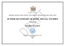 Republic of Zambia MINISTRY OF EDUCATION, SCIENCE, VOCCATIONAL TRAINING AND EARLY EDUCATION JUNIOR SECONDARY SCHOOL SOCIAL STUDIES ZERO -DRAFT GRADES 8 AND 9 Published by the Curriculum Development Centre P.O. Box 50092 Lusaka 2011 1 Copyright © All rights Reserved. No parts of this syllabus may be produced, stored in a retrieval manner, transmitted in any means without the prior consent of the copyright owner. 2 Table of Content Preface …………………………………………………………………………… Acknowledgements ……………………………………………………………… General Outcomes ……………………………………………………………….. Methodology …………………………………………………………………….. Scheming ………………………………………………………………………… Lesson Plan ……………………………………………………………………… Time Allocation …………………………………………………………………. 3 PREFACE This Integrated Social Sciences Syllabus has been prepared against the background of Educational reforms. It takes into account the new structure of the School Curriculum. It is an aspect of both the Educational Reform and Curriculum implementation. It attempts to meet the requirements of the Reform. One other thing which is significant in the syllabus is the provision of carefully planned and sequenced topics, sub-topics, outcomes and content. The subjectmatter covering knowledge, skills and values is blended in an integrated approach. The strongest point about this syllabus is that learning experiences start from KNOWN to UNKNOWN. The learner, therefore, is first well introduced to THINGS around him/her. In this way the learner interacts with, and experiences both the immediate and distant communities and environments, all of which centre around local, regional, Africa and global context. These specific outcomes provide the bases for achieving the aims of basic knowledge, skills, methods and strategies such as collecting data, organisation of materials and interpretation. Above all, it aims at inculcating values such as social interaction, decision making. To achieve all these, teaching/learning processes will require practicals, dramatisations, projects and field visits. The syllabus focuses on the ability to acquire knowledge, skills and values needed to develop positive and desirable attitudes; the potential to tackle challenges posed by political, cultural, social and economic needs and factors. In this way, the syllabus contributes to the TOTAL DEVELOPMENT OF THE INDIVIDUAL, THE COMMUNITY AND SOCIETY BOTH IN THE IMMEDIATE AND DISTANT FUTURE. CURRICULUM DEVELOPMENT CENTRE LUSAKA 4 ACKNOWLEDGEMENTS The members of staff of the Social Sciences Department and members of the Social Sciences Curriculum Committee of the Curriculum Development Centre are indebtedness to the teachers, college lecturers and the standard officers of the Ministry of Education, Science, Vocational Training and Early Education for their professional contributions to the production of this syllabus. The members also register their thanks to the following: Mr. P K Kasaji, Chief Curriculum Specialist, Curriculum Development Centre, Lusaka Mr. L B Y Kalirani, Principal Curriculum Specialist, Social Sciences Faculty, Curriculum Development Centre, Lusaka Mr. G B Nsama, Senior Curriculum Specialist, Social Sciences Faculty, Curriculum Development Centre, Lusaka Mrs. B M Hamwiinga, Curriculum Specialist, Civic Education, Social Sciences Faculty, Curriculum Development Centre, Lusaka Mr. D S Mwiinga, Curriculum Specialist, History, Social Sciences Faculty, Curriculum Development Centre, Lusaka Mr. D P Kasungami, Curriculum Specialist, Zambian Languages, Languages Faculty, Curriculum Development Centre, Lusaka Mrs. F Shamputa, Senior Curriculum Specialist, Editorials, Curriculum Development Centre, Lusaka Mr. C Moonga, Lecturer, Nkrumah University, Kabwe Mr. J Lungu, Teacher, Chizongwe Secondary School Thanks are also extended to the Typing Staff of the Ministry of Education, Science, Vocational Training and Early Education Headquarters for working tirelessly and patiently in order to produce this document. 5 INTRODUCTION The term “Integrated Social Science” is here used to identify a new study area that has been introduced at junior secondary school level (Grades 8 and 9). It does not denote a political school of thought, a philosophy, a doctrine or a form of organisation. It only refers to this new learning area on human relationships and behaviour. It is an inter-disciplinary programme with a contemporary orientation incorporating some aspects of Civic Education, Geography and History that were previously taught as separate subjects in the former curriculum. Education in Zambia as well as elsewhere is deemed to be the vehicle through which a morally, democratic learner should be developed. Thus, Integrated Social Science is expected to be the mirror through which the Zambian society should see itself in its quest and dedication to promote and perpetuate its social skills, beliefs, values and traditions. Some educators believe that some subjects such as mathematics, natural sciences and languages are more important and intellectually challenging than others like History and Geography. While no one can deny the fact that scientific and technological advances are crucial to human survival, one cannot also deny the fact that many of these advances can threaten human survival by scientists without social skills and conscience. They are likely to utilise instruments of science and technology advances to exploit and suppress other human beings rather than their betterment. To avoid such human self-exploitation or destruction, Integrated Social Science has to be taught, because it is one principal means to prepare any learner to accept one’s so