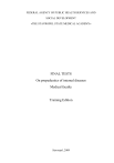 FEDERAL AGENCY OF PUBLIC HEALTH SERVICES AND SOCIAL DEVELOPMENT «THE STAVROPOL STATE MEDICAL ACADEMY» FINAL TESTS On propedeutics of internal diseases Medical faculty Training Edition Stavropol, 2009 Propaedeutics of internal diseases (Final tests) The methodical publication for students of 3 course of medical faculty under the general edition of Chair of propaedeutics of internal diseases of medical faculty, D.M.S., professor Pavlenko V.V. Stavropol, StGMA, 2009, 82p. Composers: The senior lecturer of chair PID, k.m.s. Zhurbina N.V., The assistant of chair PID Aleksandrova S.B., The assistant of chair PID Dragoman E.A. The methodical publication presents final tests on all sections of propaedeutics of internal diseases for the final knowledge estimation of students 3 course of medical faculty. Final tasks are made including the tests, produced by the Volgograd state medical university, having a signature stamp «UMO». Final tests are supplied by answers. Final tests. 1. Give the description of «facies nephritica»: A) A face is bloated, cyanotic; sharp swelling of veins of the neck, marked cyanosis and neck edema is observed B) Marked cyanosis of lips, a nose tip, a chin, ears and cyanotic blush of cheeks is observed C) A face is deathly pale with a grayish shade, eyes are sunken, the nose is pinched, there are drops of profuse sweat on a forehead D) A face is bloated, pale, there are swollen eyelids and edema under eyes, the eye-slits are narrow I) A face is bloated, yellowish and pale with marked cyanotic shade, a mouth is constantly half-opened, lips are cyanotic, eyes are sticking together and dim. 2. What is the reason of occurrence of pleural rub murmur? A) Small amount of an exsudate or transudate in alveoluses B) Inflammation of pleura leaves («dry» pleurisy) С) Alveoluses are completely filled by exsudate or transudate D) Viscous sputum in large bronchi E) Viscous sputum in fine bronchi and (or) their spasm. 3. What percussion sound occurres at the initial stage of an inflammation? A) Dull or blunted sound B) The clear pulmonary sound C) The tympanic sound D) Dullness with a tympanic shade E) The bandbox sound. 4. Choose the most correct conclusion for the data of a palpation – the expressed cardiac beat and epigastric pulsation: A) Hypertrophy of the left ventricle without its expressed dilatation B) Hypertrophy and dilatation of the left ventricle C) Hypertrophy and dilatation of the right ventricle D) Adnation of pericardium leaves (adhesive pericarditis) E) Postinfarction aneurysm of the front wall of the left ventricle. 5. Specify the most typical changes of a thorax at the obturative atelectasis: A) Reduction of half of thorax, its retraction and backlog in breath B) Backlog in breath, enlargement of half of thorax and deletion of intercostal spaces C) Only backlog of half of thorax in breath D) Hypersthenic chest E) Enlargement of front-back and transverse sizes of a thorax, indrawing of intercostal spaces in lower- lateral portions from both sides. 6. Explain the reason of decrease of the skin turgor, revealed at the general survey: A) Hemorrhagic syndrome B) Organism dehydration C) Hyperestrogenemia D) Sideropenic syndrome E) Disturbance of synthetic function of a liver. 7. Specify the most typical changes of a thorax at inflammatory consolidation of a lung lobe: A) Reduction of a half of thorax, its retraction and backlog in breath. B) Backlog in breath, enlargement of half of thorax and deletion of intercostal spaces C) Only backlog of half of thorax in breath D) Hypersthenic chest E) Enlargement of front-back and transverse sizes of a thorax, indrawing of intercostal spaces in lower- lateral portions from both sides. 8. How are the pathological rhythms, represented on cardiophonography, called? A) Protodiastolic “gallop” B) “Quail” rhythm C) Summatic “gallop” D) Presystolic “gallop” E) Systolic “gallop” 9. What methods can reveal a dilatation of ventricles? a) heart palpation; b) heart percussion; c) ECG; d) EchoCG. Choose a correct combination of answers: A) a,c,d B) b,d C) c,d D) a,b,c,d E) a,b,d. 10. Specify the most typical changes of a thorax at the closed pheumothorax: A) Reduction of a half of thorax, its retraction and backlog in breath B) Backlog in breath, enlargement of half of thorax and deletion of intercostal spaces C) Only backlog of half of thorax in breath D) Hypersthenic chest E) Enlargement of front-back and transverse sizes of a thorax, indrawing of intercostal spaces in lower- lateral portions from both sides. 11. The patient has daily fluctuations of body temperature from 37,0C up to 39,0С. Specify the type of temperature curve: A) febris intermittens B) febris remittens C) febris hectica D) febris continua E) febris reccurens. 12. Explain the reason of concave nail, revealed at the general survey: A) Hemorrhagic syndrome B) Organism dehydration C) Hyperestrogenemia D) Sideropenic syndrome E) Disturbance of synthetic function of a liver. 13. Give the description of “Korvizar’s face” A) A face is bloated, cyanotic; sharp swelling of the neck veins, marked cyanosis and neck edema is observed B) Marked cyanosis of lips, a nose tip, a chin, ears and cyanotic blush of cheeks is observed C) A face is deathly pale with a grayish shade, eyes are sunken, the nose is pinched, there are drops of profuse sweat on a forehead D) A face is bloated, pale, there is edema under eyes and swollen eyelids, the eyeslits are narrow E) A face is bloated, yellowish and pale with marked cyanotic shade, a mouth is constantly half-opened, lips are cyanotic, eyes are sticking together and dim. 14. What basic respiratory murmur is most often sounded at narrowing of small bronchi? A) Weakened vesicular respiration B) Amphoric respiration C) Bronchial respiration D) Rough respiration E) Mixed bronchus-vesicular respiration. 15. Specify the most typical changes of a thorax at the fibrothorax (fusion of a pleural cavity): A) Reduction of a ha